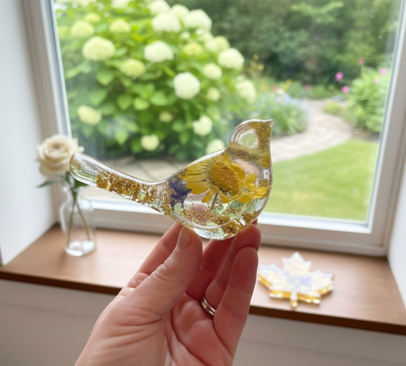 Unlike fresh bouquets, our Boreal Birds, Floral Jewelry, and Keepsakes stay in bloom for a lifetime. Each piece is UV‑resistant and set in glass‑like resin so your memories never fade.