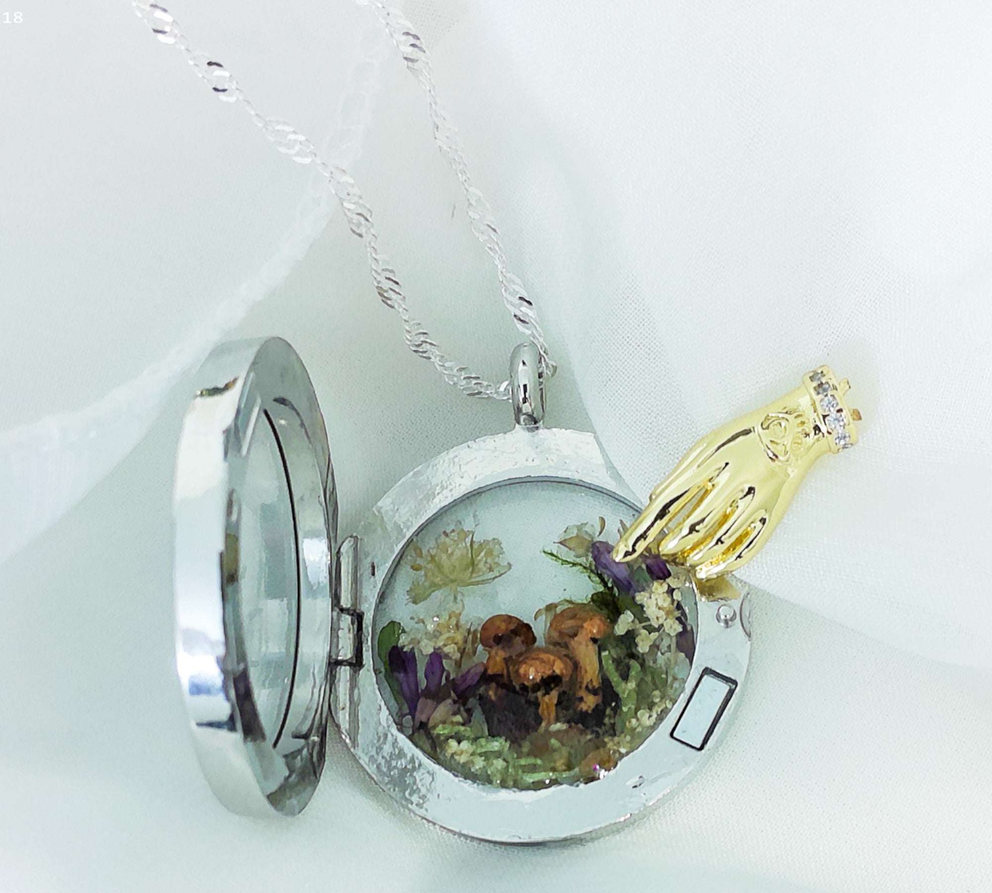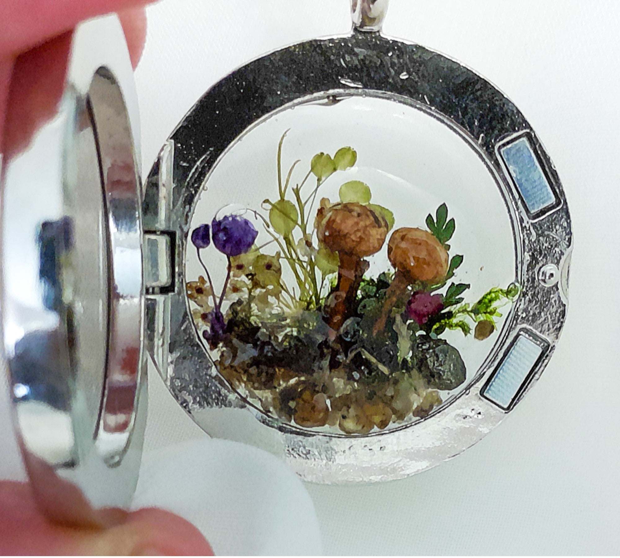 Each pendant holds foraged native botanicals layered into a tiny woodland you can open, touch, and explore.