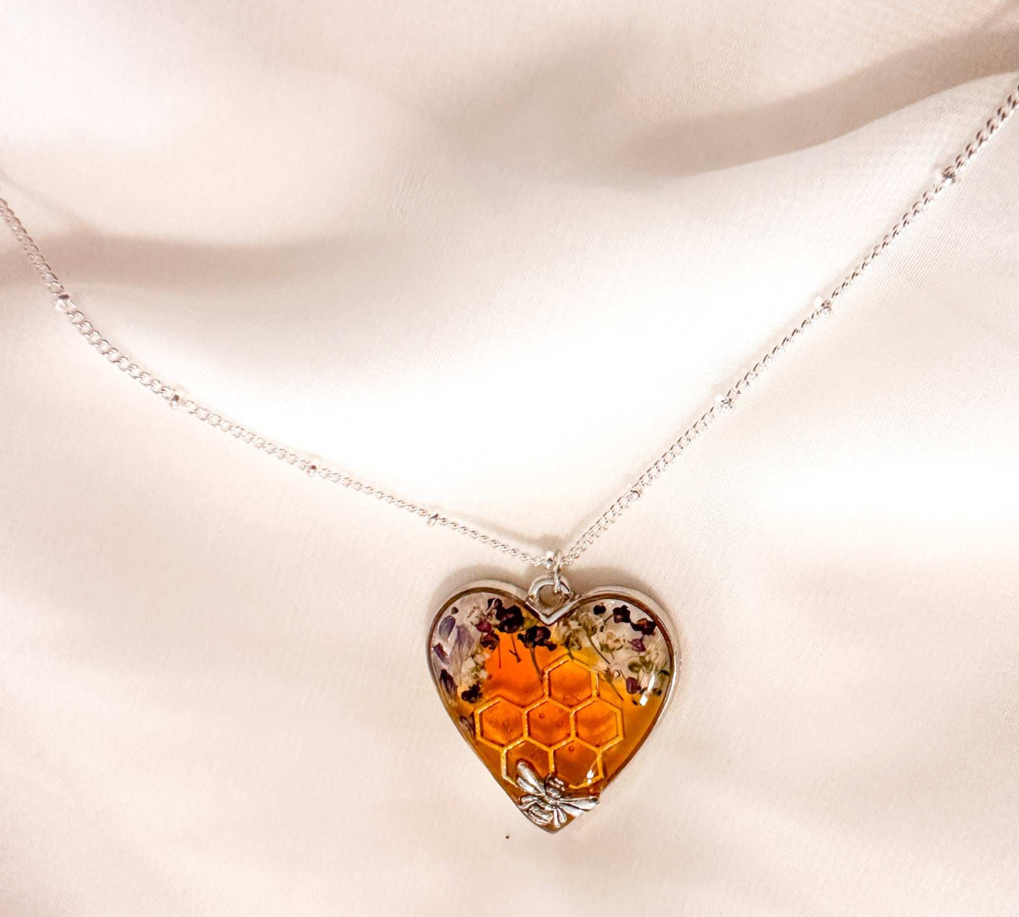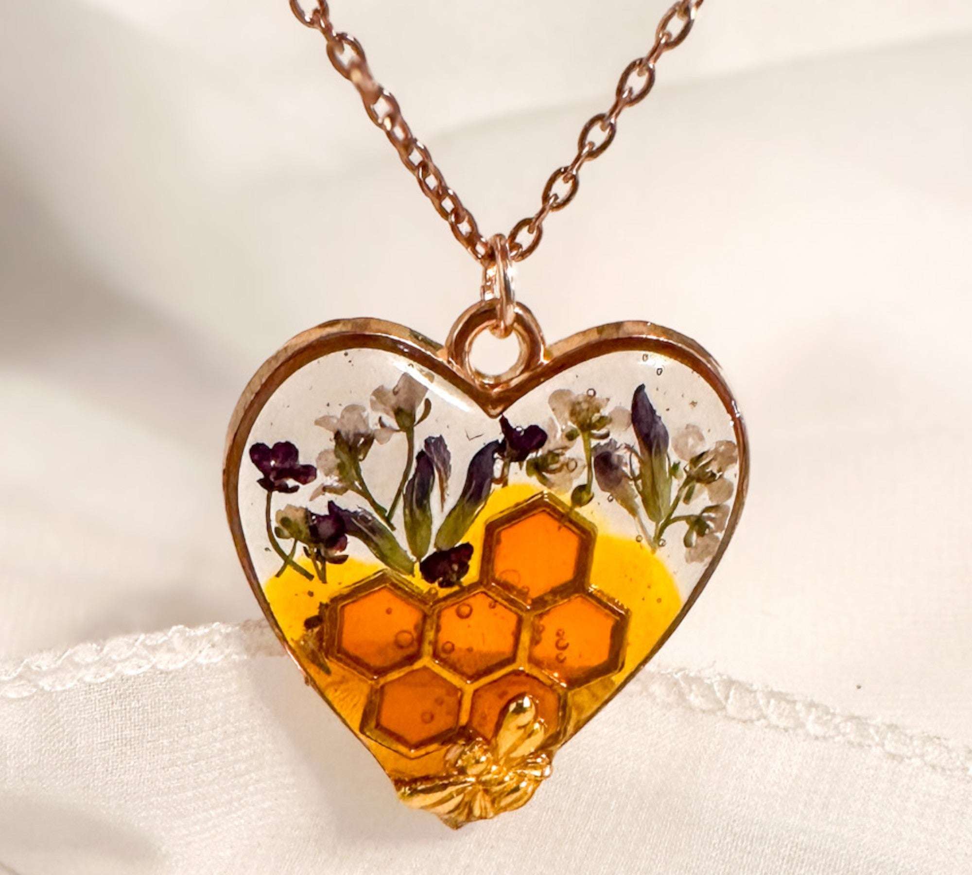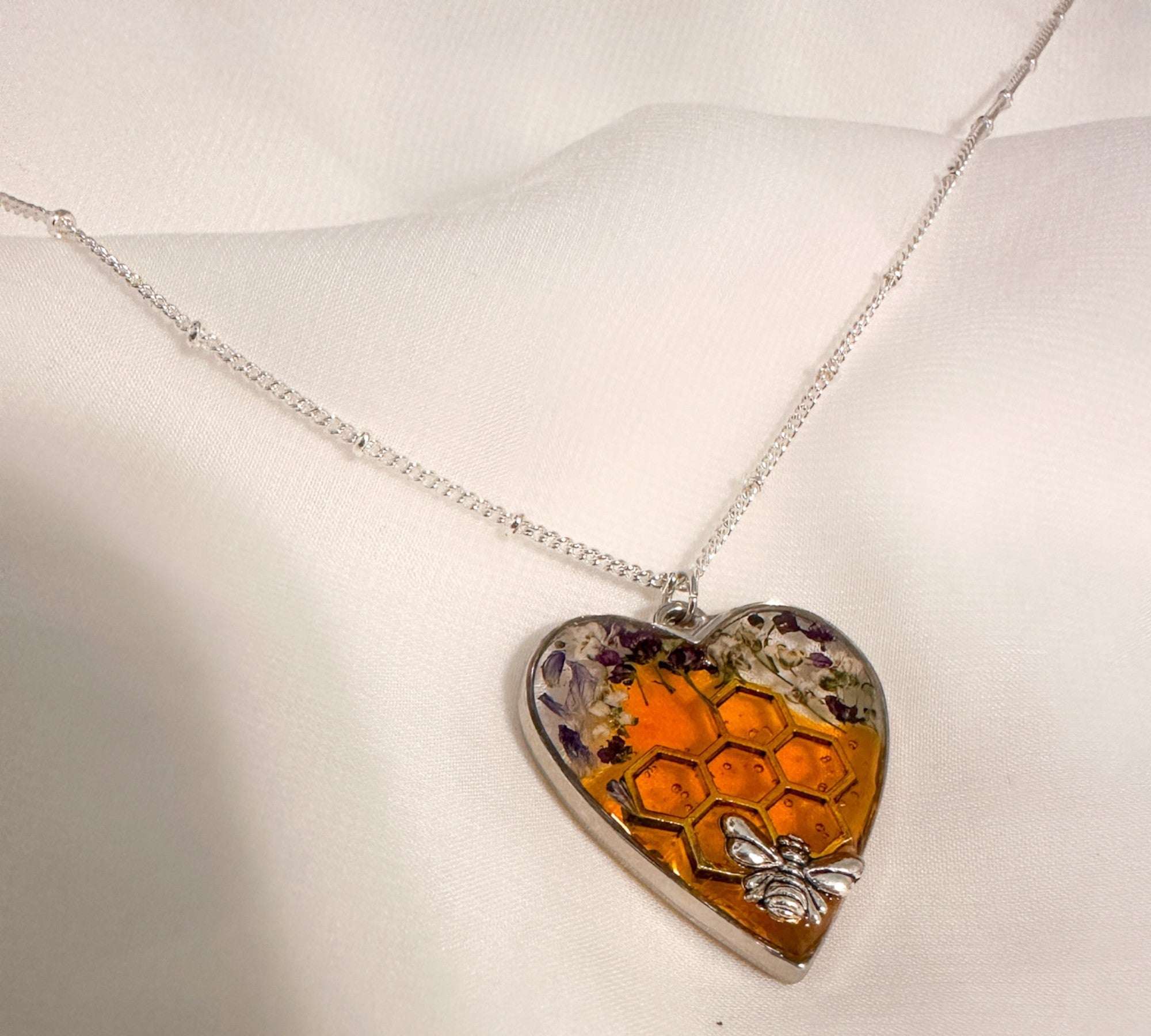 Bee Pendant - Blossom Buzz Harmony Heart - Handmade with Resin & Dried Flowers