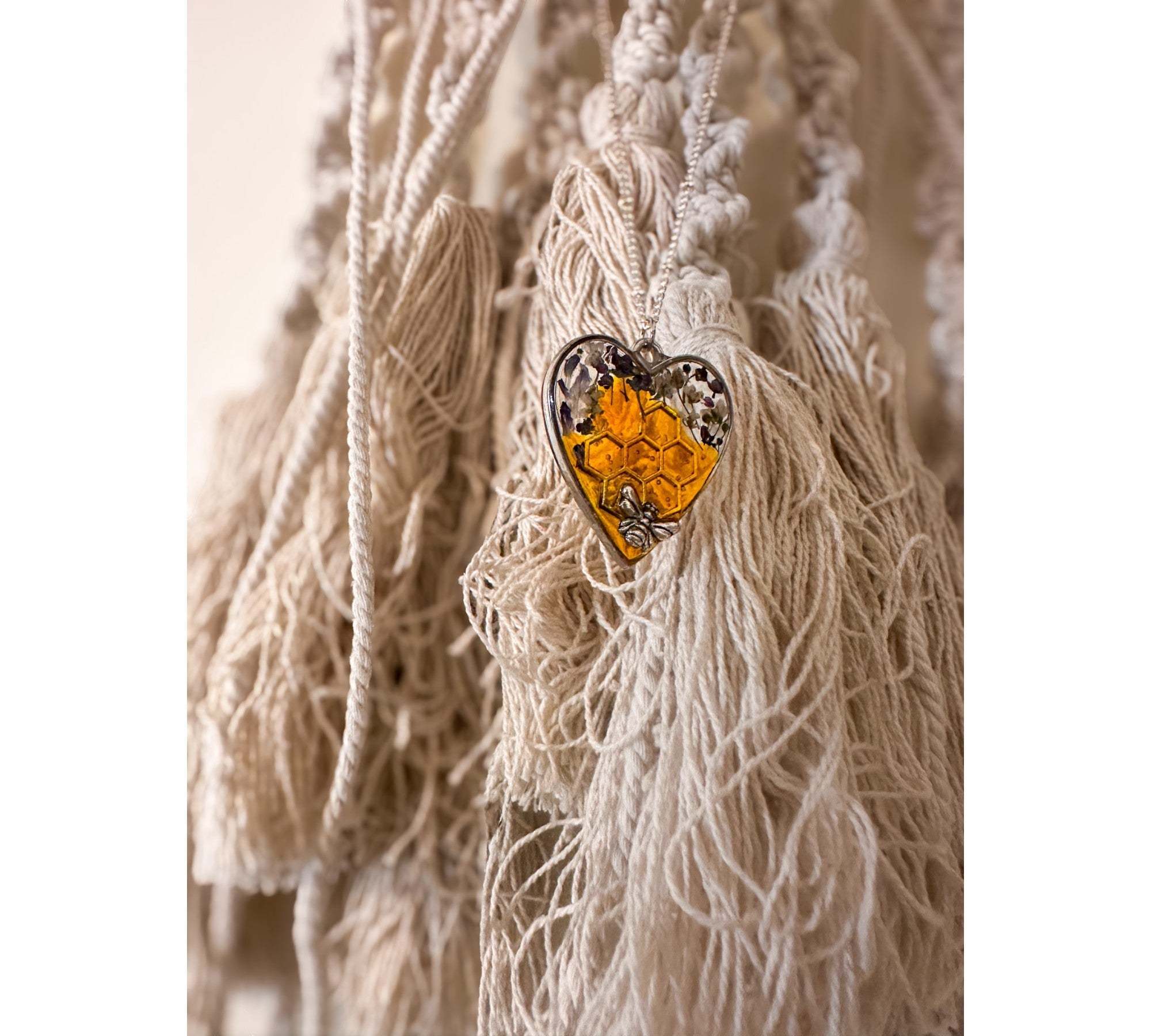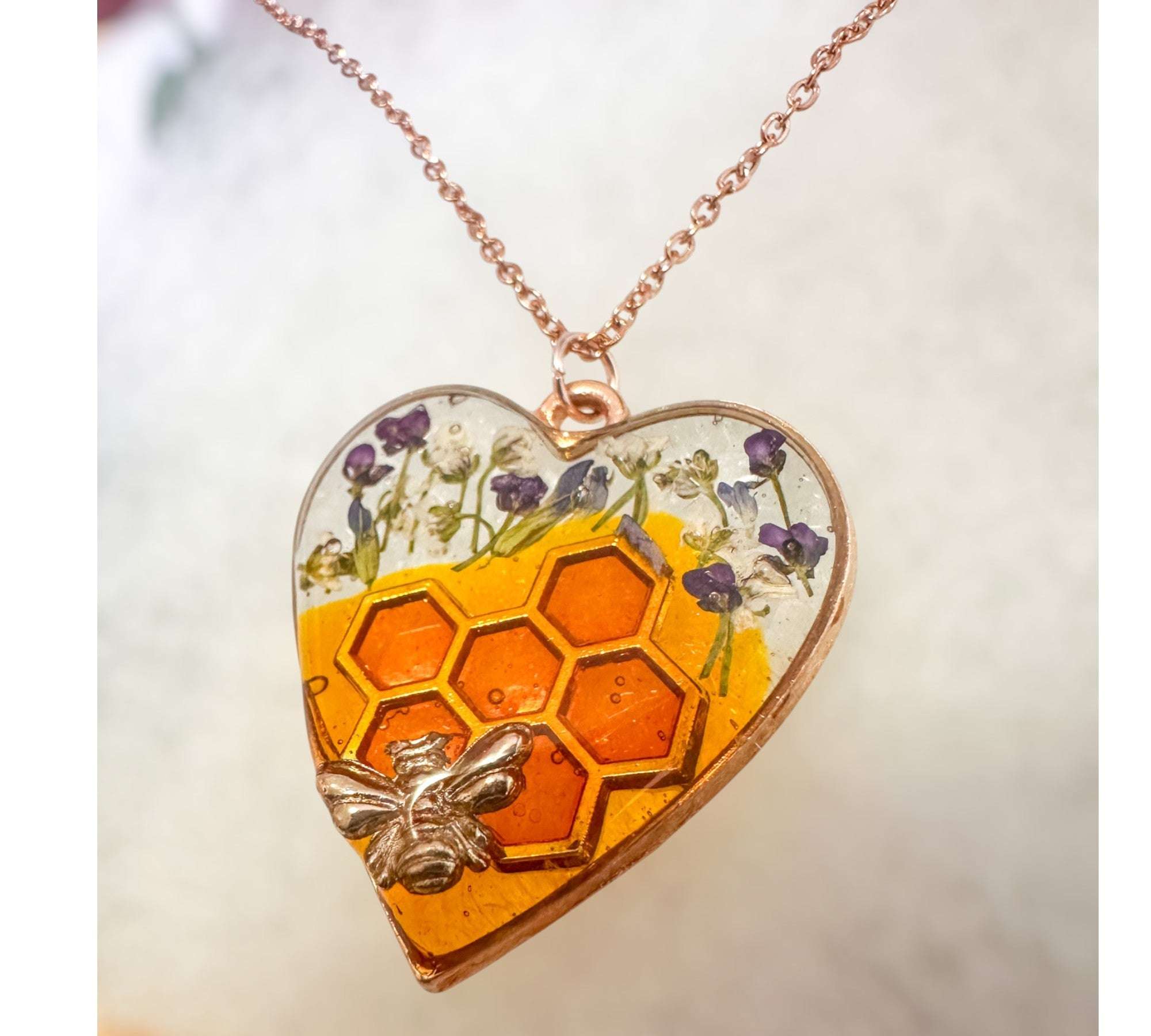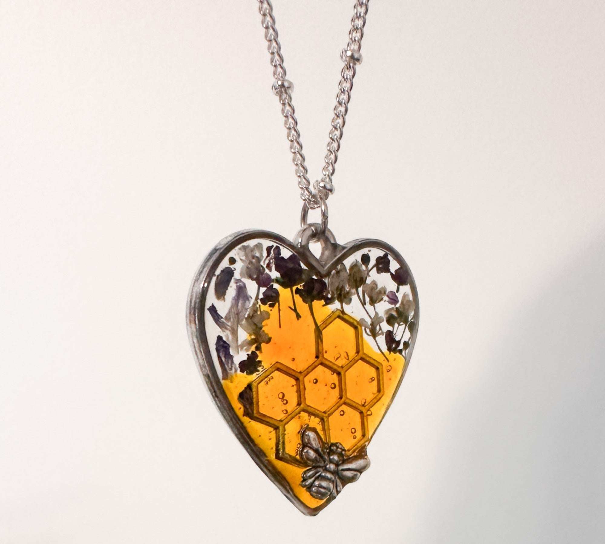 Bee Pendant - Blossom Buzz Harmony Heart - Handmade with Resin & Dried Flowers