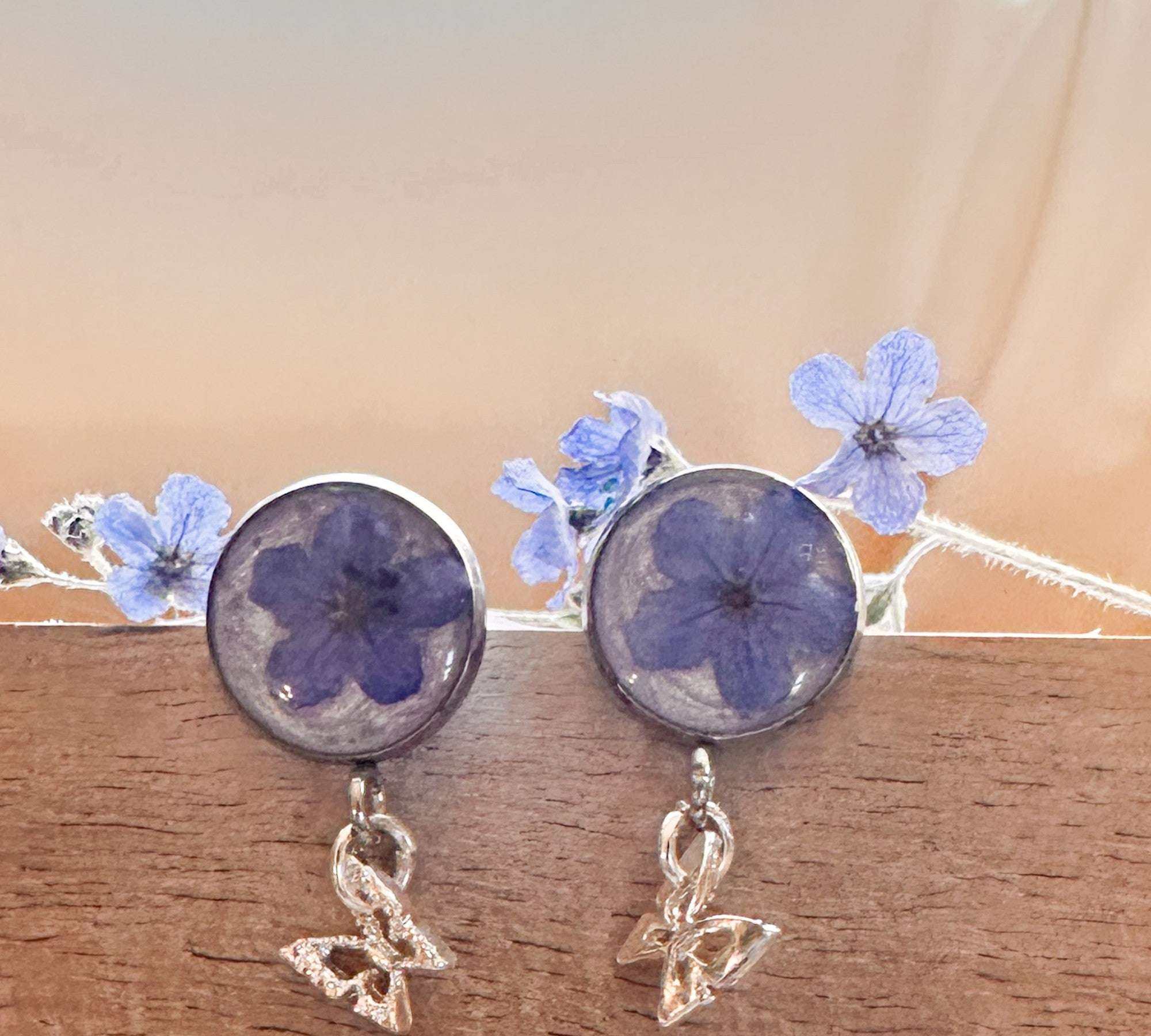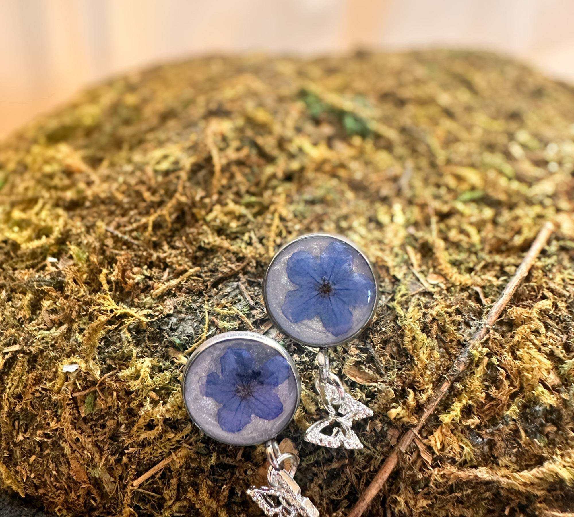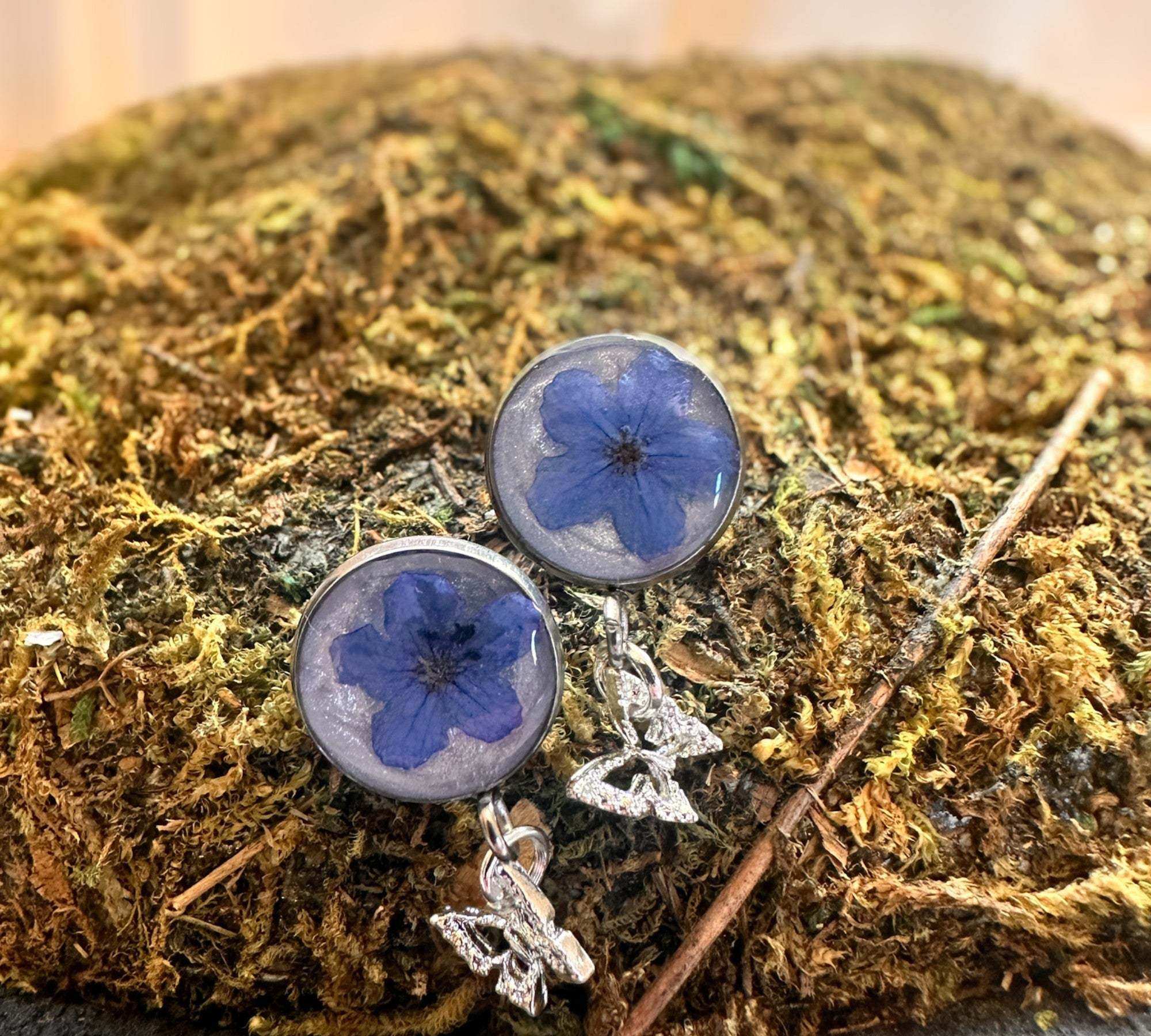 Forget-Me-Not Butterfly Resin Stud Earrings–Handmade with Real Flowers