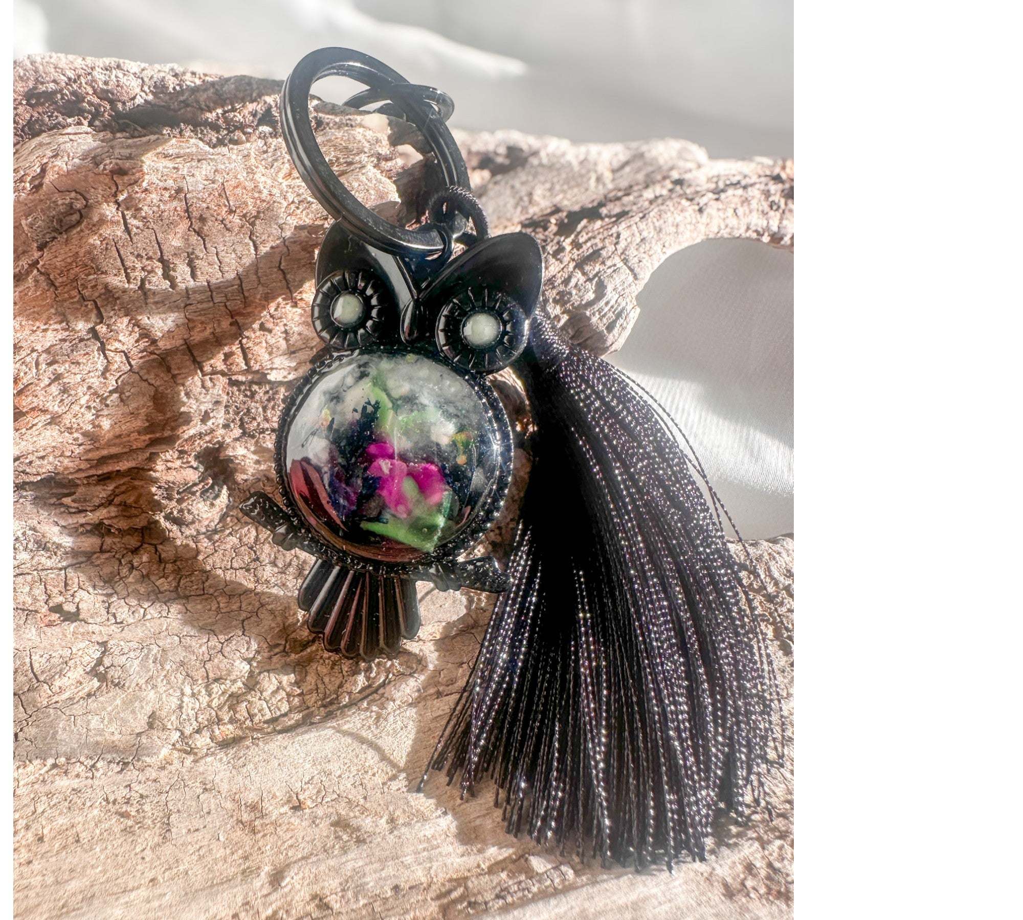 • One-of-a-kind patterning in both the resin and botanicals, so no two owls are ever exactly the same.