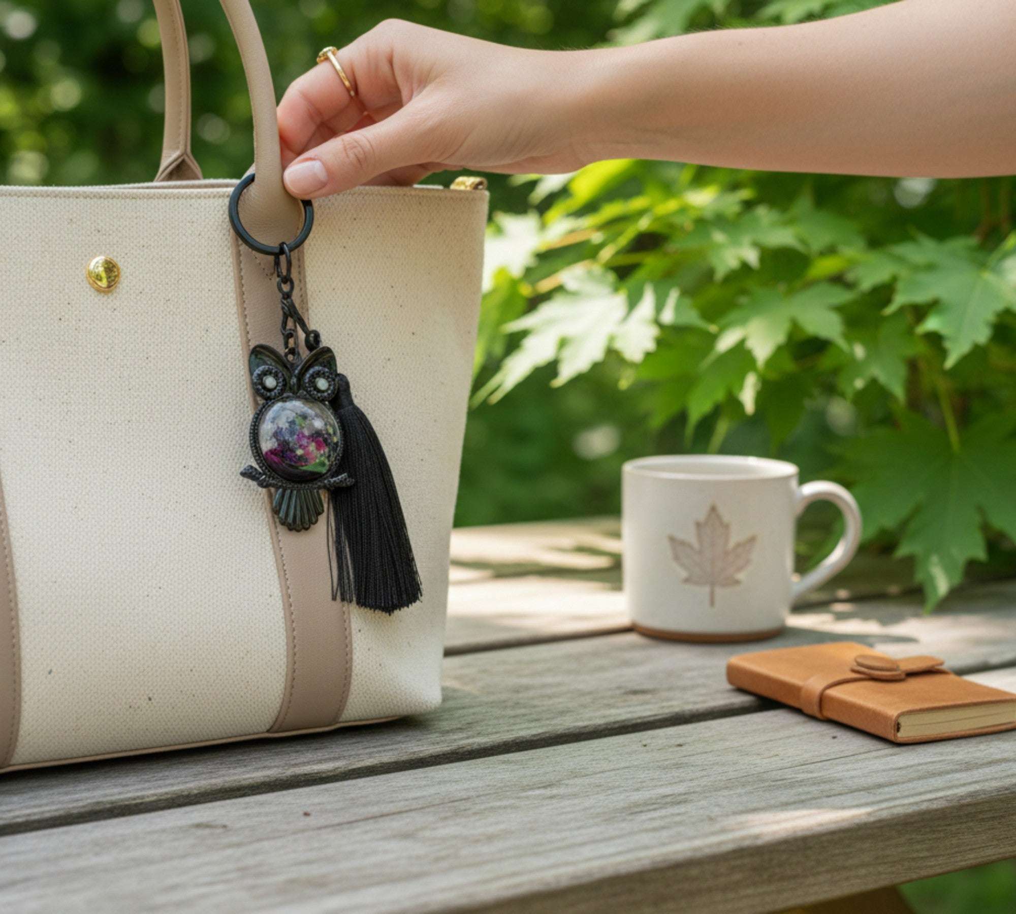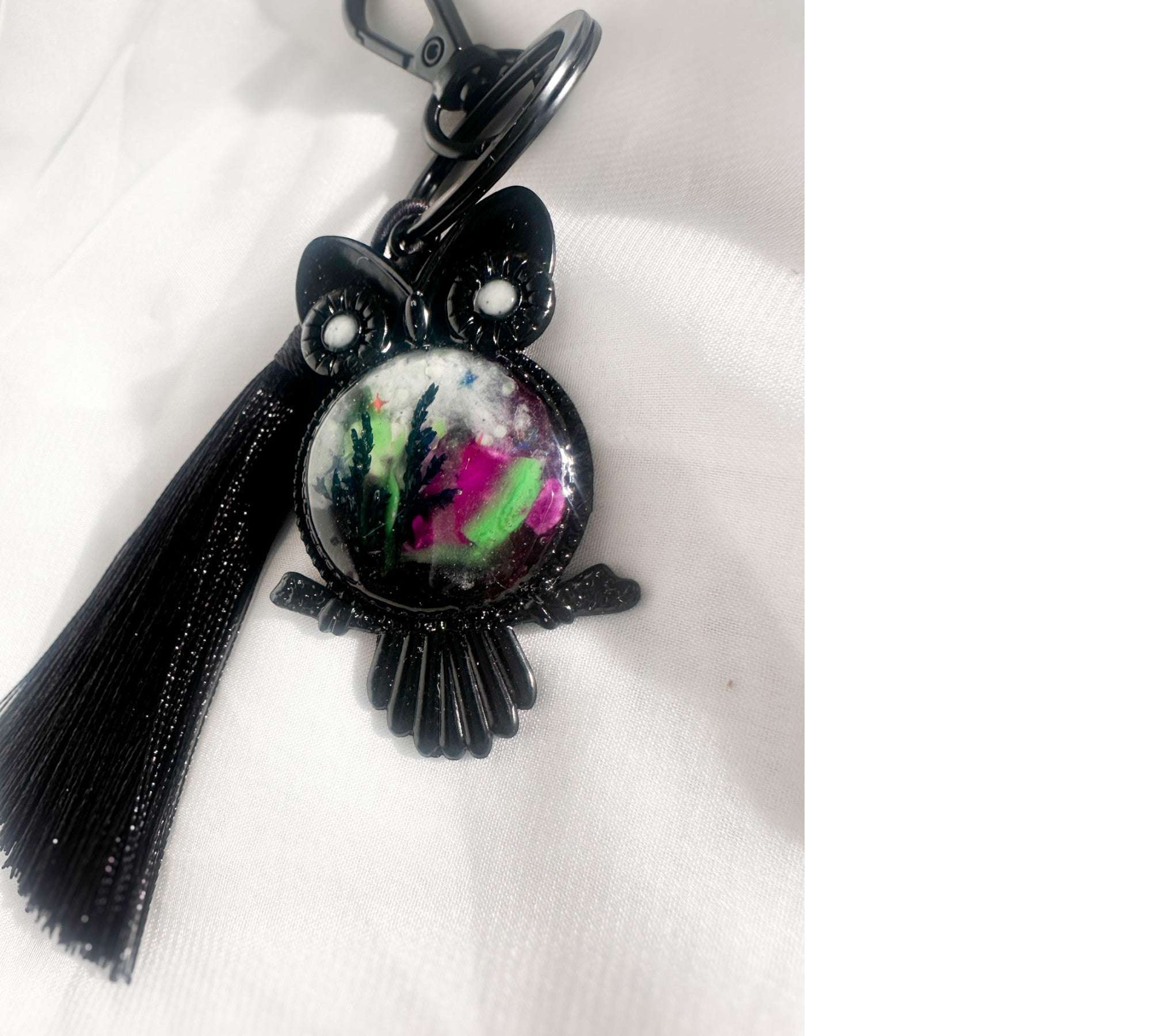 Close-up of handmade owl bag charm showing Northern Lights resin cabochon with pressed ferns