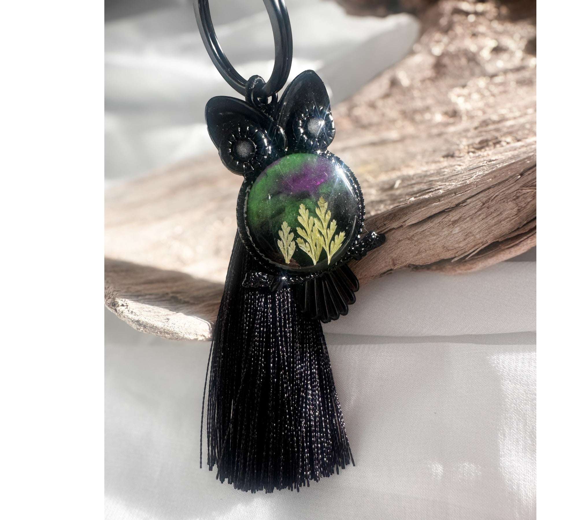 Butterfly keychain with green tassel on a floral-patterned fabric background