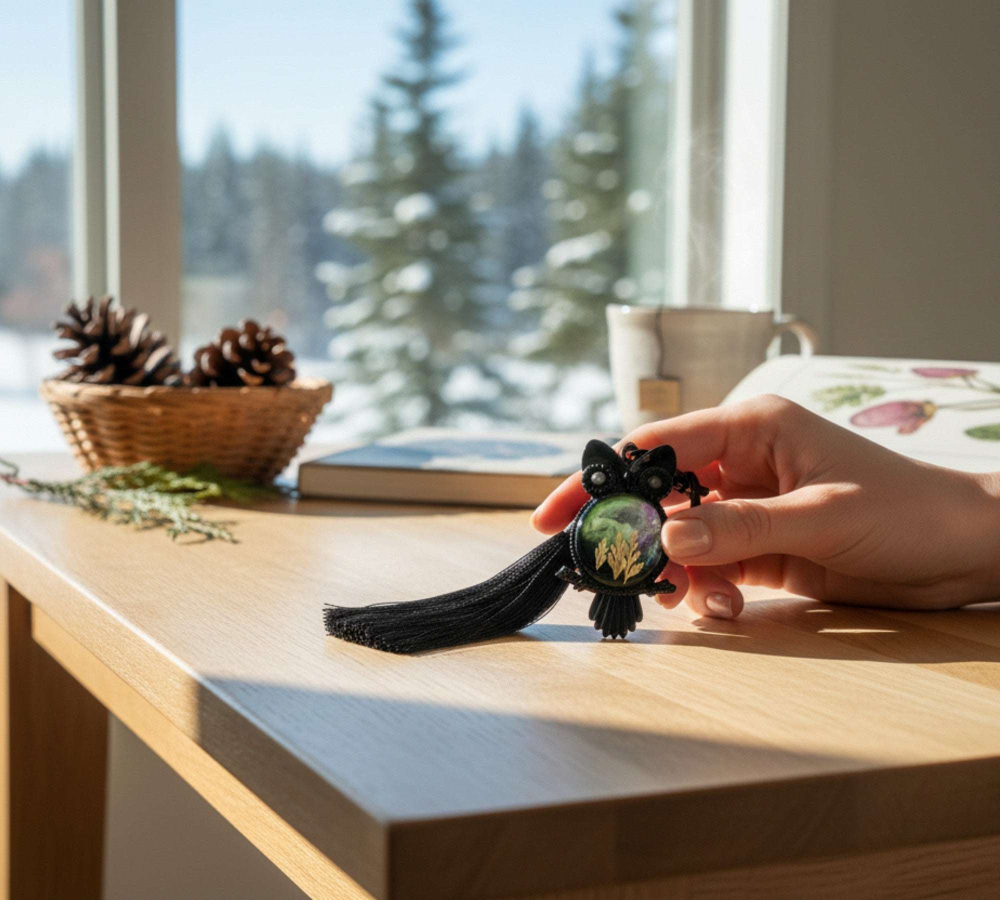 These Owls are for anyone who feels at home under a big northern sky. The owl design, paired with real pressed ferns and a luxurious black tassel, brings a touch of quiet forest magic to your everyday routine.