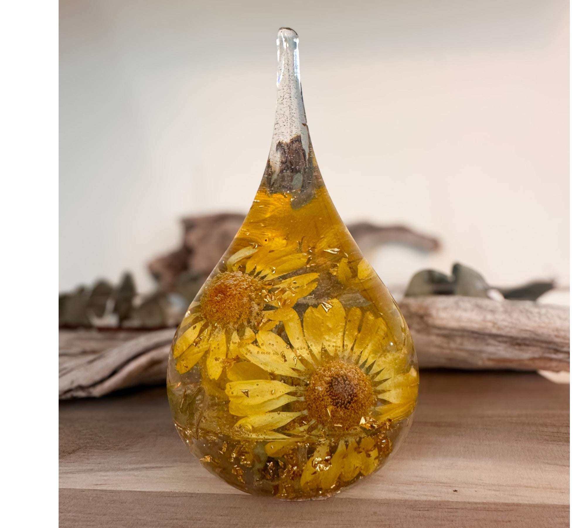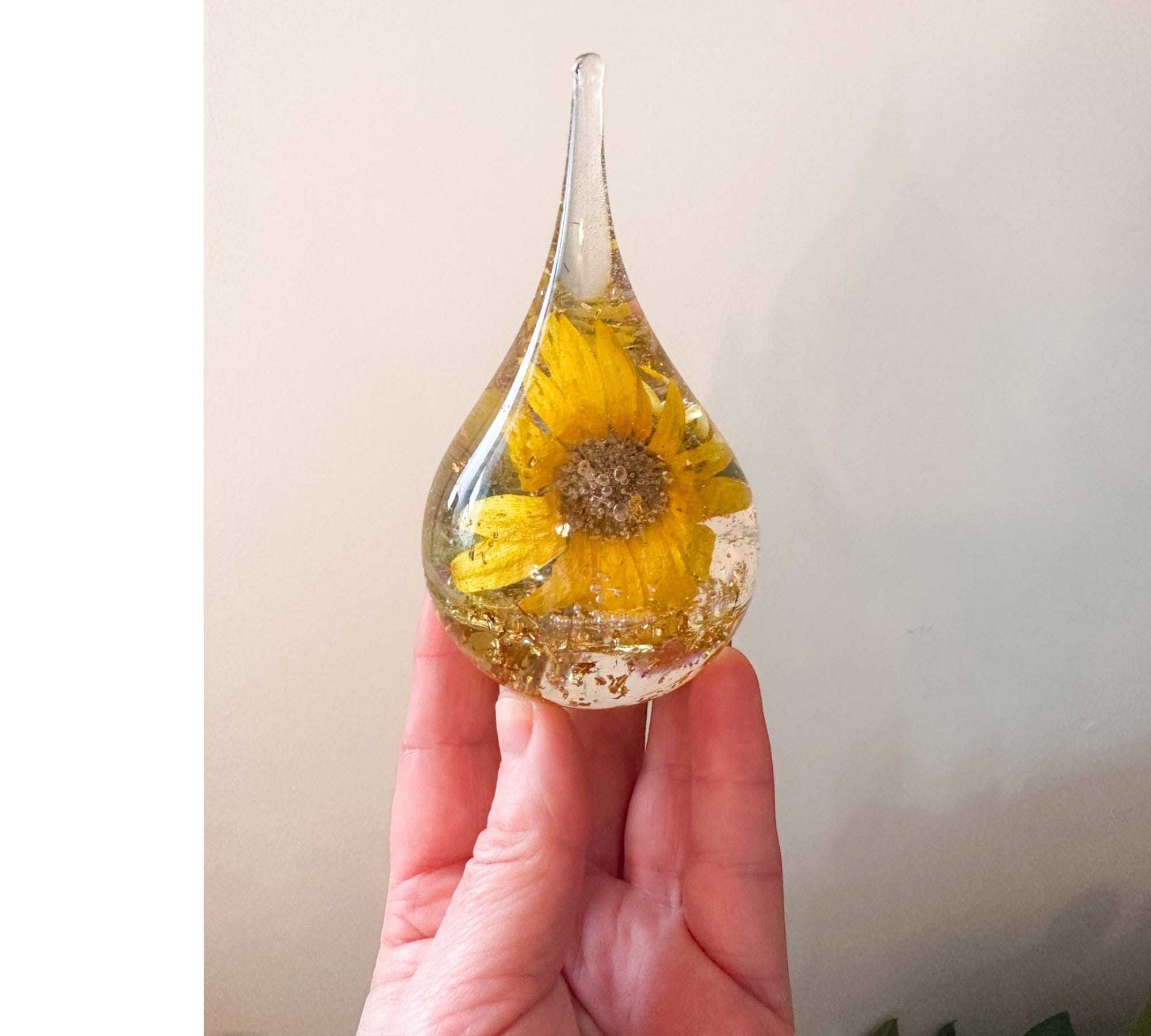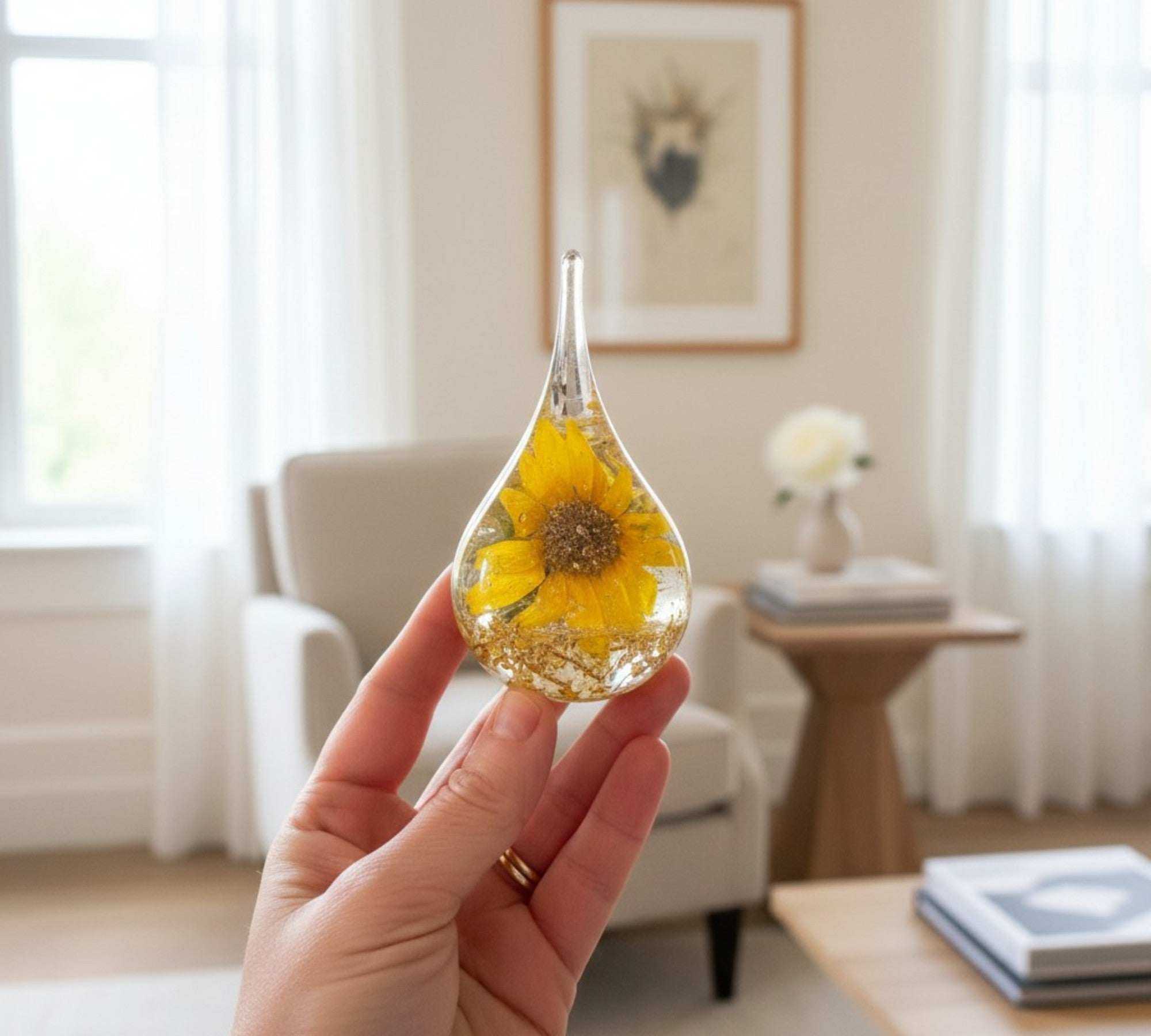 These pieces look most magical when they catch the light! A windowsill, mantel, or bookshelf is perfect. While our resin is high-quality and UV-resistant, we recommend avoiding 24/7 direct, intense sunlight to keep the natural botanical colors vibrant for as long as possible.