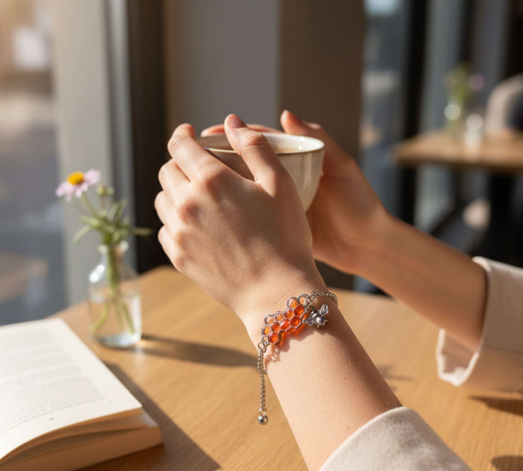 Person's hand with a bracelet on a wooden table with a notebook and mug.