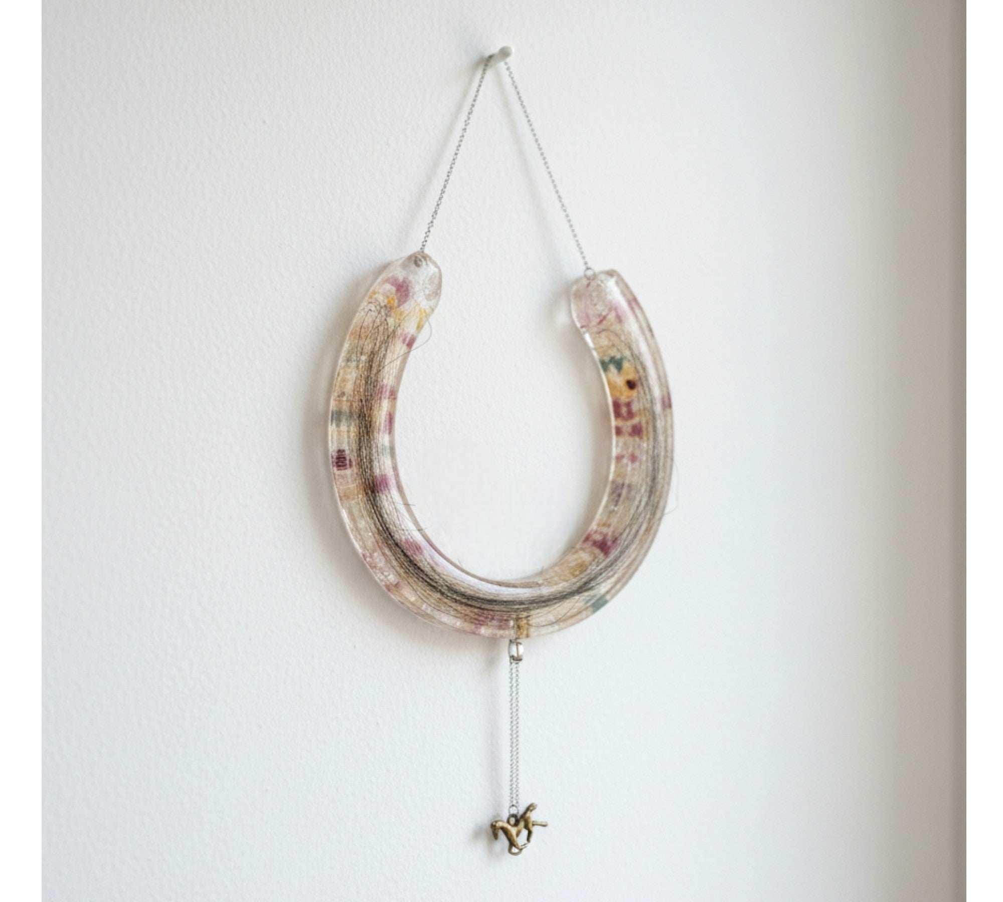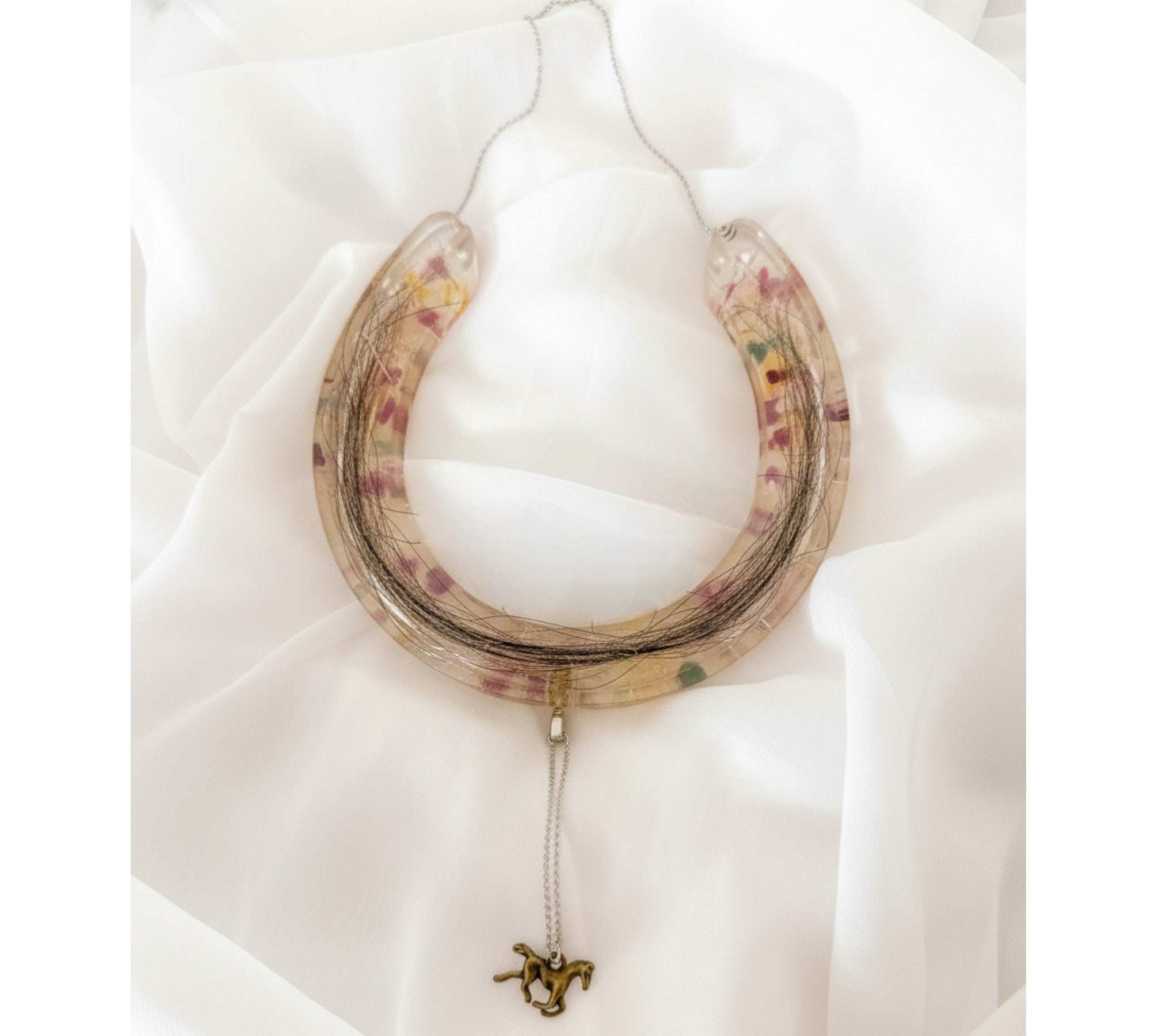 Hand-poured in professional-grade resin, this horseshoe-shaped portal is designed to hold a lock of your horse’s own hair, woven together with your choice of delicate Field botanicals or vibrant flowers.