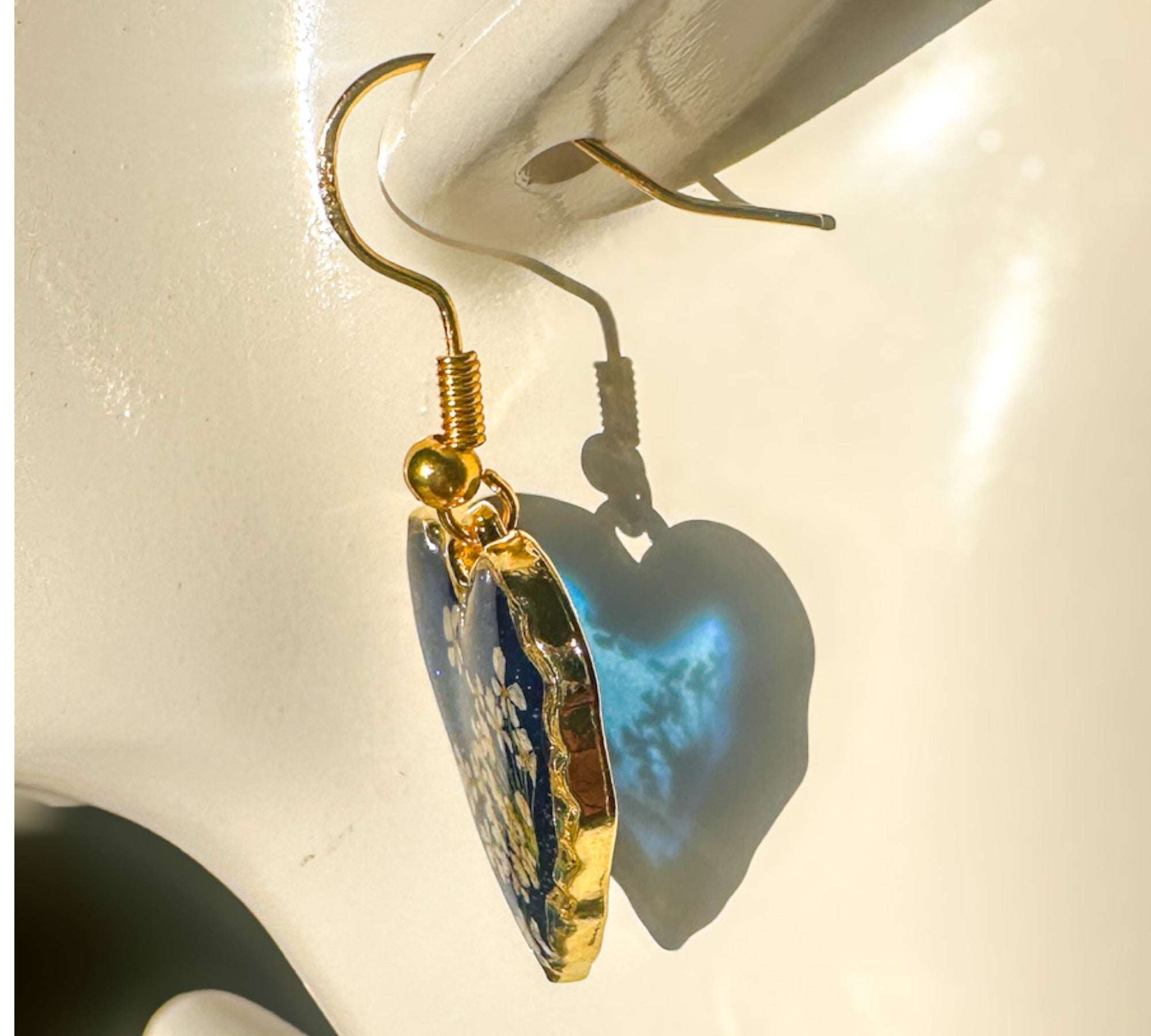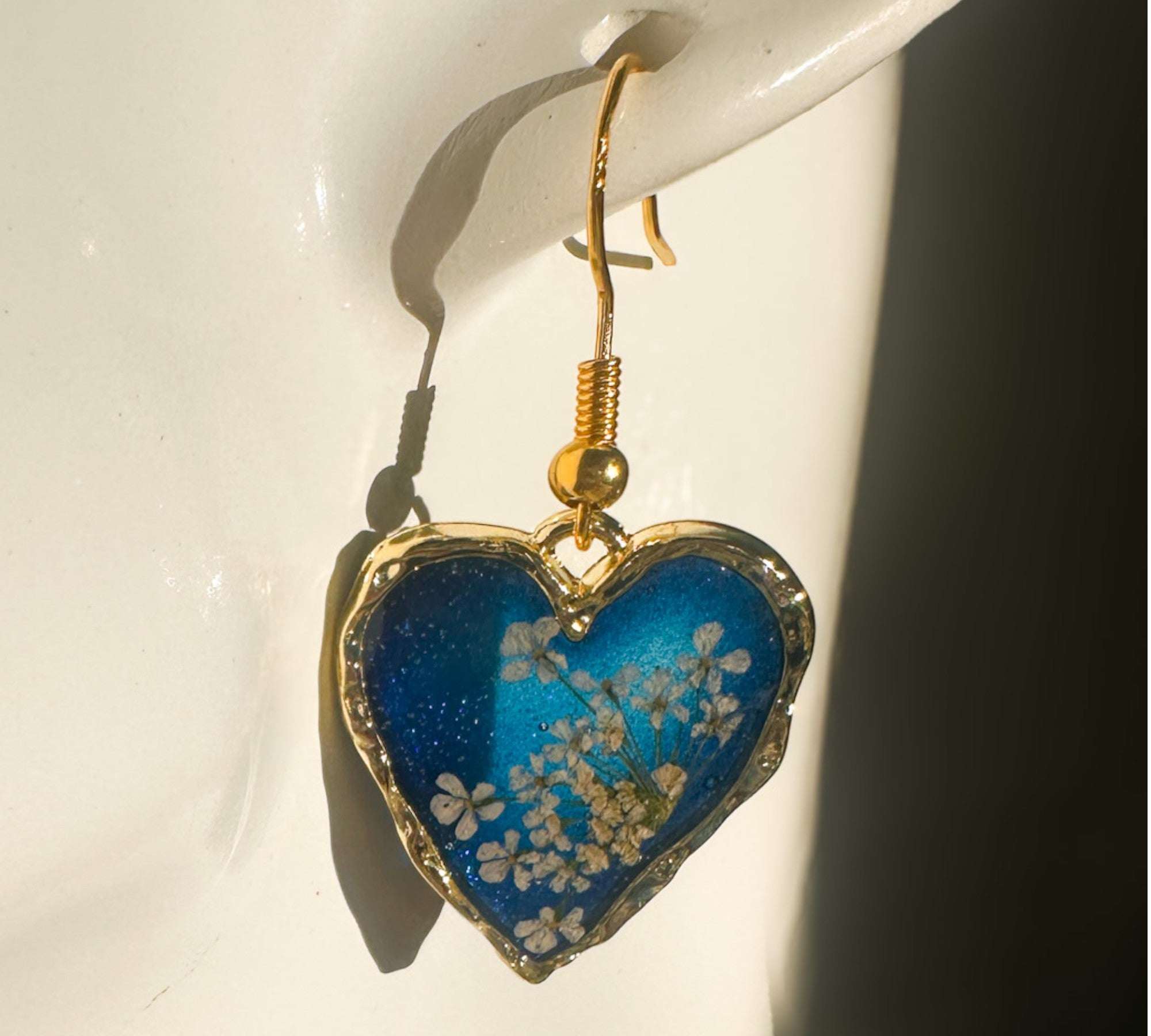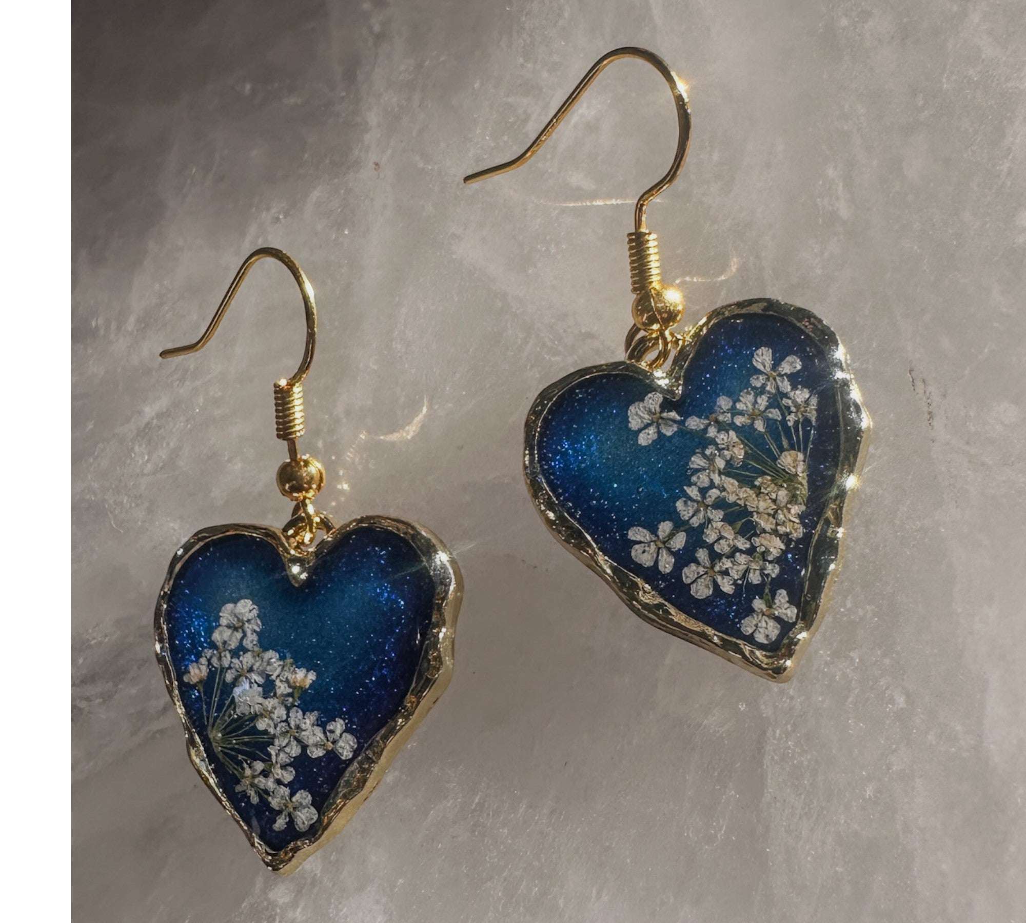 Midnight Lace Hearts | Real Queen Anne's Lace & Navy Resin Earrings