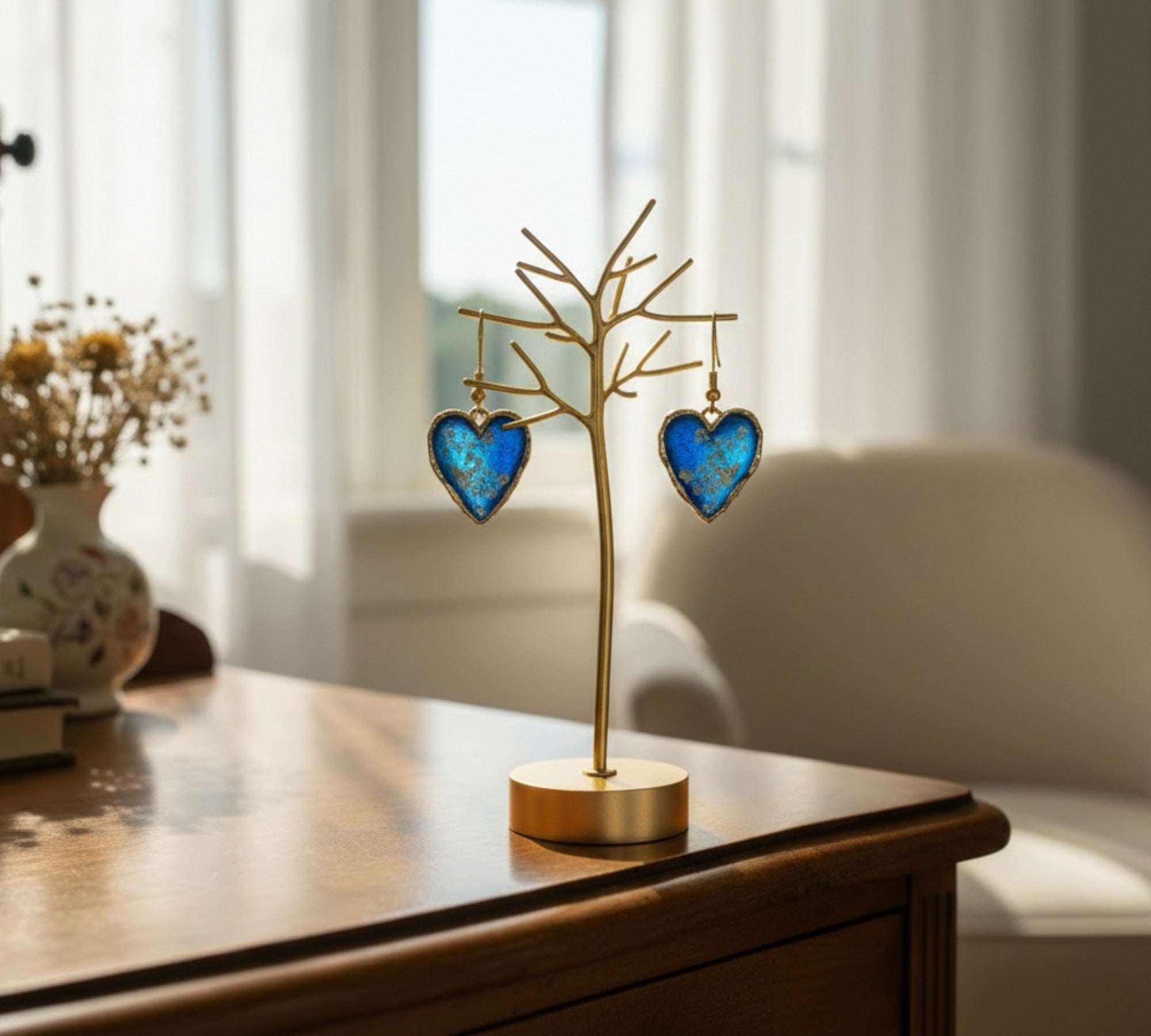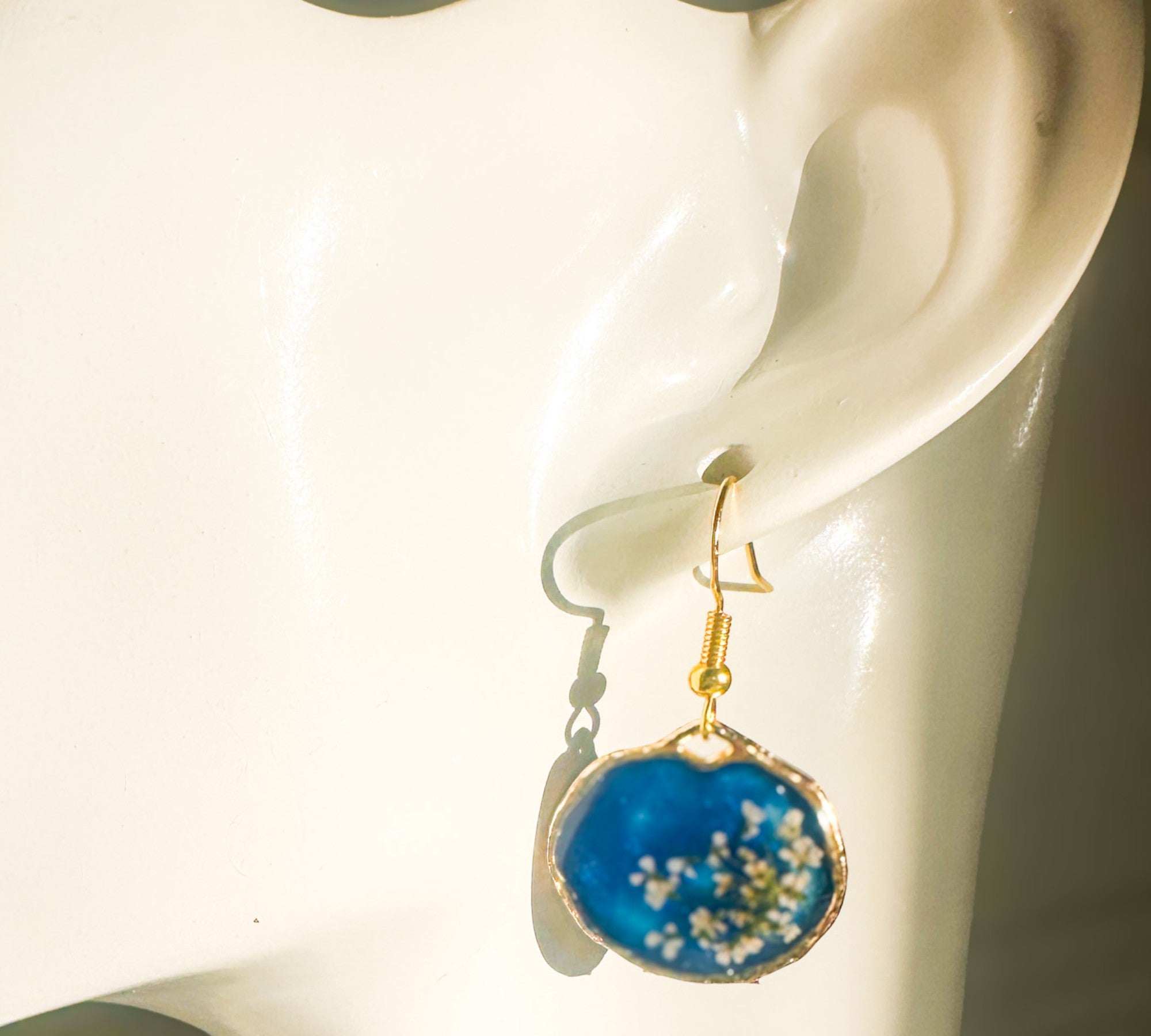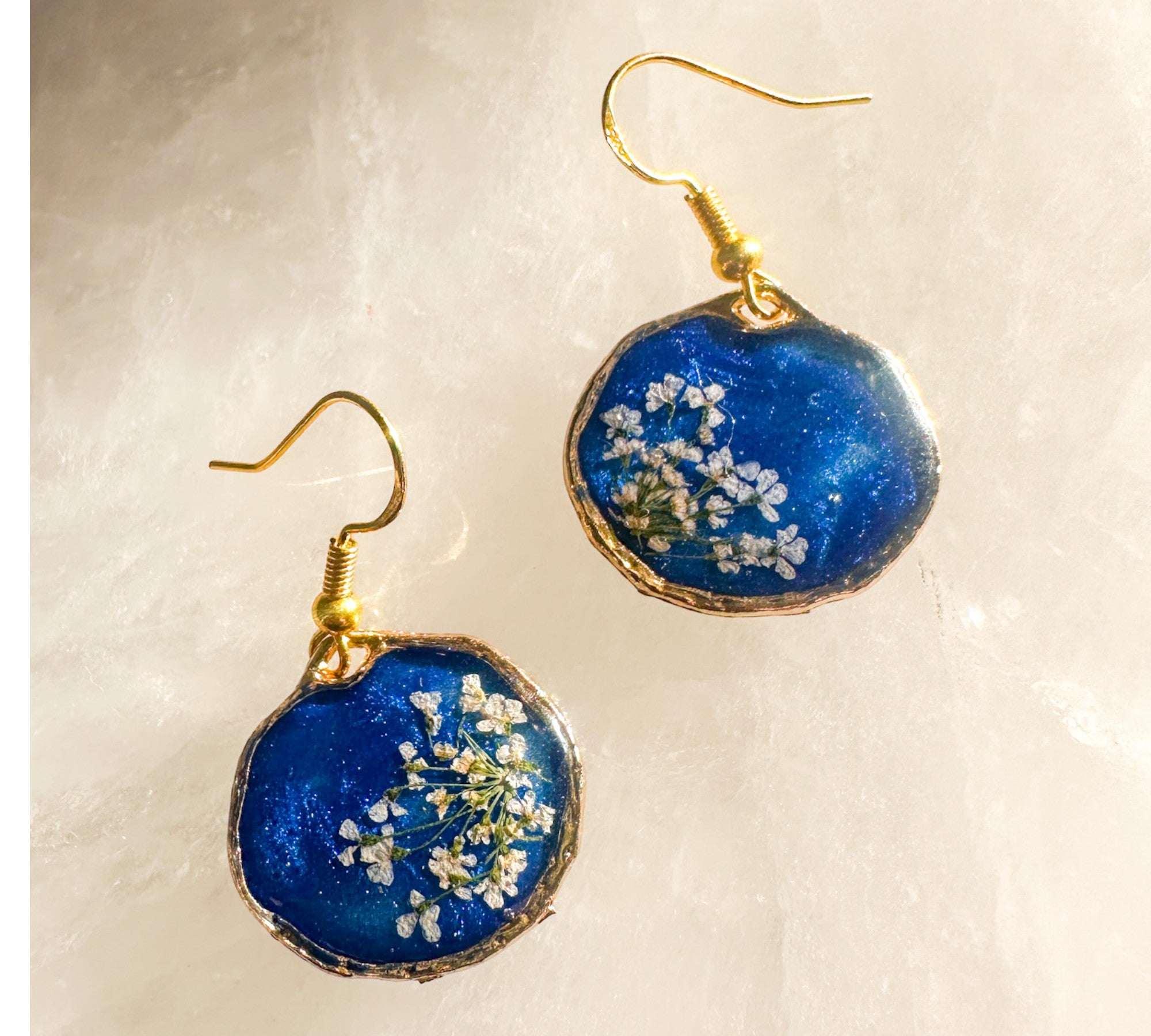 To keep them sparkling, simply wipe them with a soft, dry microfiber cloth. Avoid contact with perfumes, hairsprays, or harsh chemicals, and be sure to remove them before showering or swimming to protect both the resin and the metal finish.