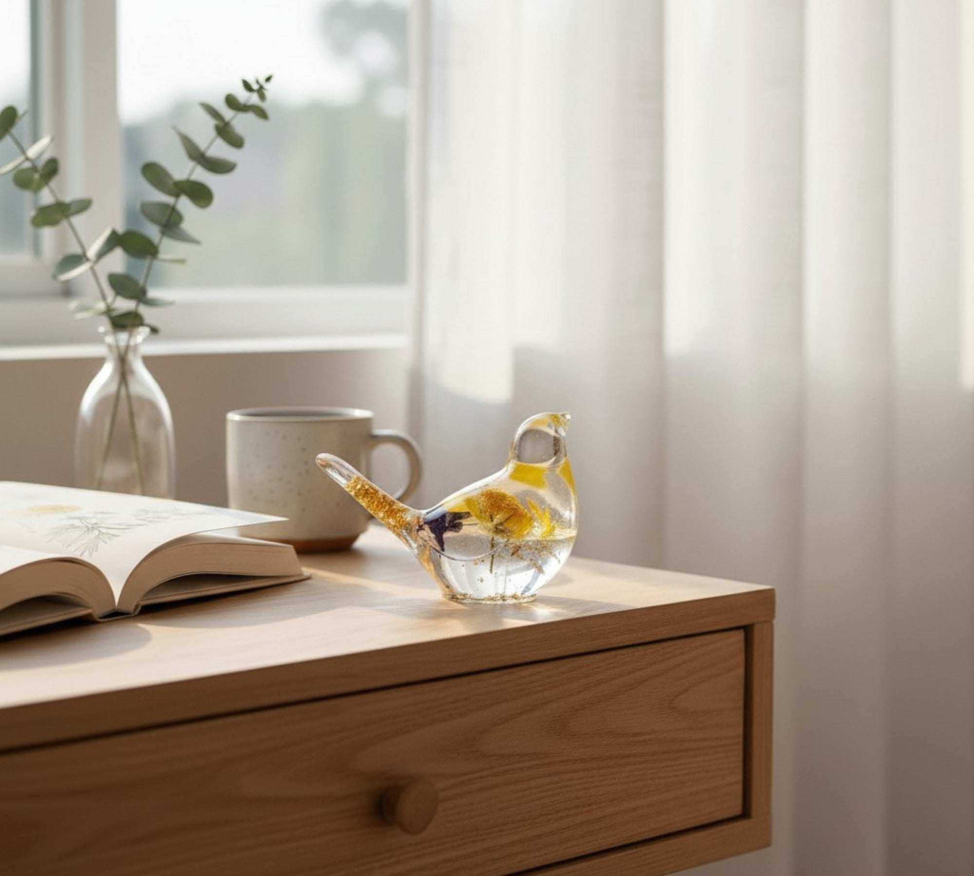 Each bird measures approximately 4" L x 2.5" H and weighs an average of 106 grams. They are the perfect size to tuck into a bookshelf, nestle on a windowsill to catch the light, or display as a high-end accent piece in any corner of your home.
