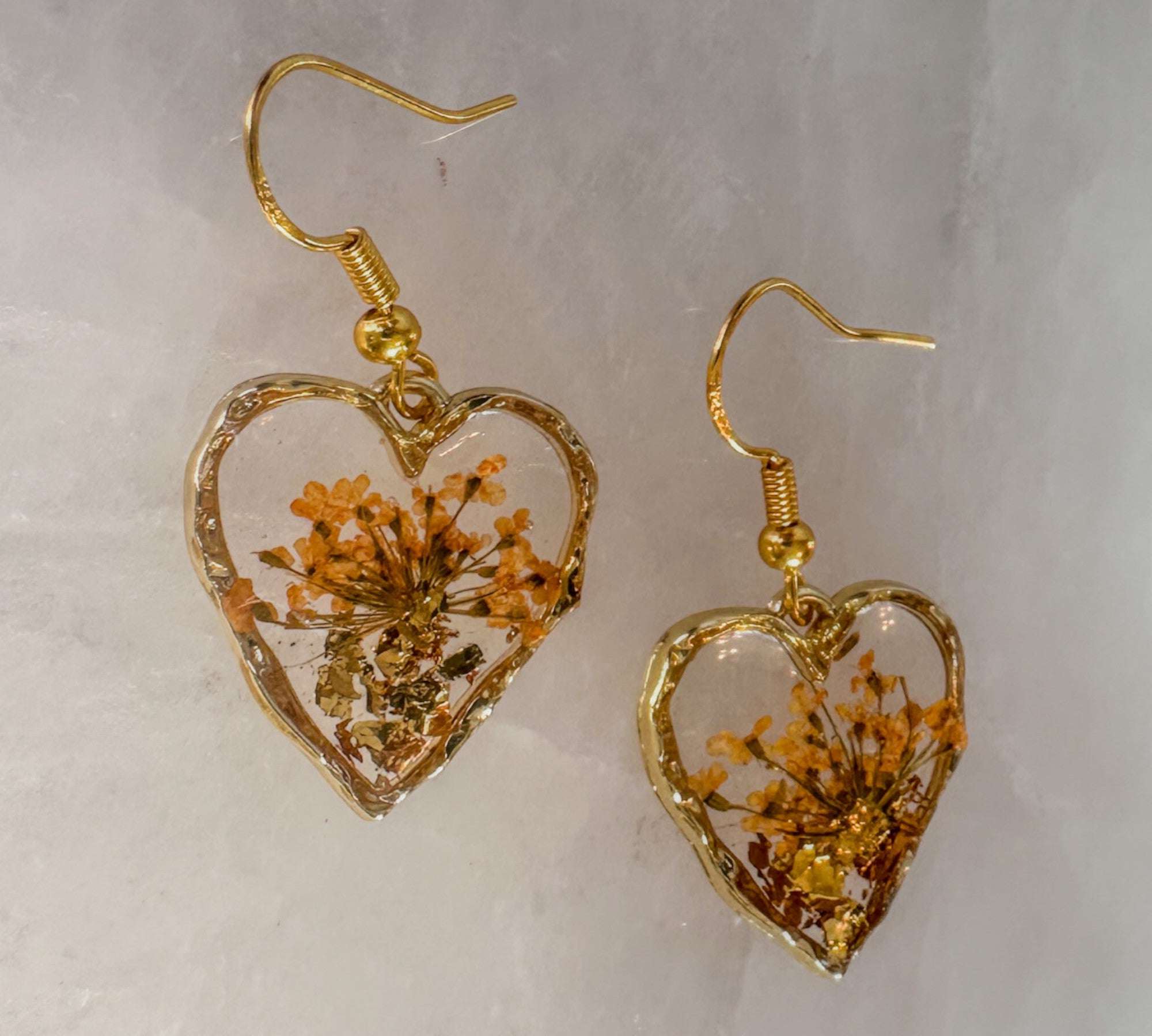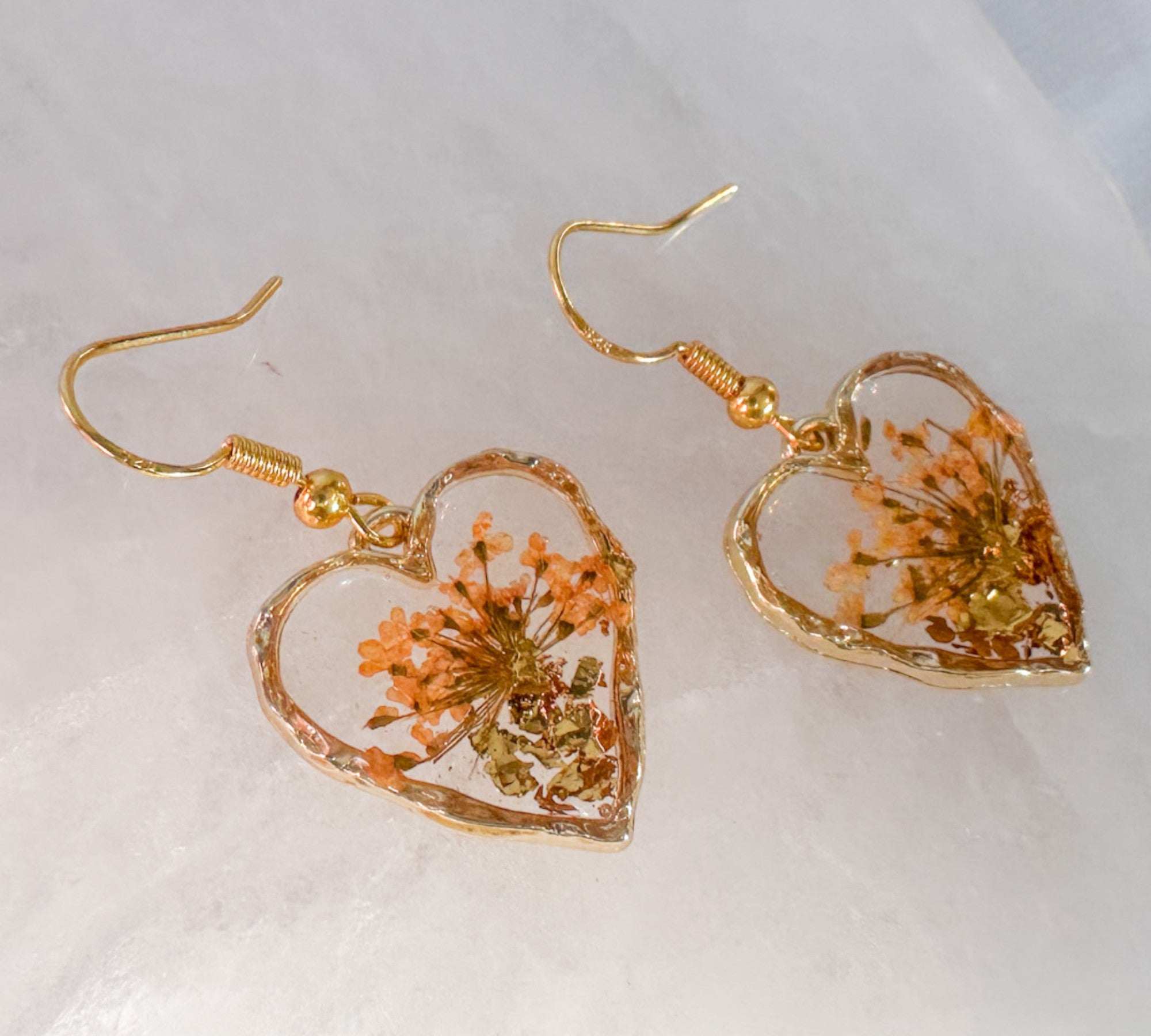 Golden Sunset Hearts | Real Orange Queen Anne Lace Gold Leaf Earrings