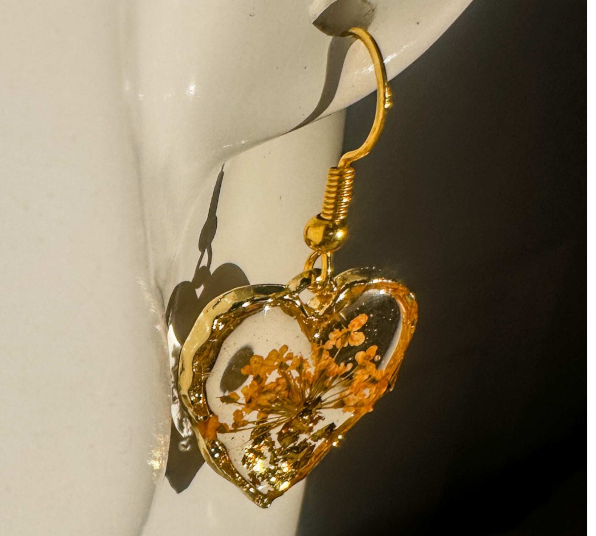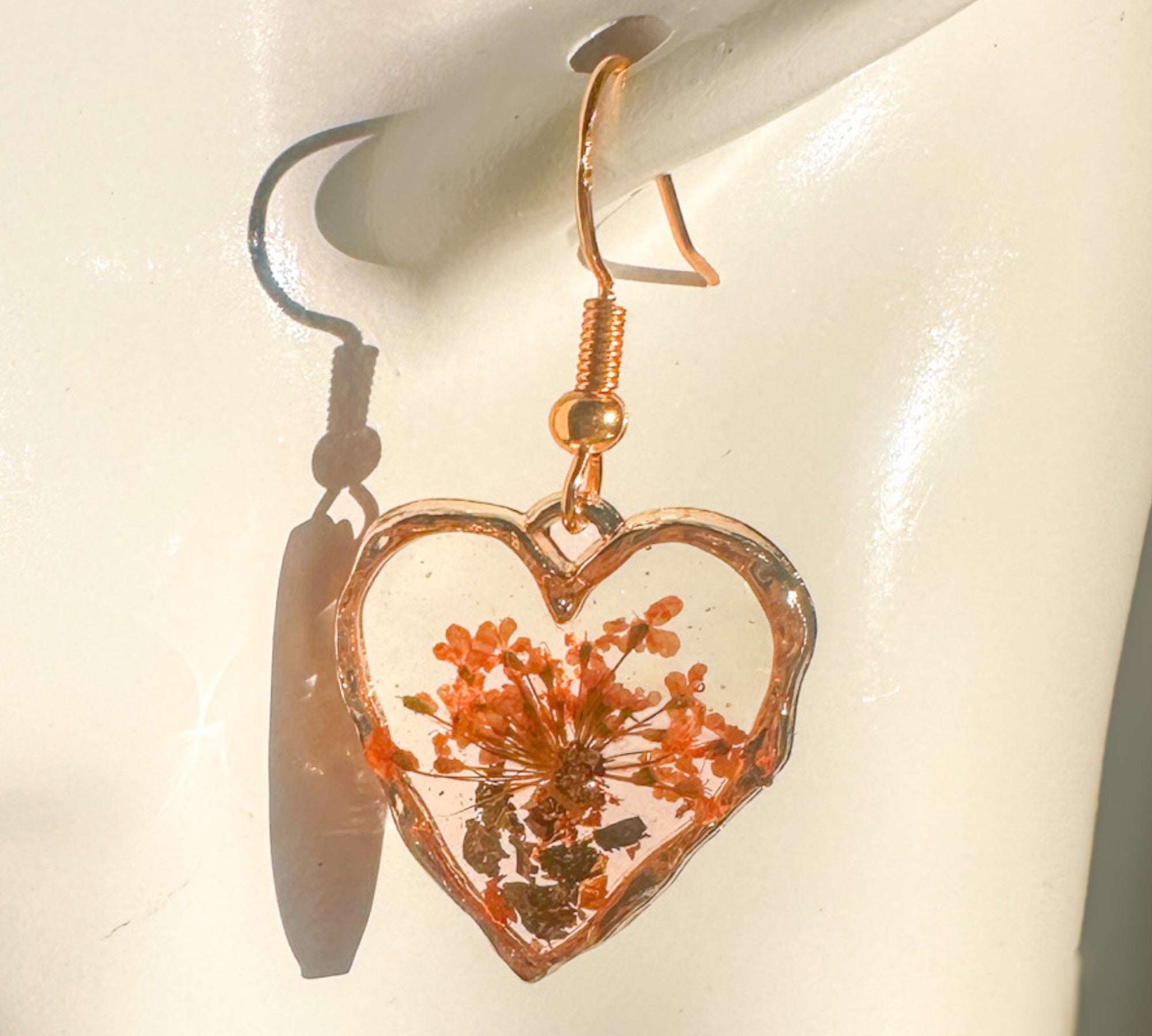 These earrings feature delicate, hand-pressed Queen Anne’s Lace dyed a vibrant sunset orange, meticulously arranged to fan out across the heart.
