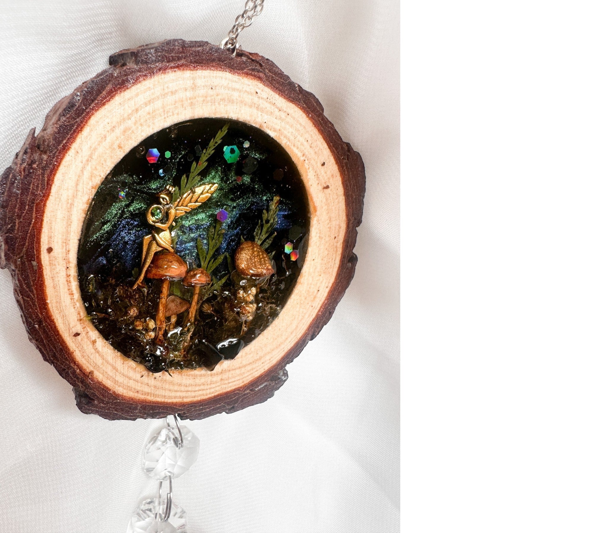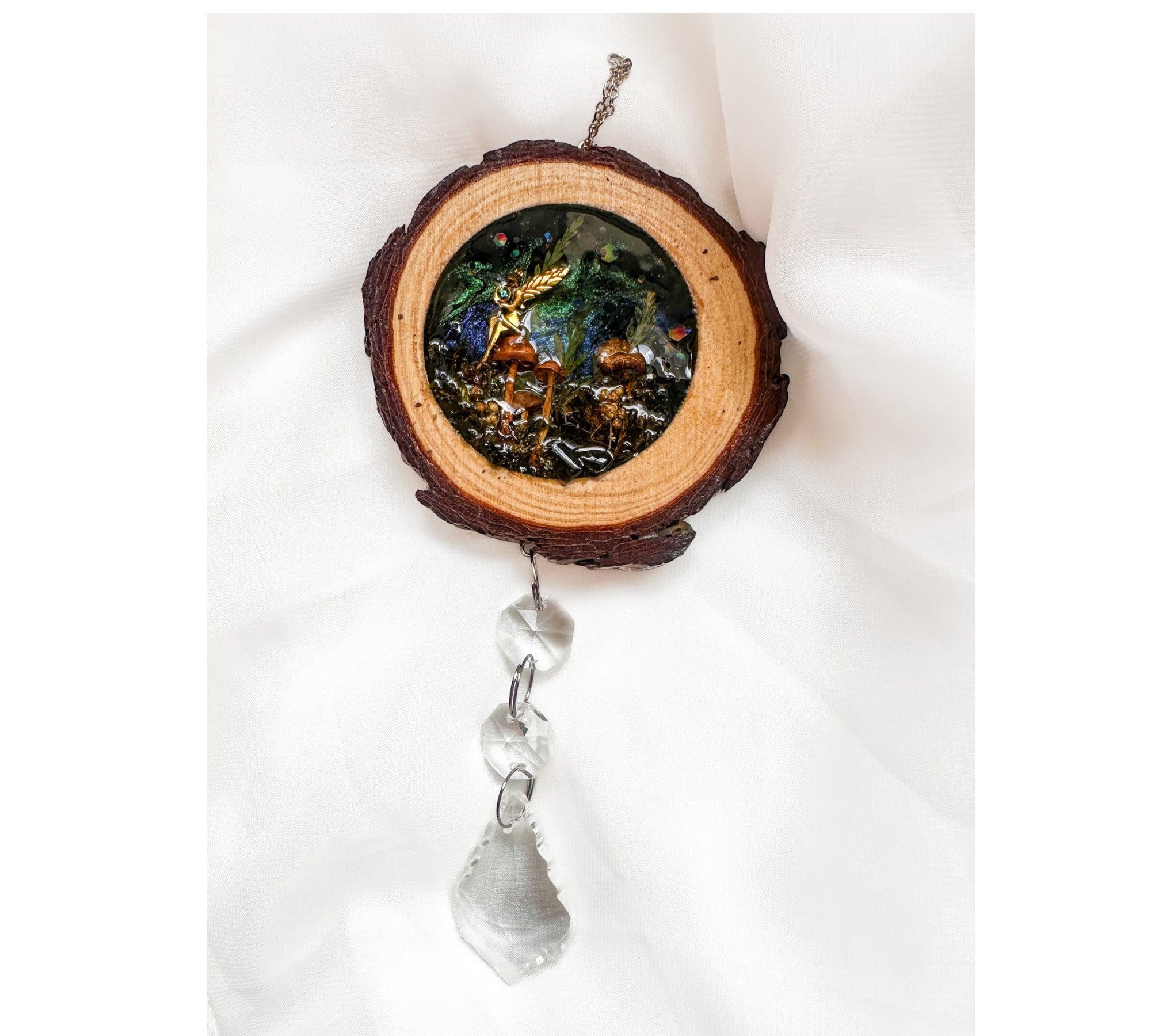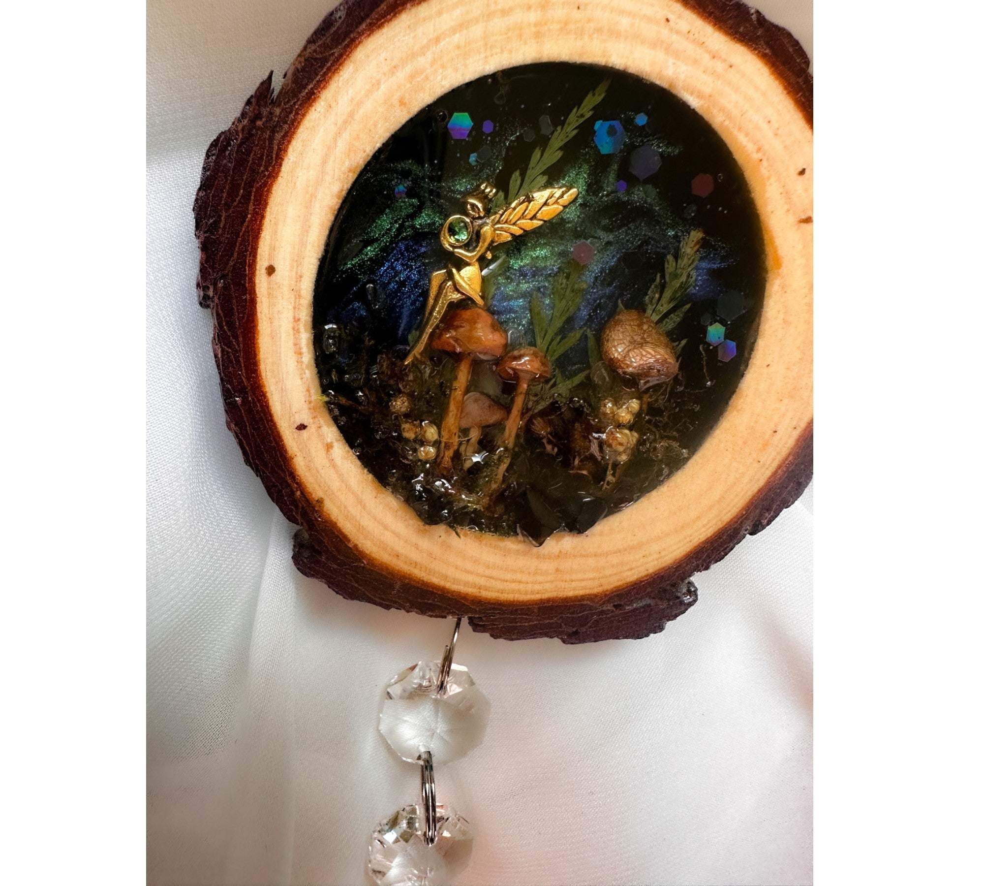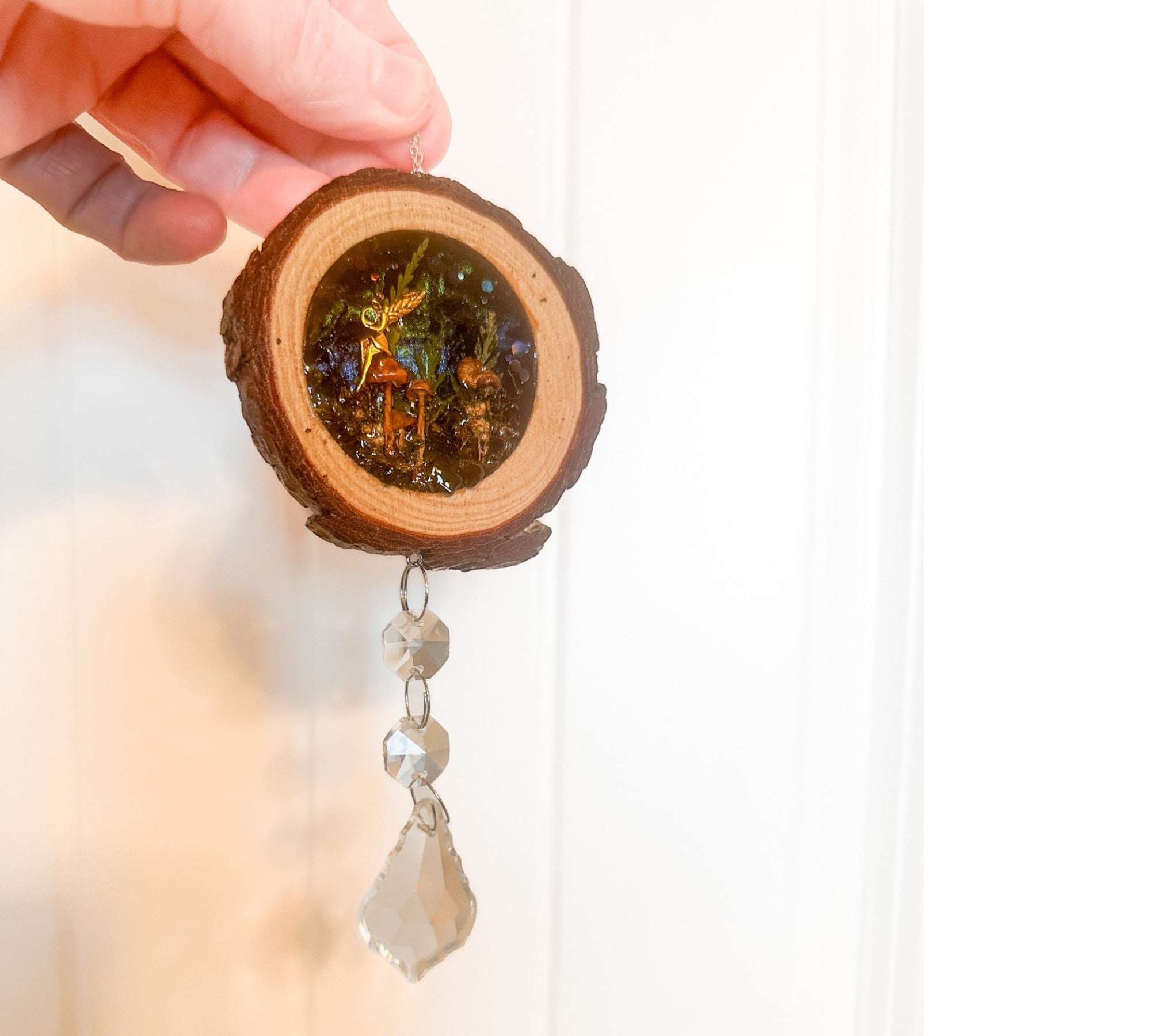 • Artisan Craftsmanship: Set inside a real rustic wood slice with natural bark edge intact, hand-poured in high-quality resin and finished with a hanging trail of crystal beads and a faceted teardrop prism