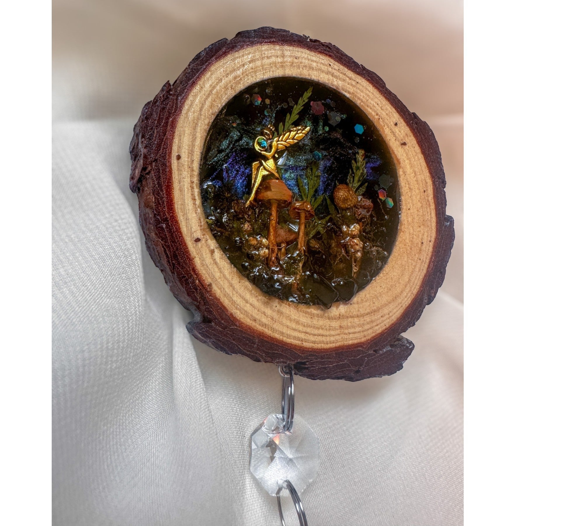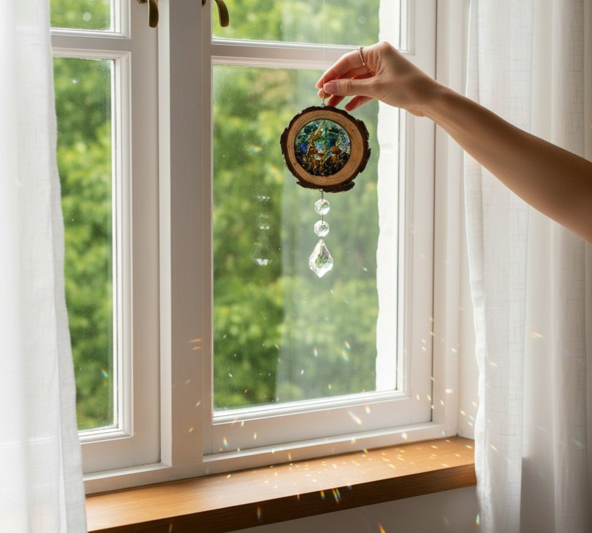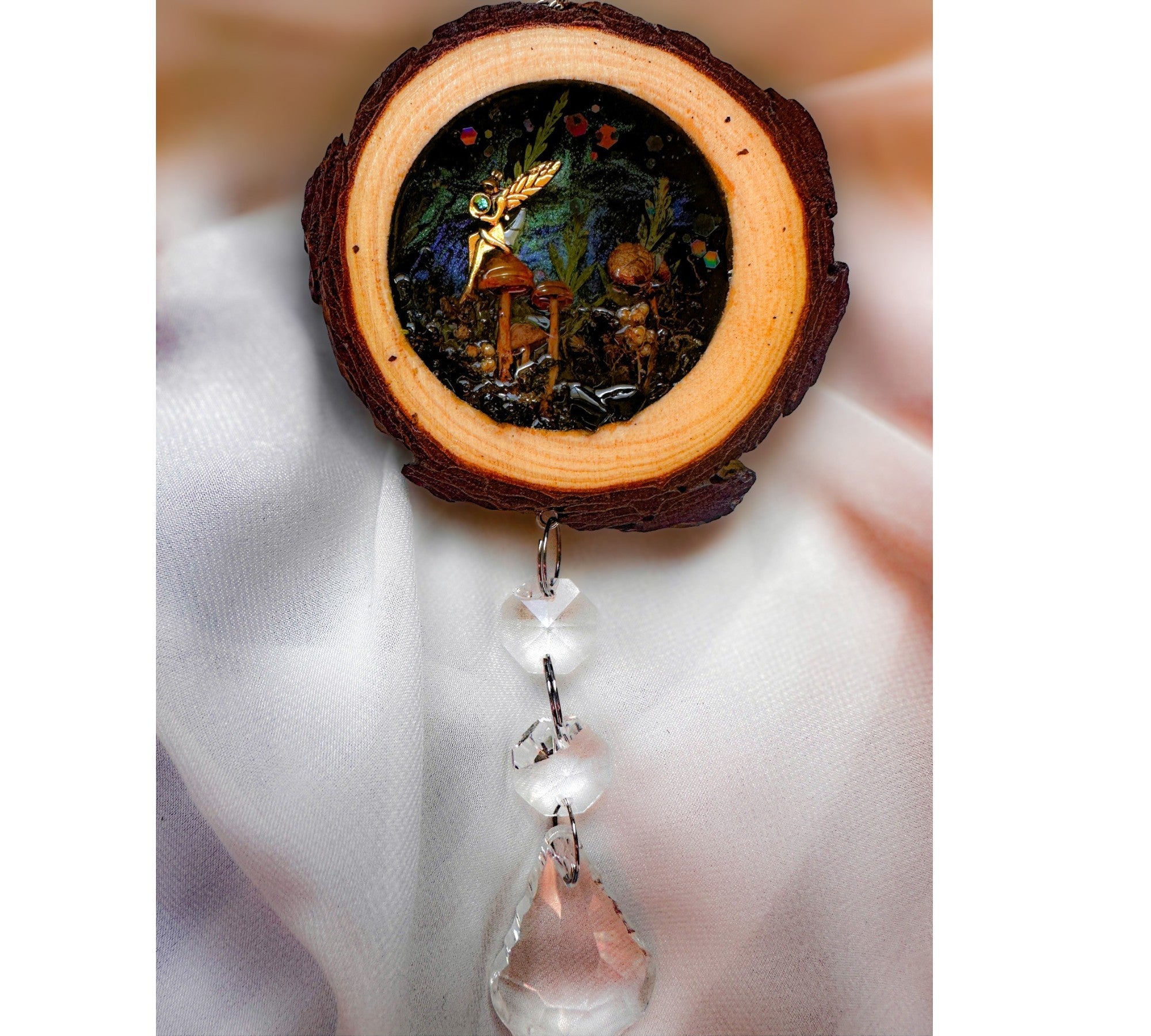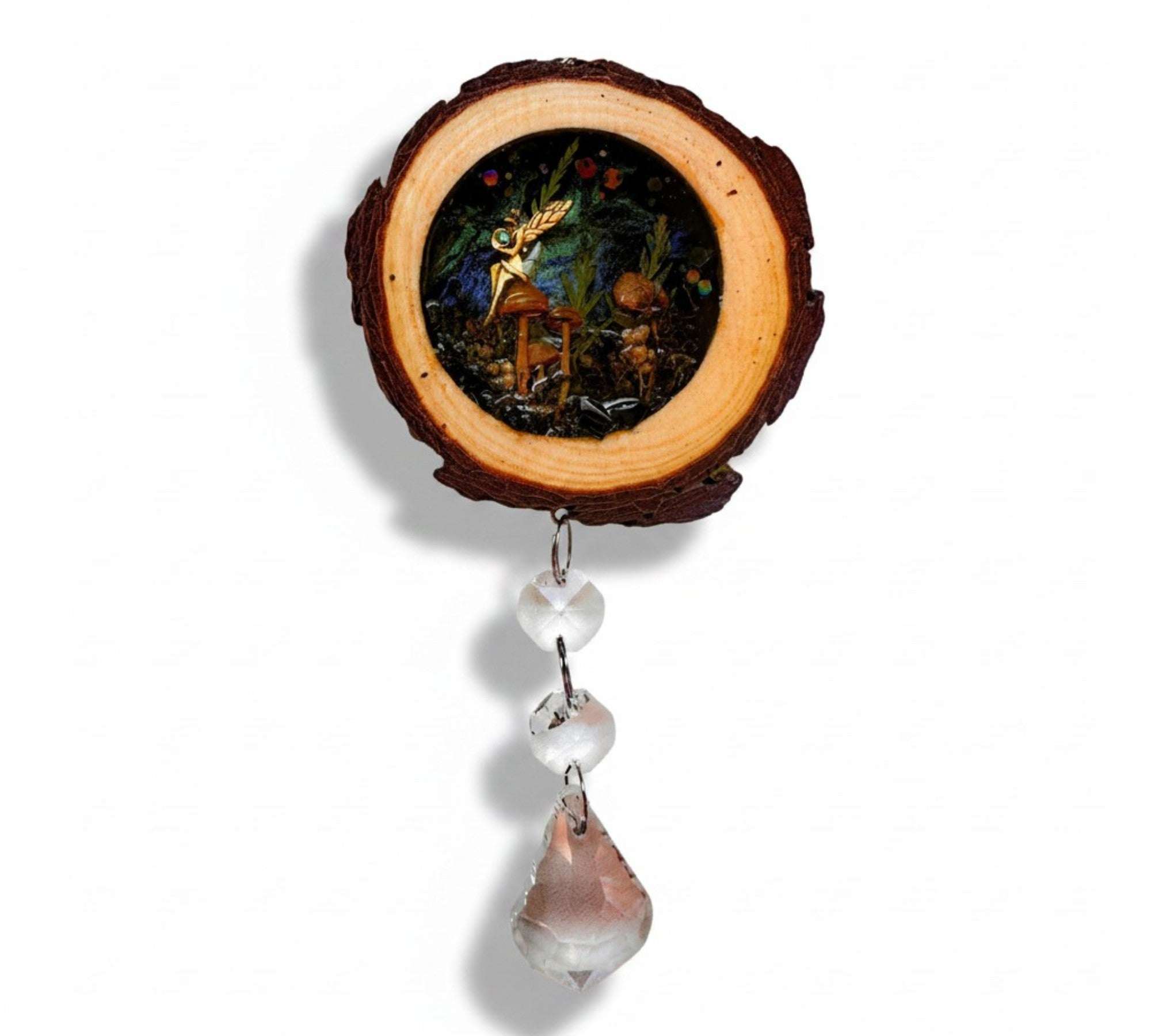 • Artisan Craftsmanship: Set inside a real rustic wood slice with natural bark edge intact, hand-poured in high-quality resin and finished with a hanging trail of crystal beads and a faceted teardrop prism