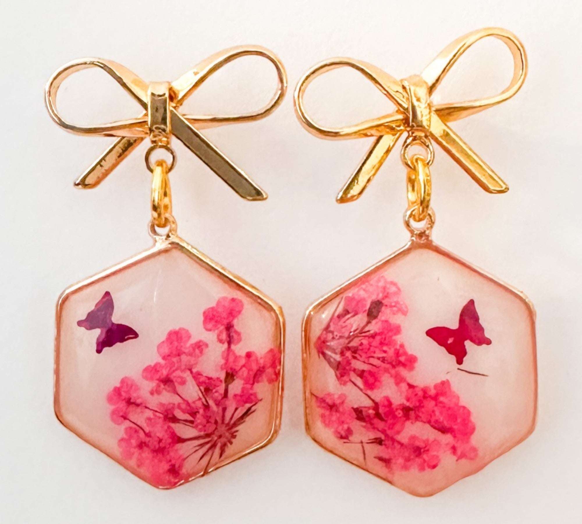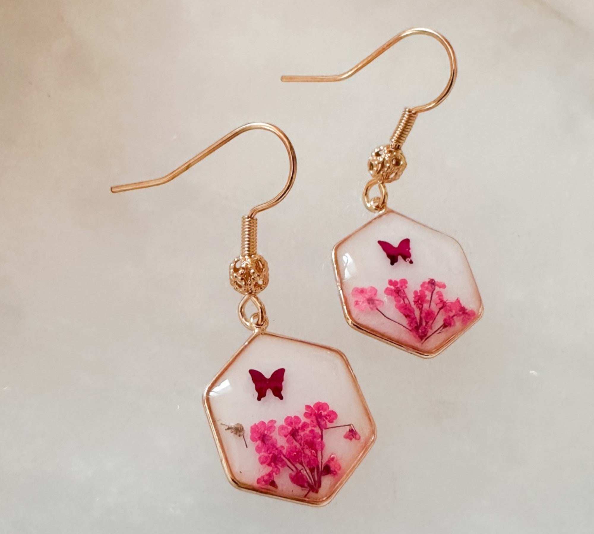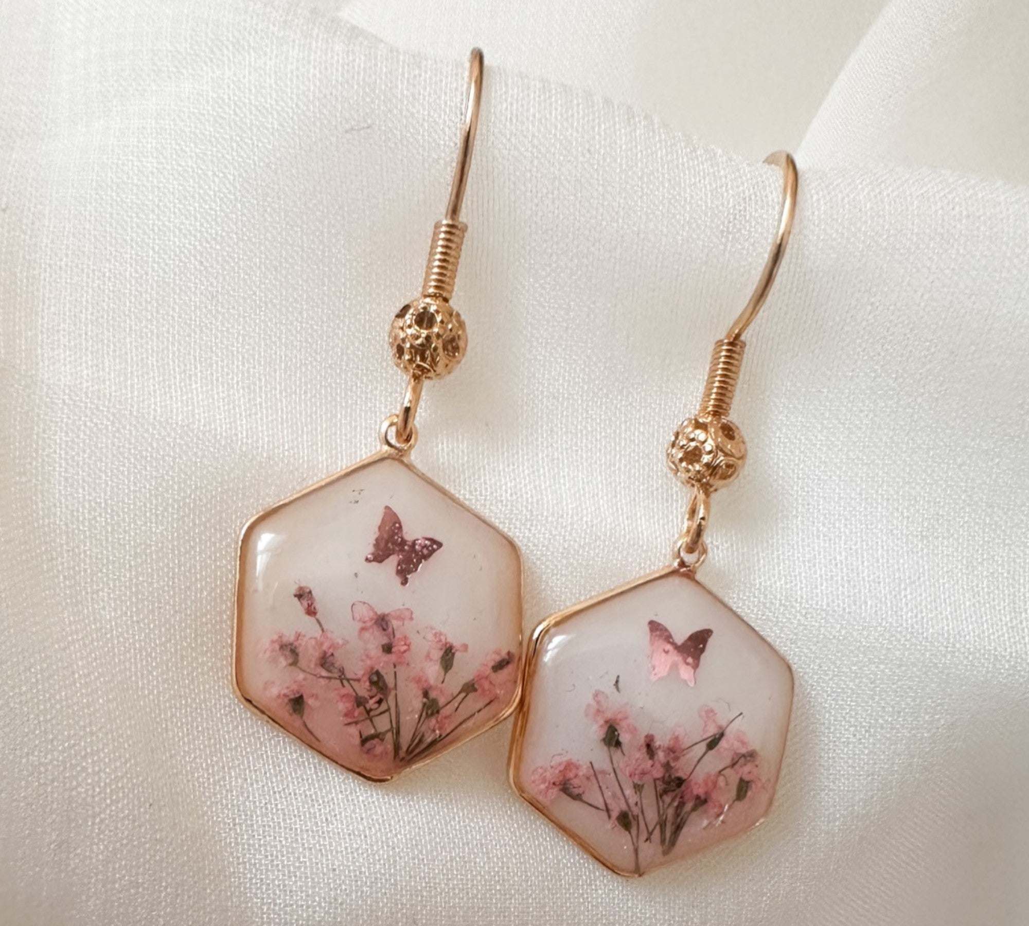 Pink Butterfly & Boreal Spring Bloom Handmade Hexagon Earrings