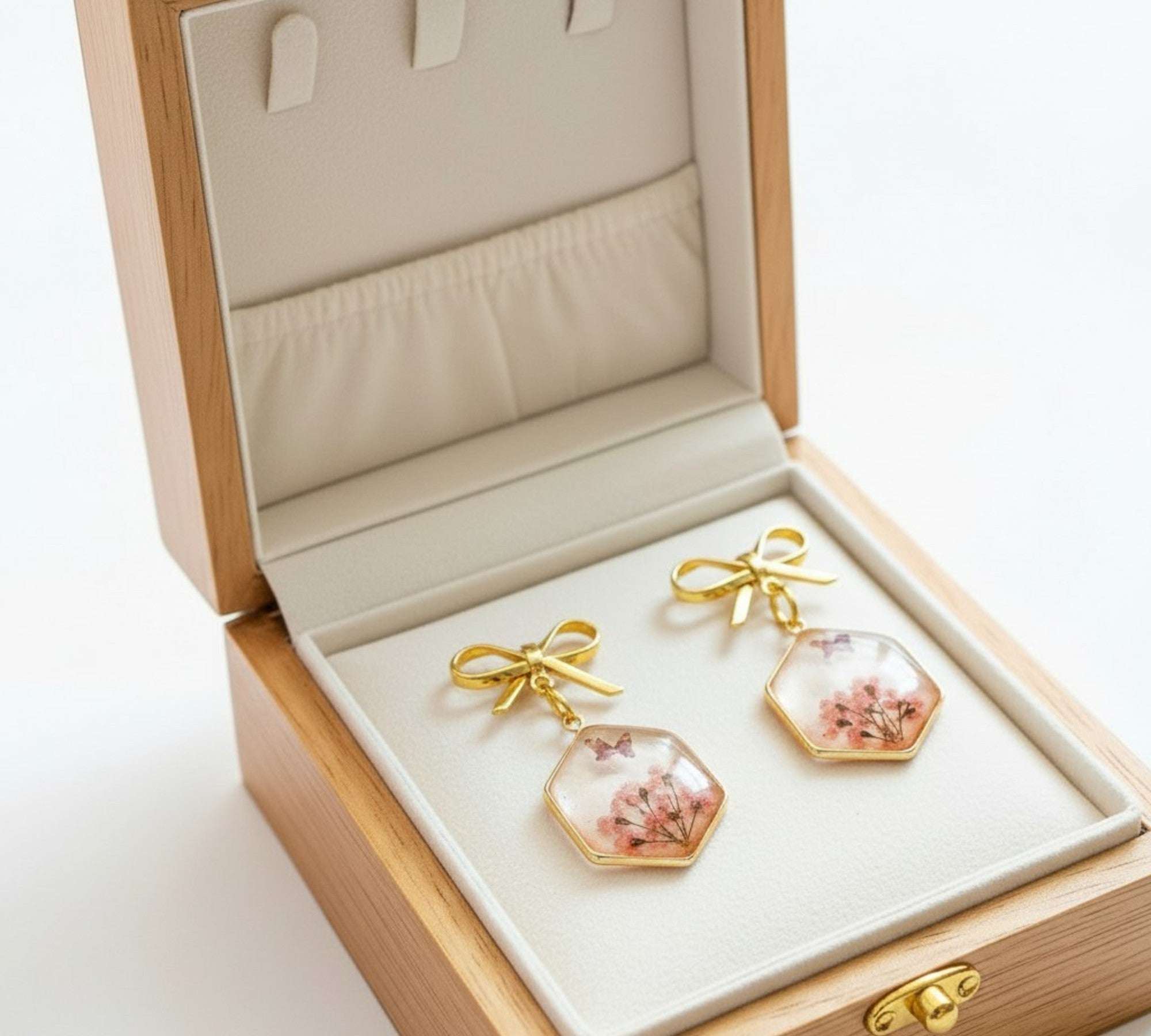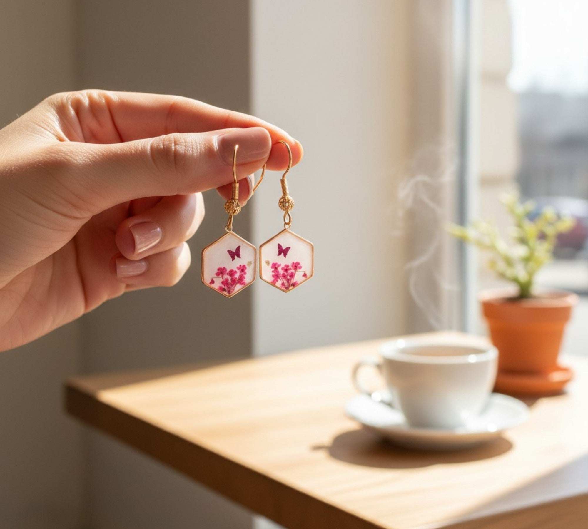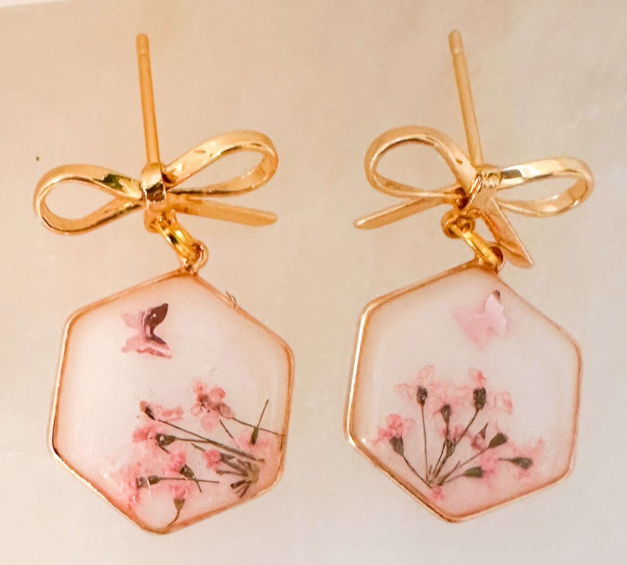 Pink Butterfly & Boreal Spring Bloom Handmade Hexagon Earrings