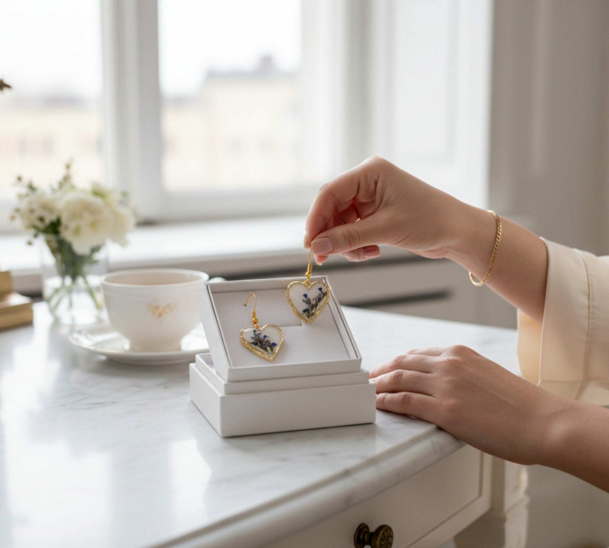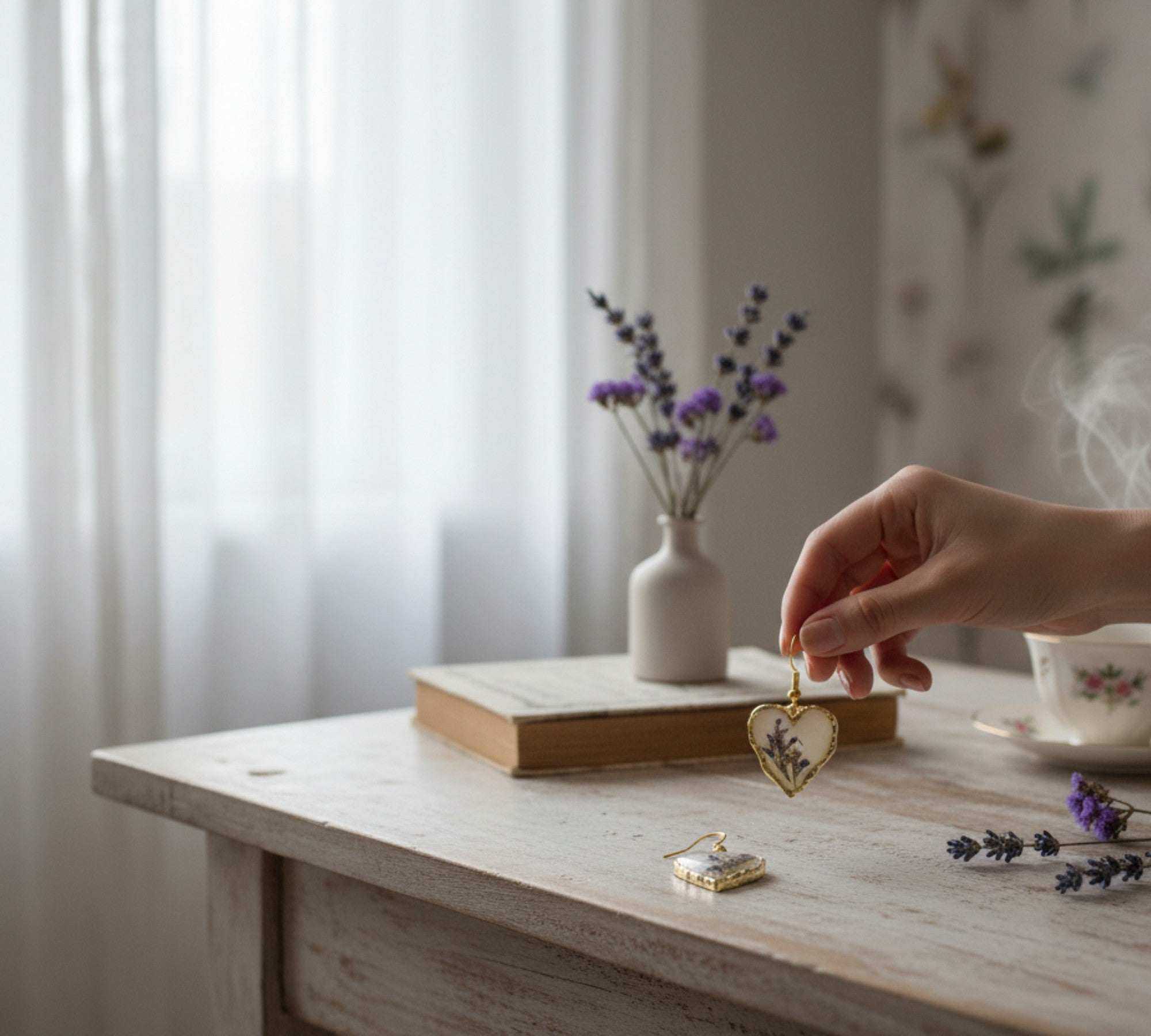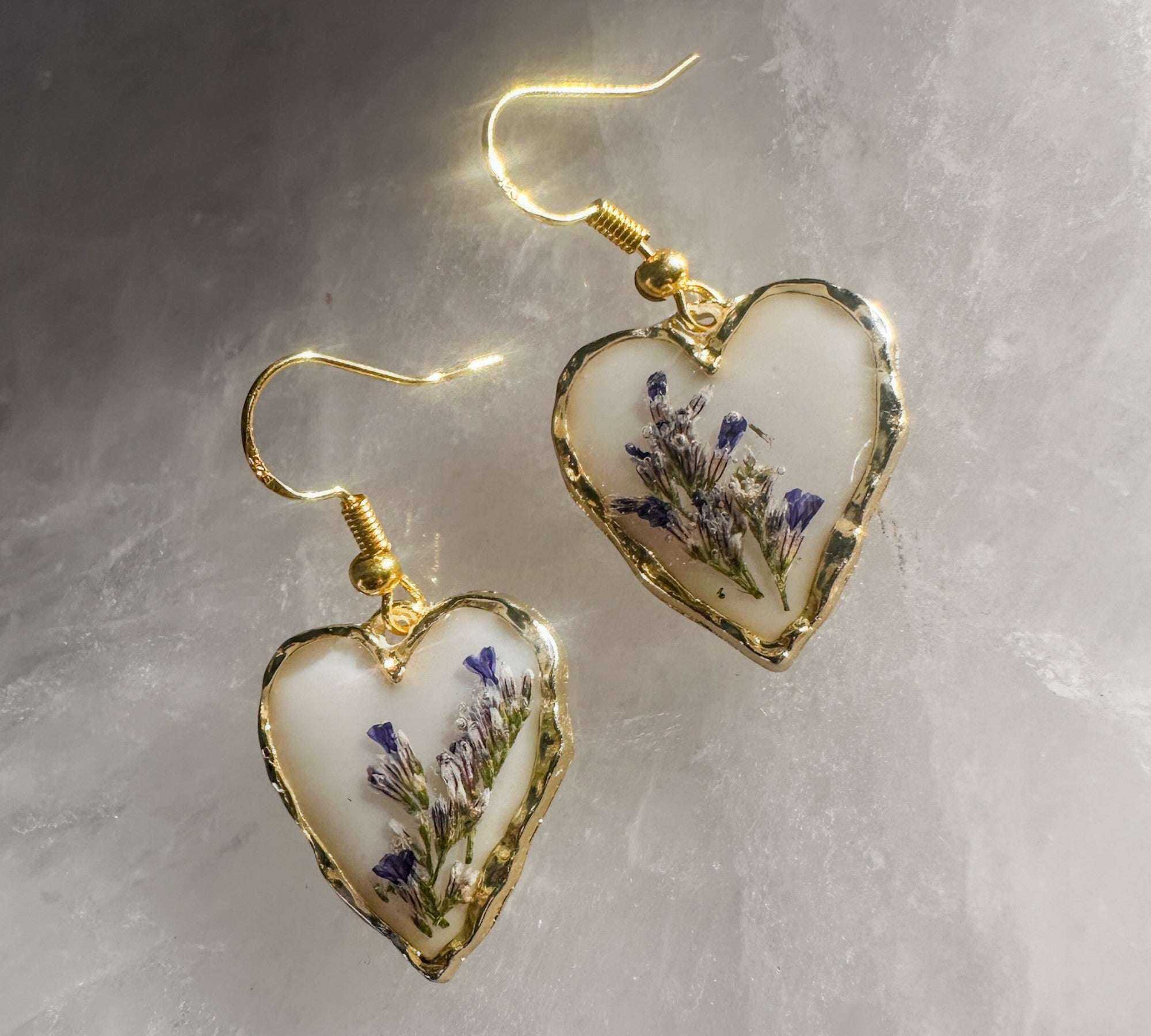 • Every heart is hand-poured, ensuring that the floral "landscape" in your earrings is uniquely yours.