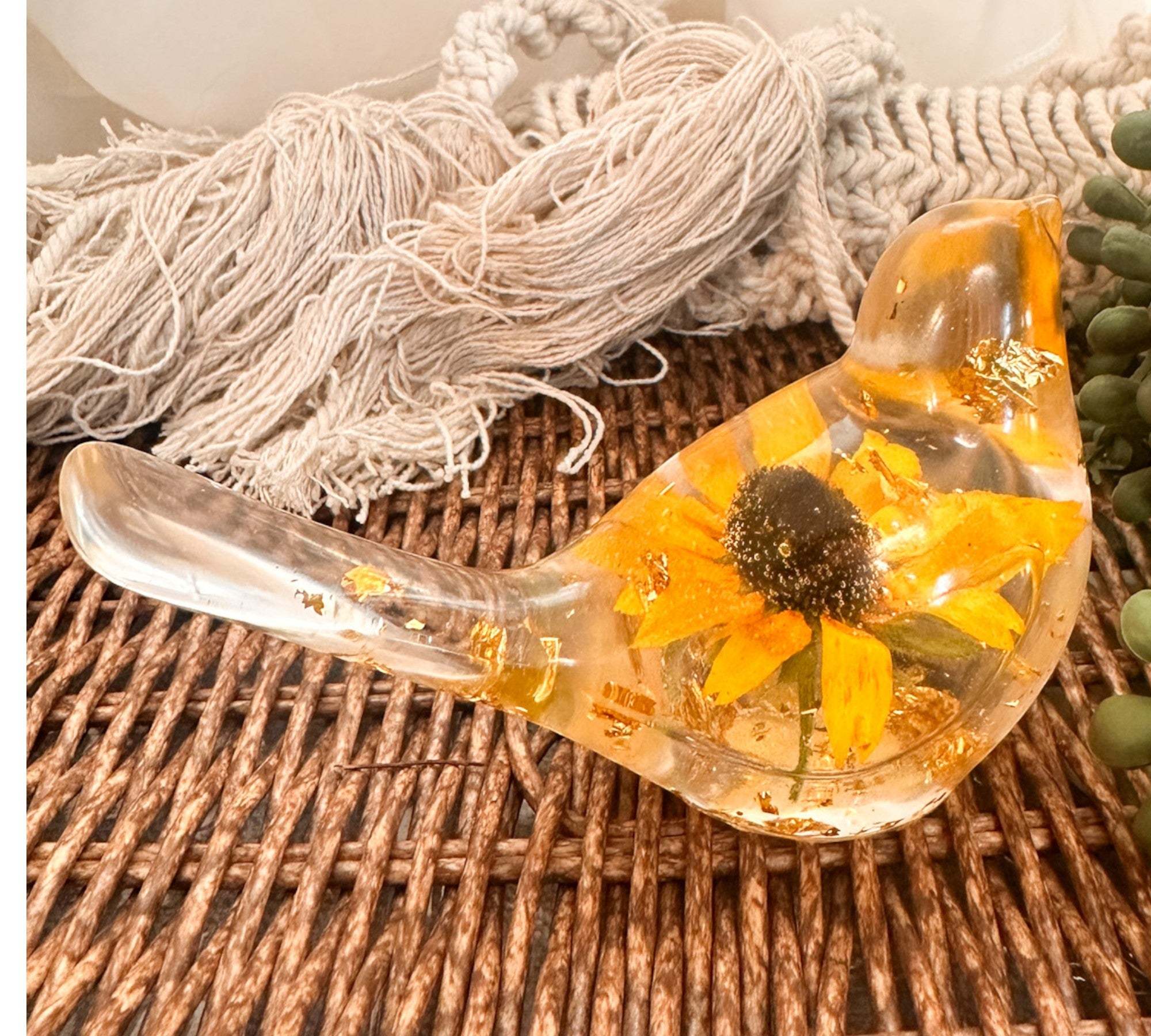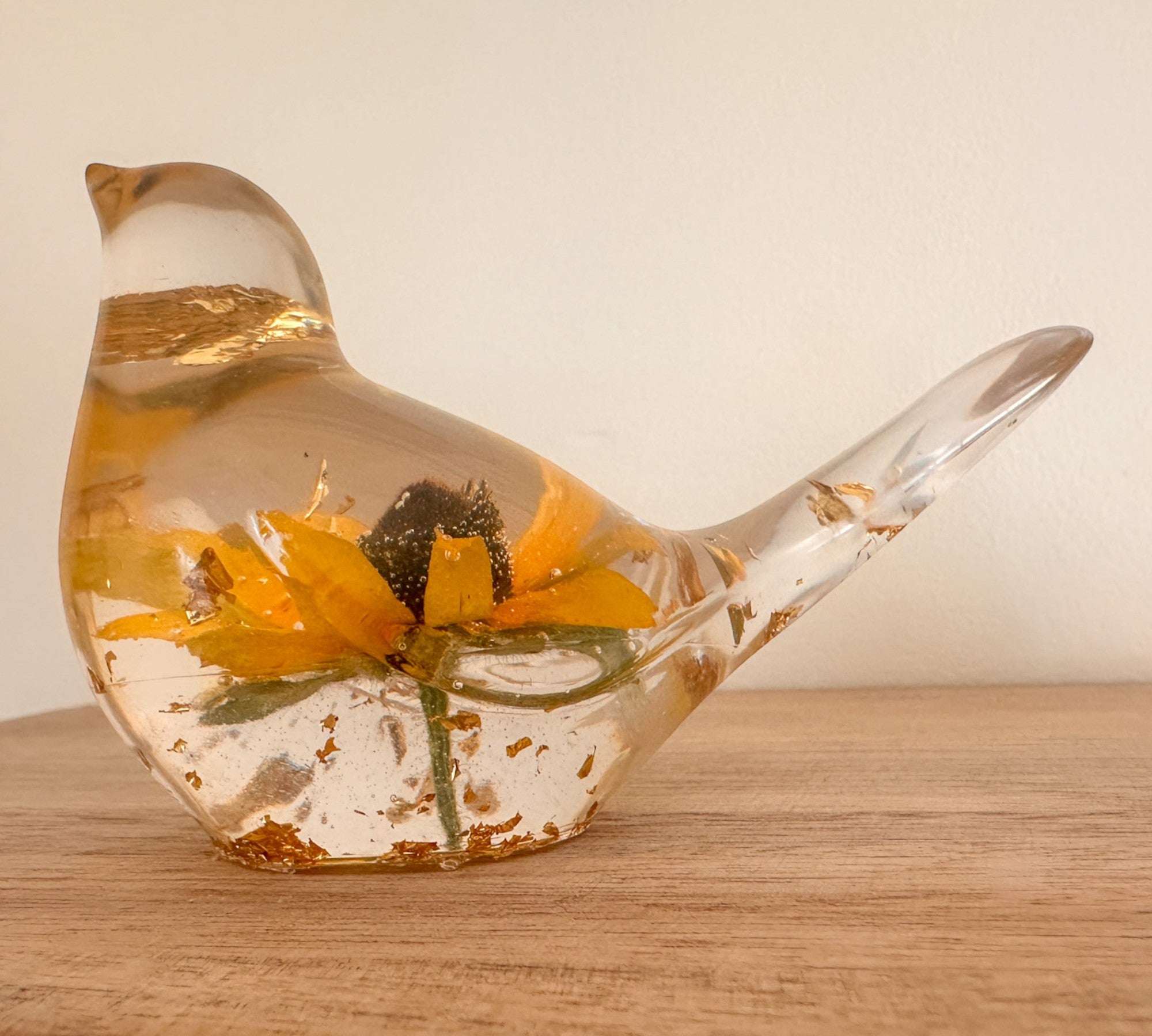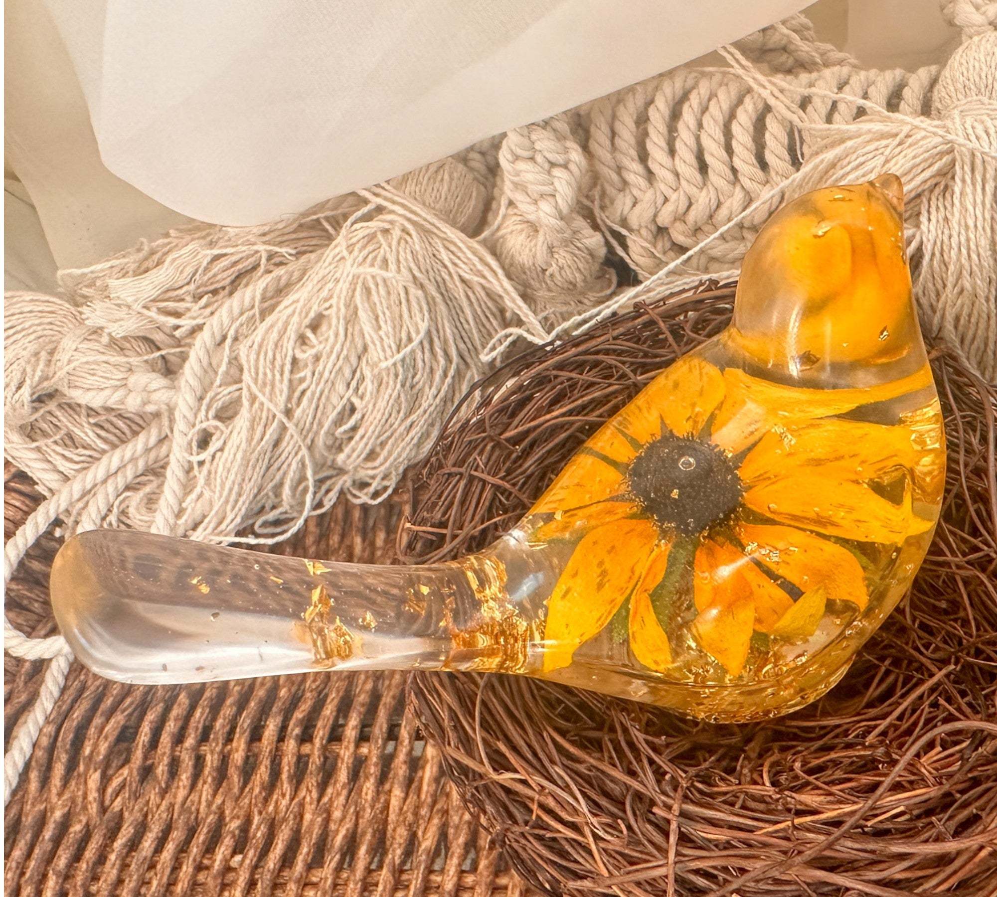 Bring a little sunshine indoors with this enchanting Golden Meadow Bloom Resin Bird, featuring a real preserved Black-Eyed Susan captured in resin.