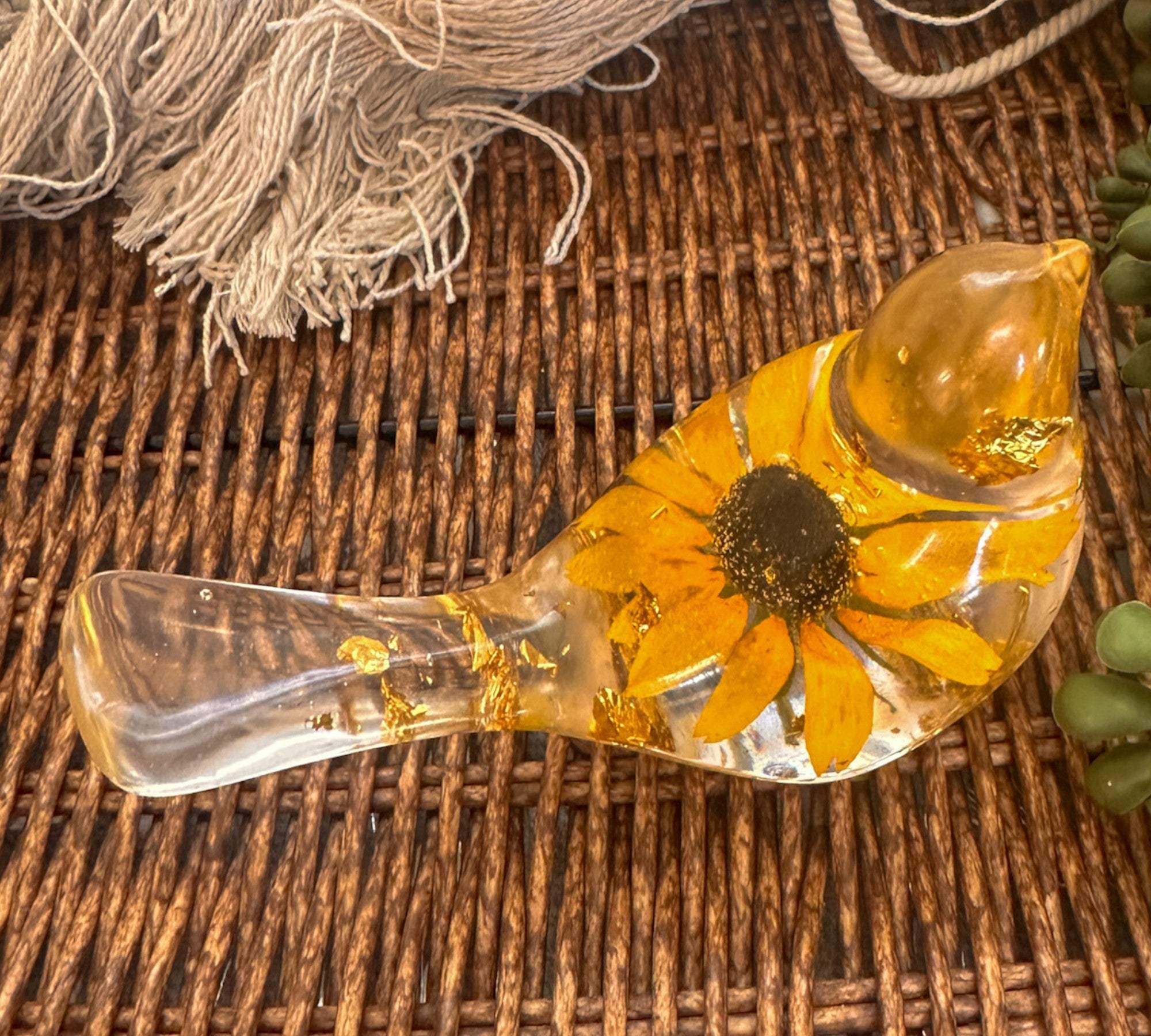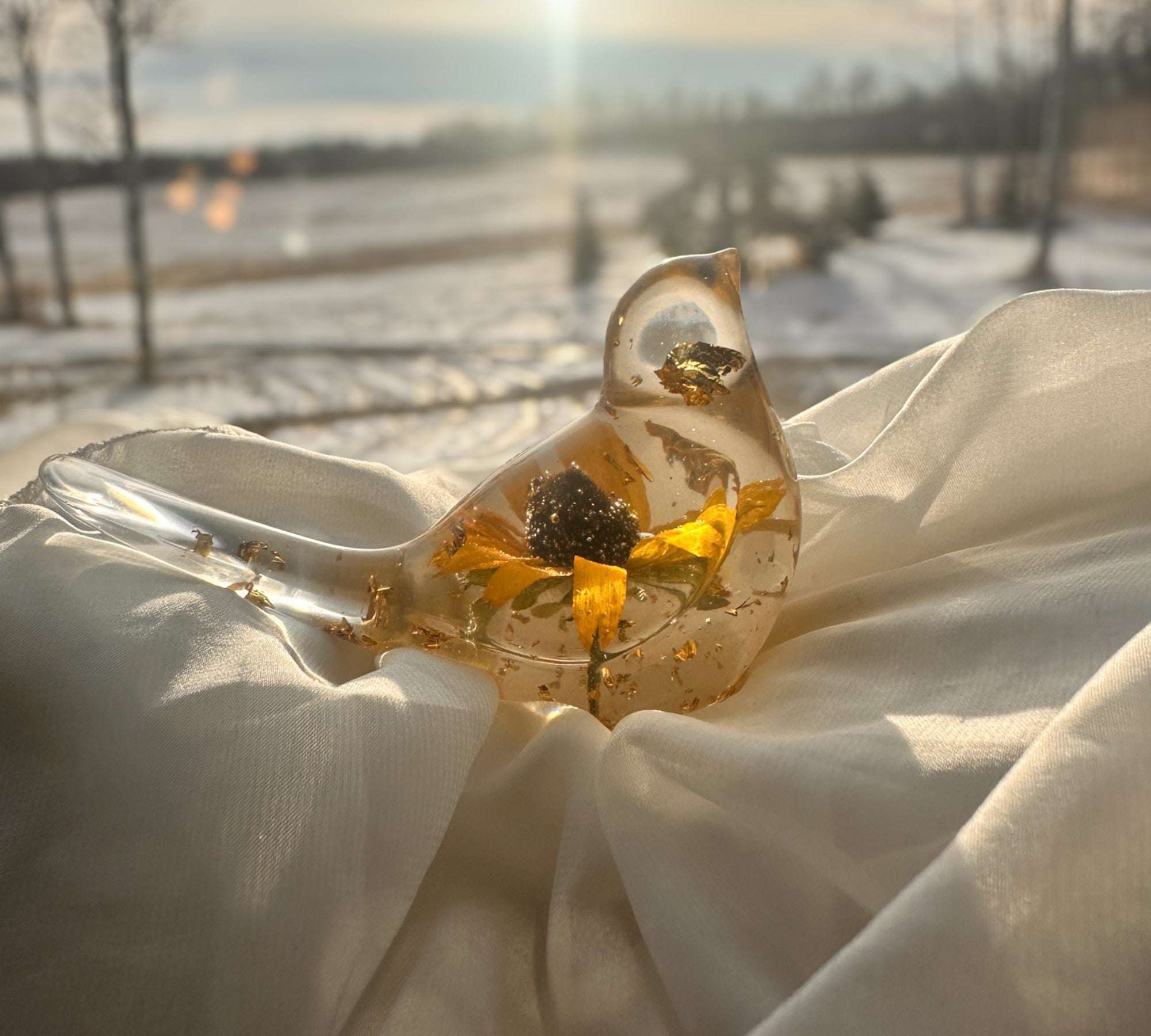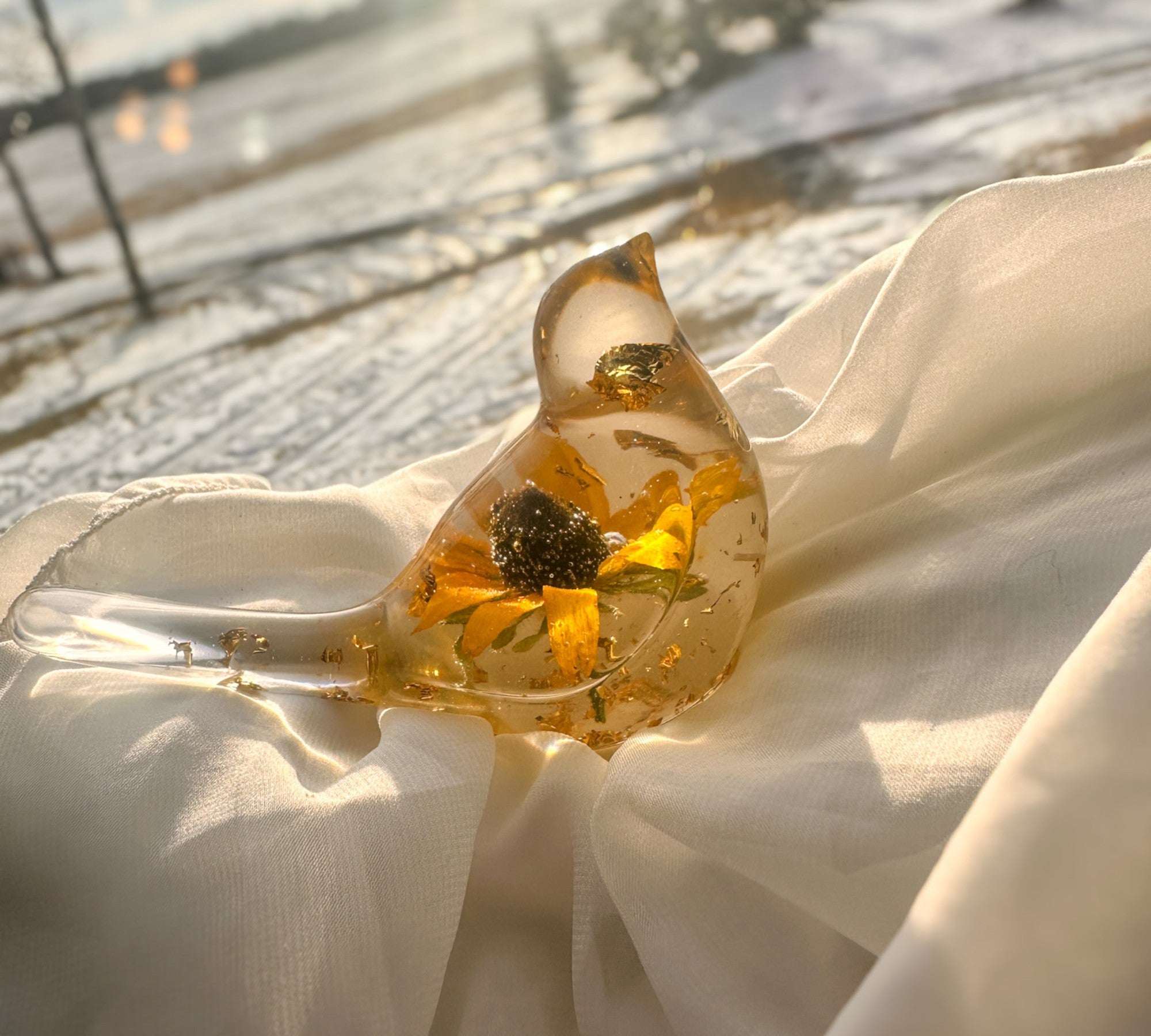 Bring a little sunshine indoors with this enchanting Golden Meadow Bloom Resin Bird, featuring a real preserved Black-Eyed Susan captured in resin.