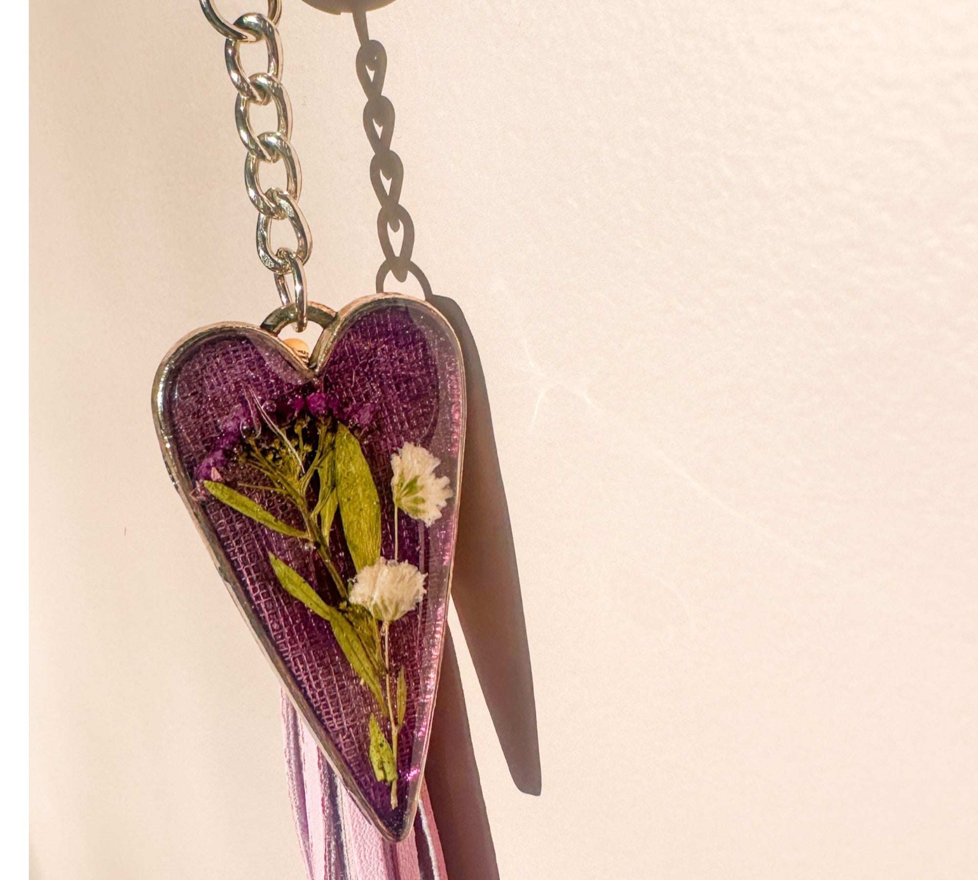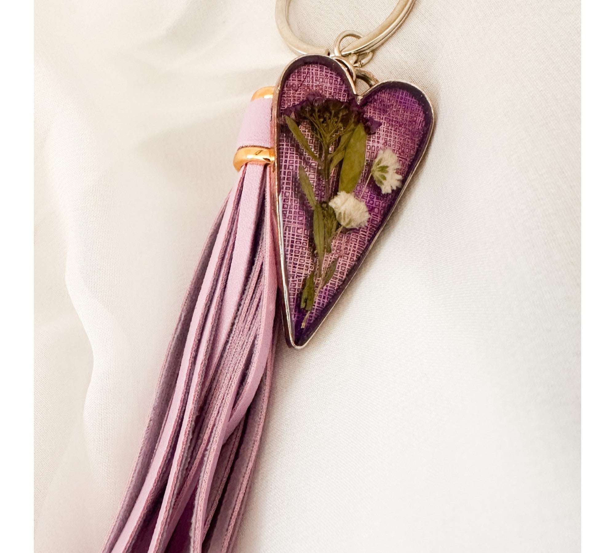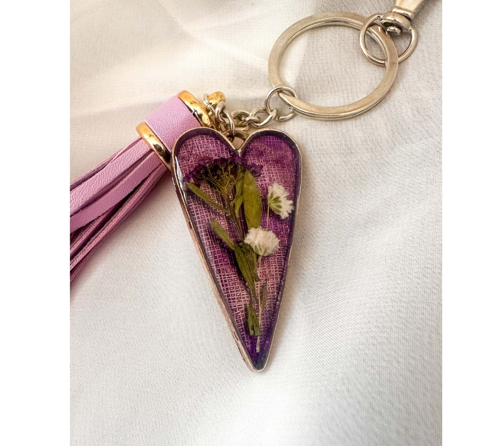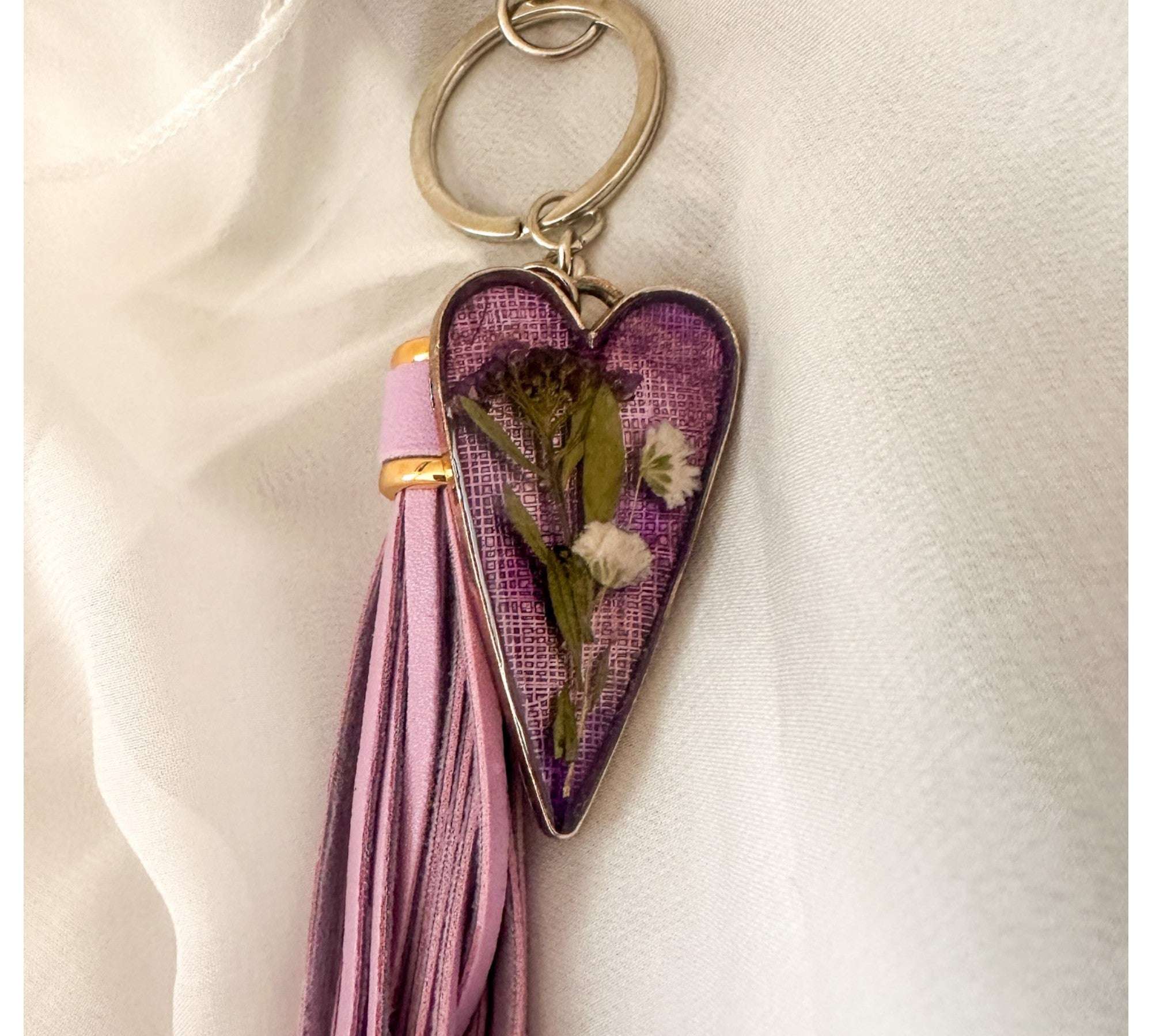 This isn't just a keyring; it's a portable garden. Designed for the romantic who values unique artisan quality, this charm adds a subtle, nature-inspired touch to your favorite bag. The gentle purple hue and natural white flowers offer a sense of peace and beauty that goes with you wherever you travel.