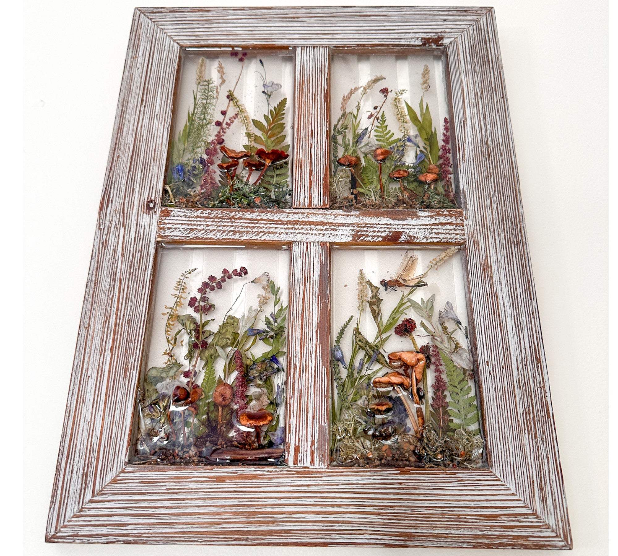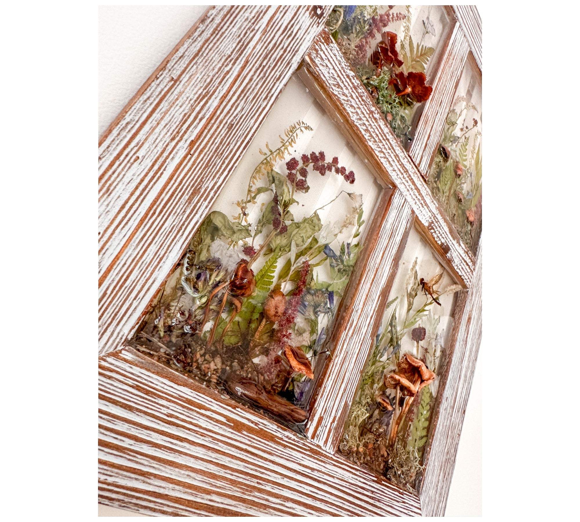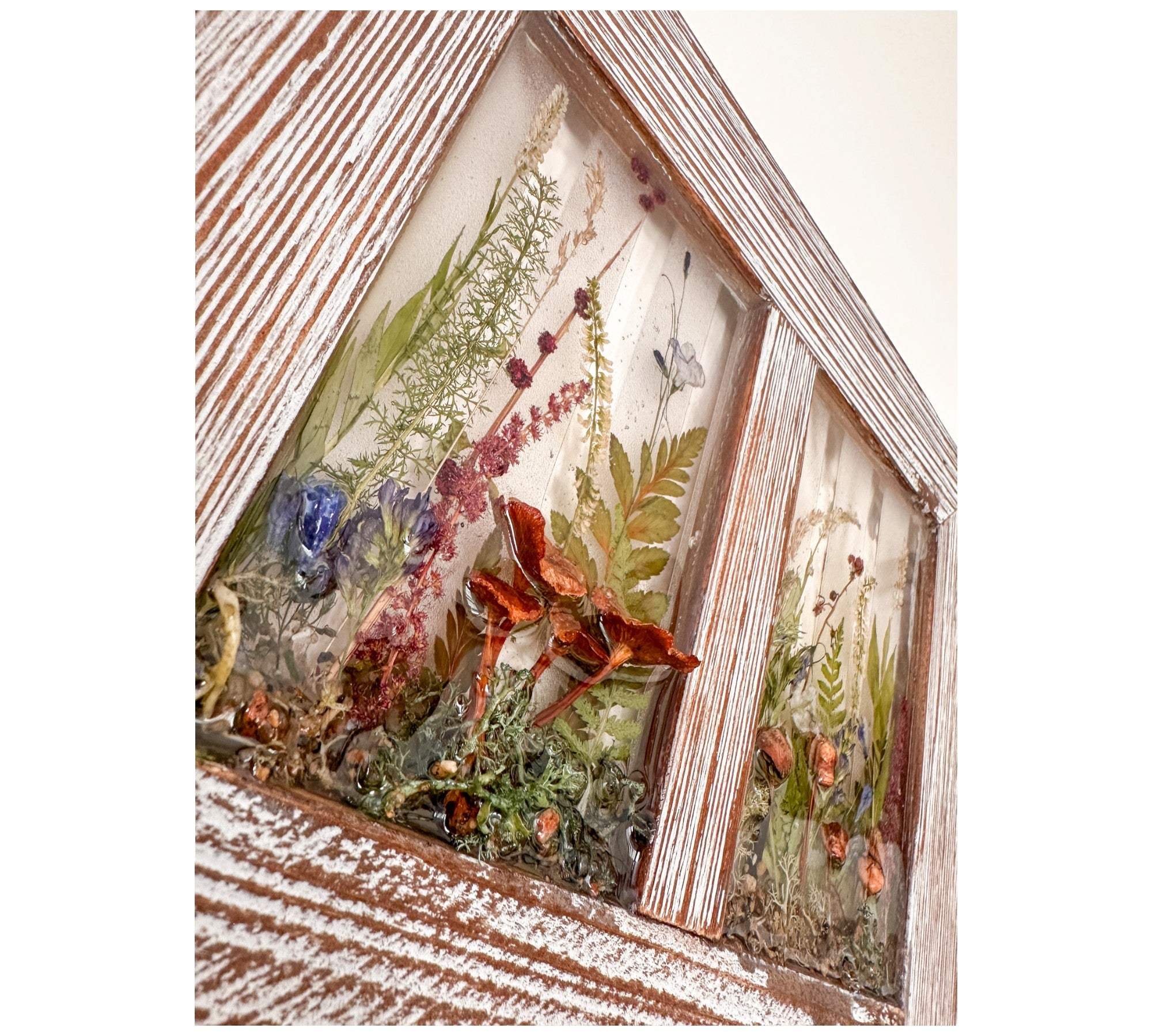 Each window is a labor of time and patience. Every botanical was gathered by hand and dried over the peak summer months to preserve its vibrant color. The four panes are created using a specialized two-layer resin pour, which gives the botanicals a lifelike 3D depth that shifts as you move past it.