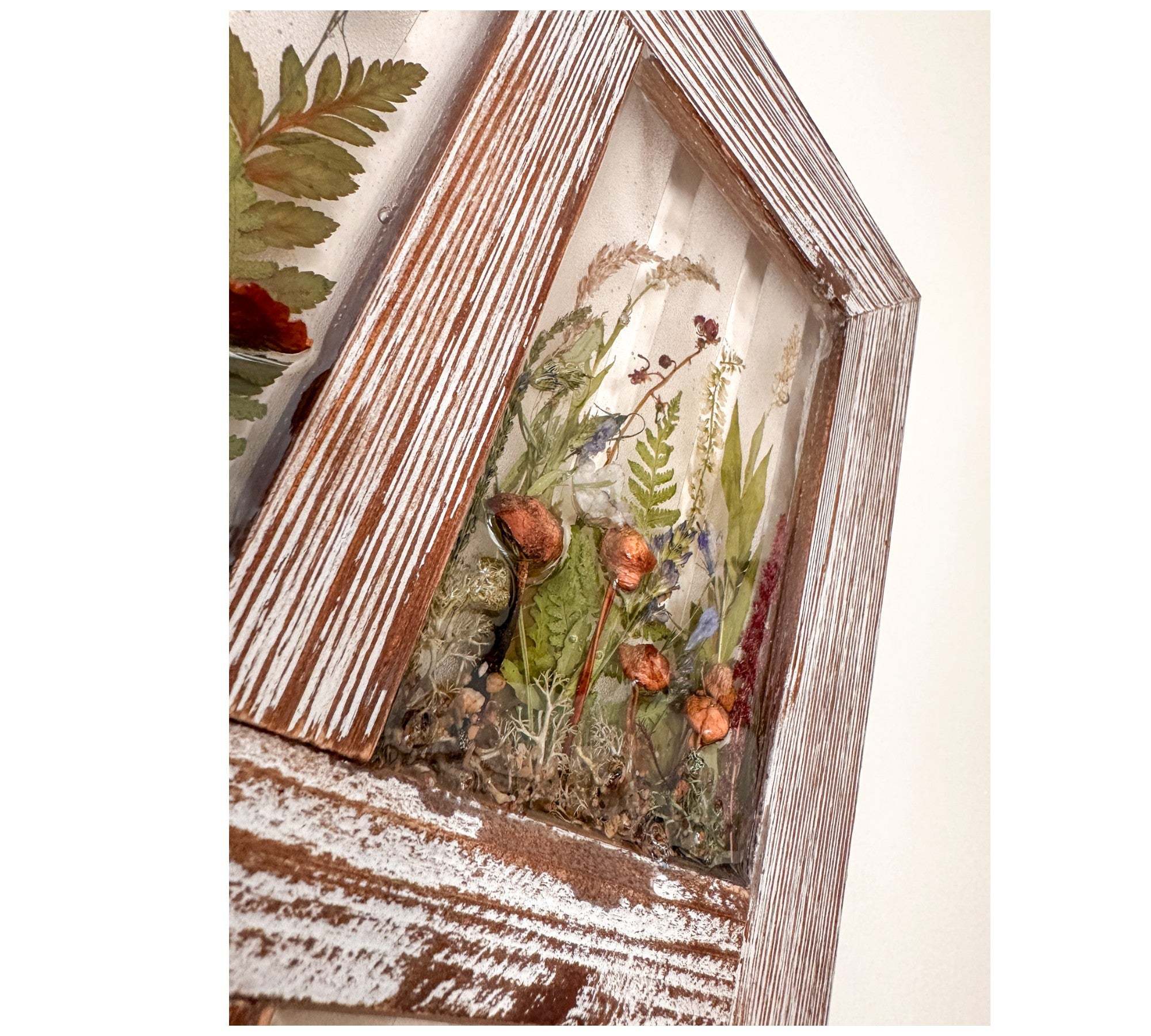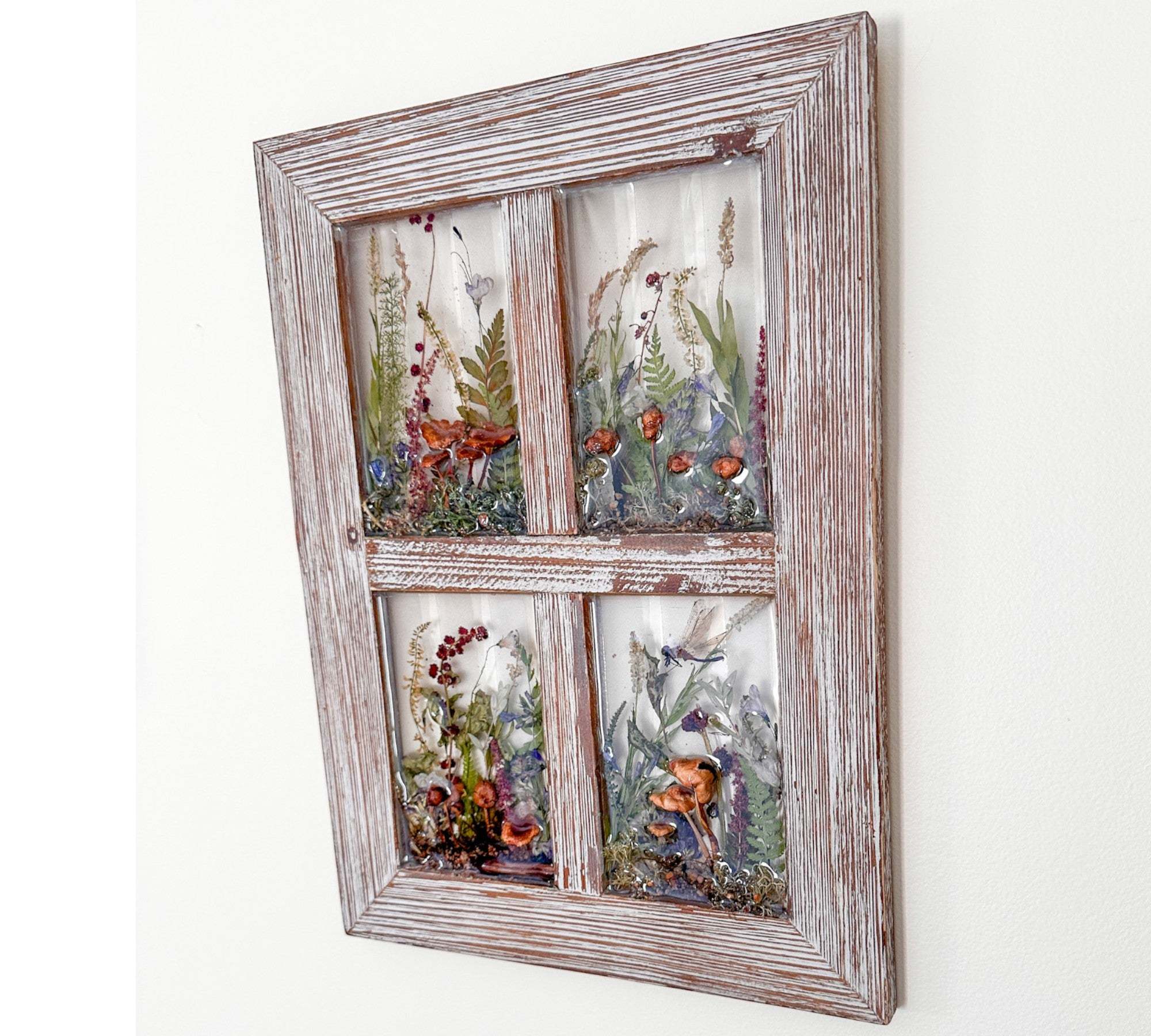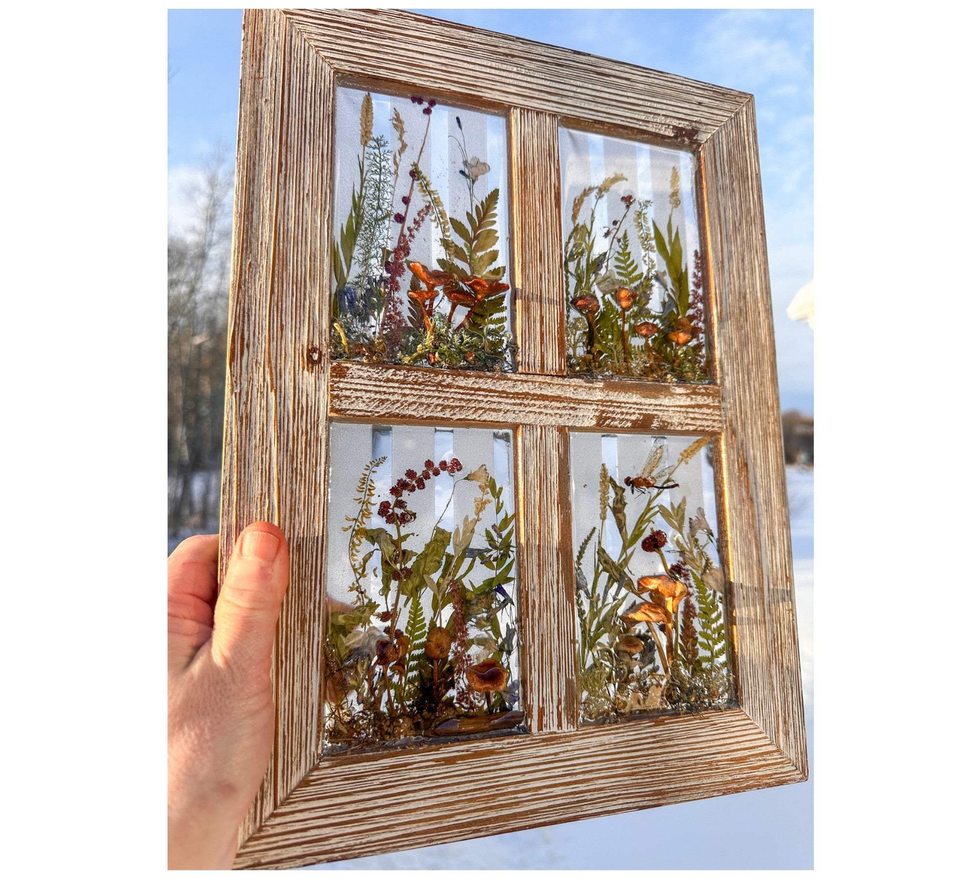 Each window is a labor of time and patience. Every botanical was gathered by hand and dried over the peak summer months to preserve its vibrant color. The four panes are created using a specialized two-layer resin pour, which gives the botanicals a lifelike 3D depth that shifts as you move past it.