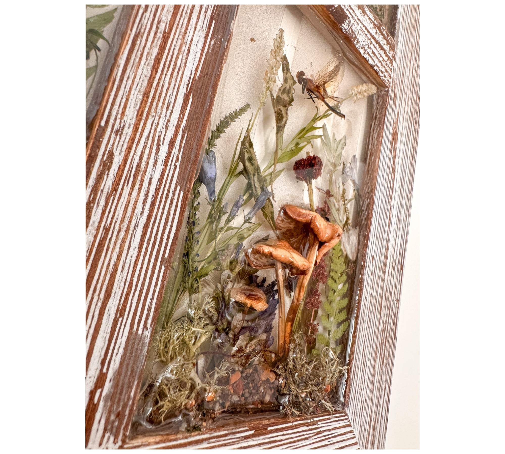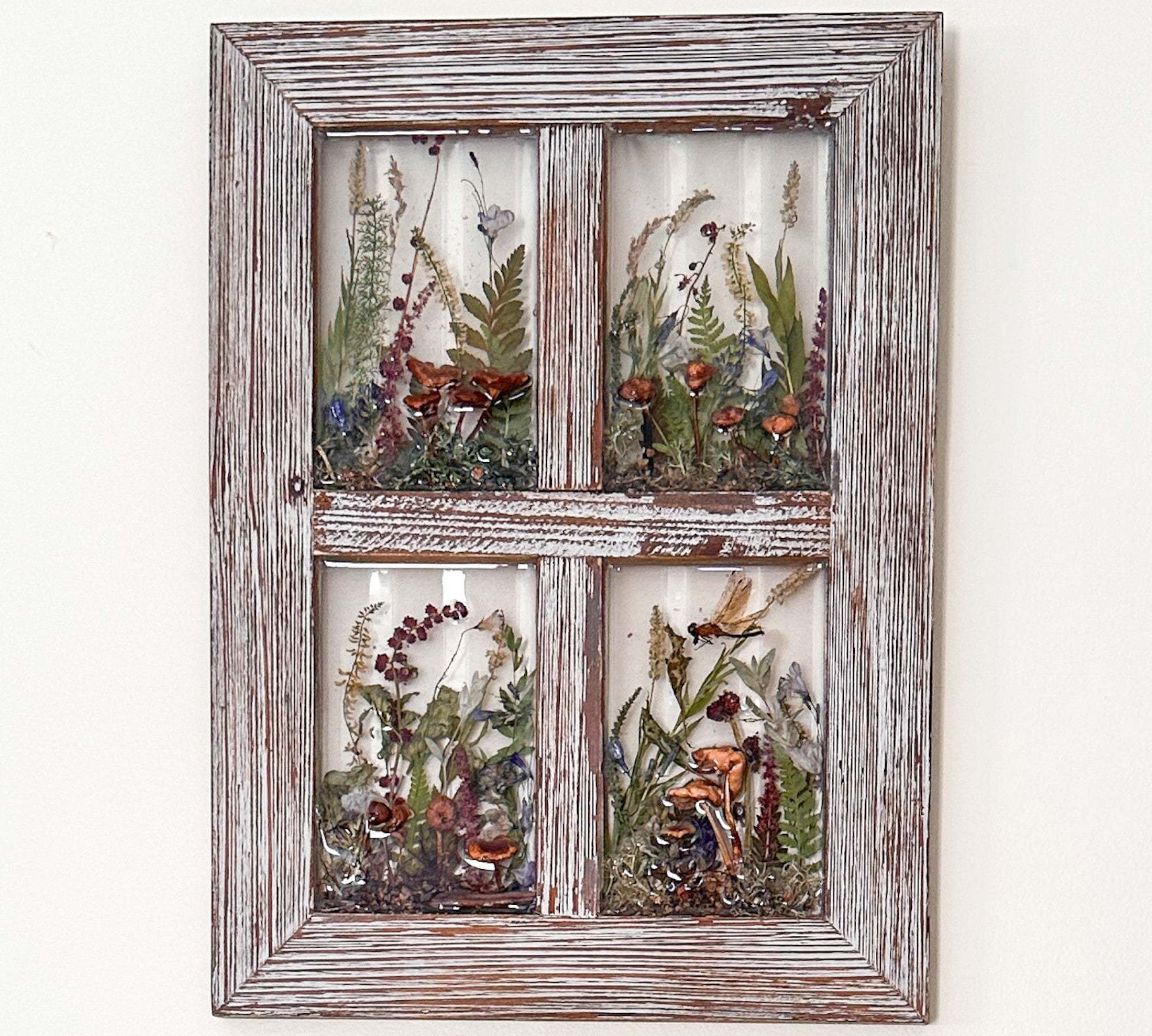 This 15" tall signature work of art features a natural wood frame with four distinct panes, each acting as a "looking glass" into a miniature, multi-dimensional ecosystem.