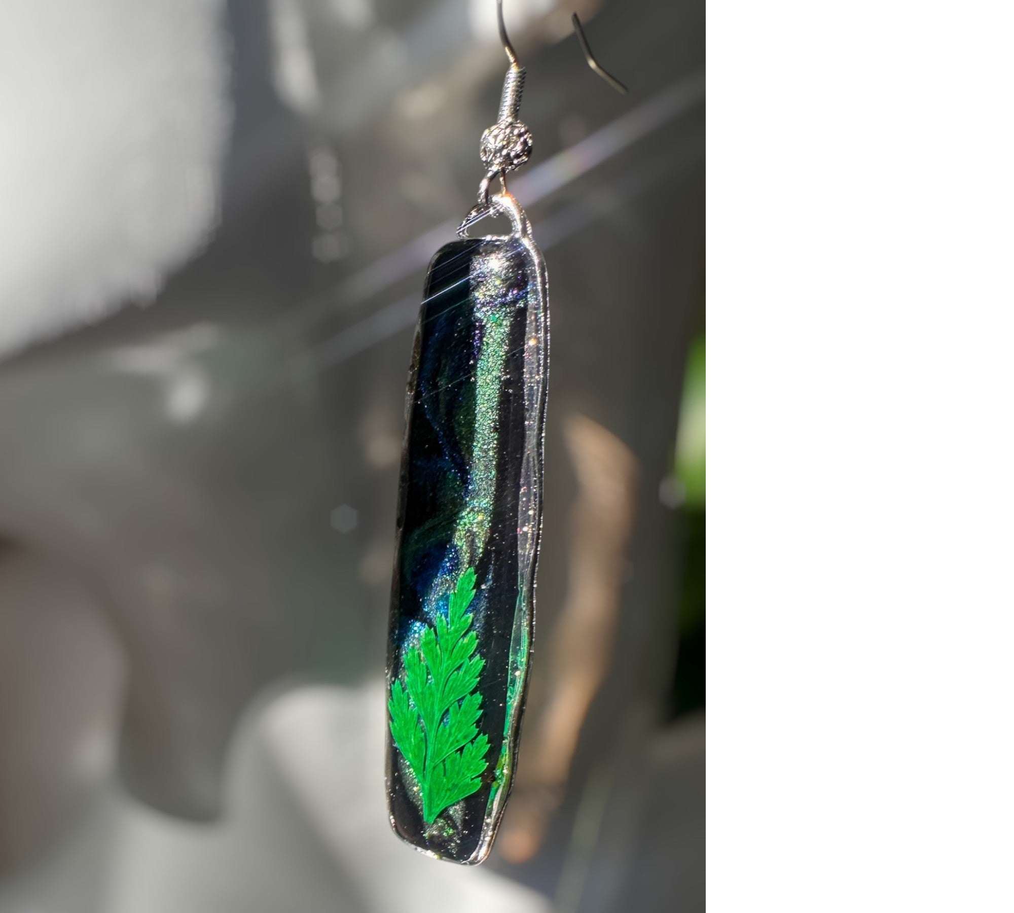 Long silver organic-edged earrings featuring a black and shimmering Northern Lights resin sky with a real green fern at the base.