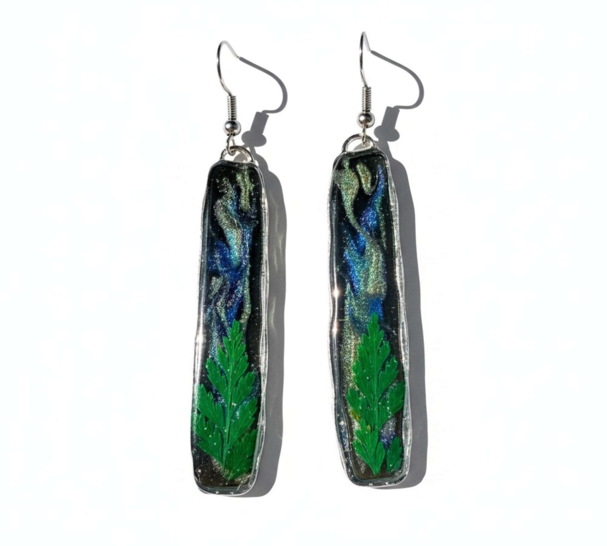 Carry the silent magic of the dancing winter skies with the Northern Lights Fern earrings, where a shimmering aurora glows over a tiny, hand-pressed forest floor.