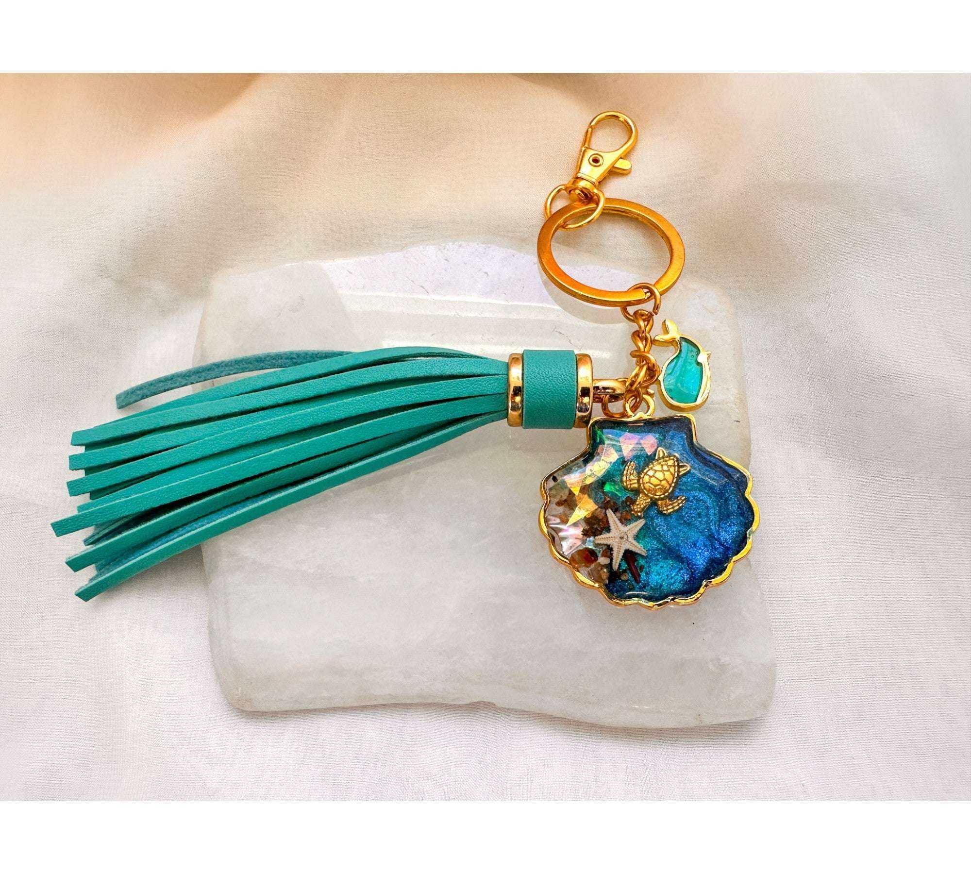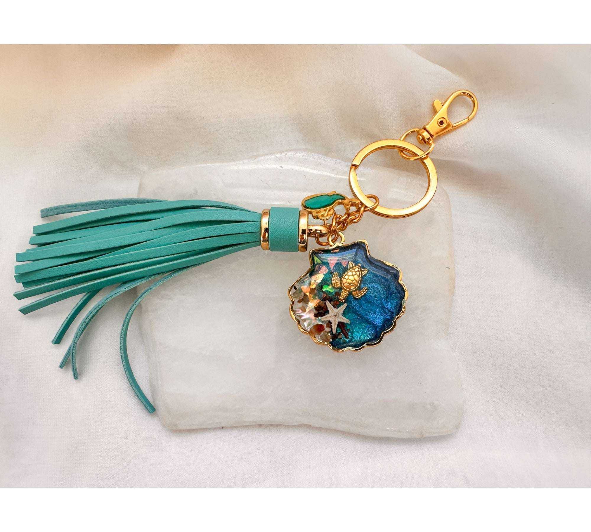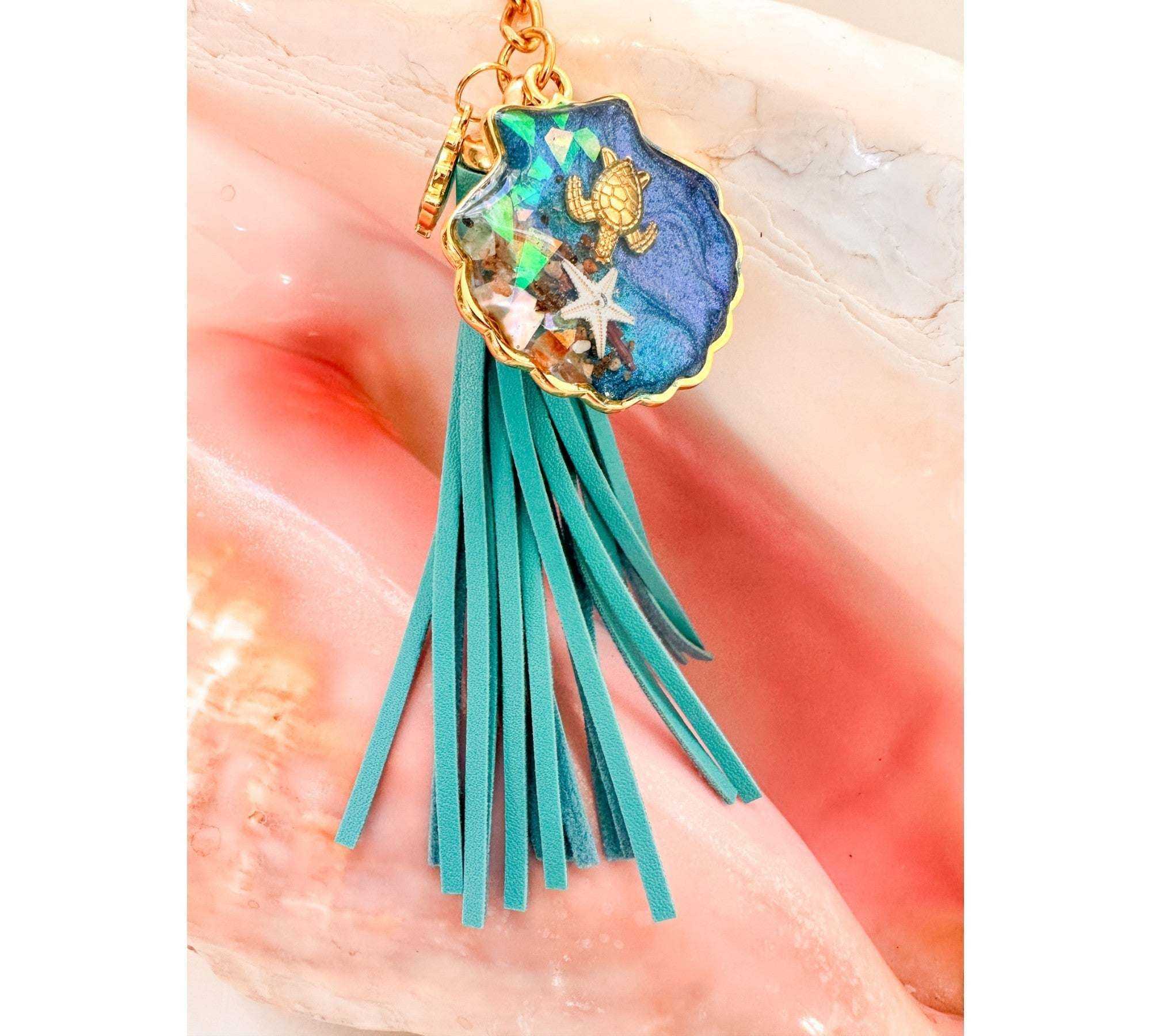 Ocean Shell Keychain with Leather Tassel -  Resin Sea Turtle Bag Charm