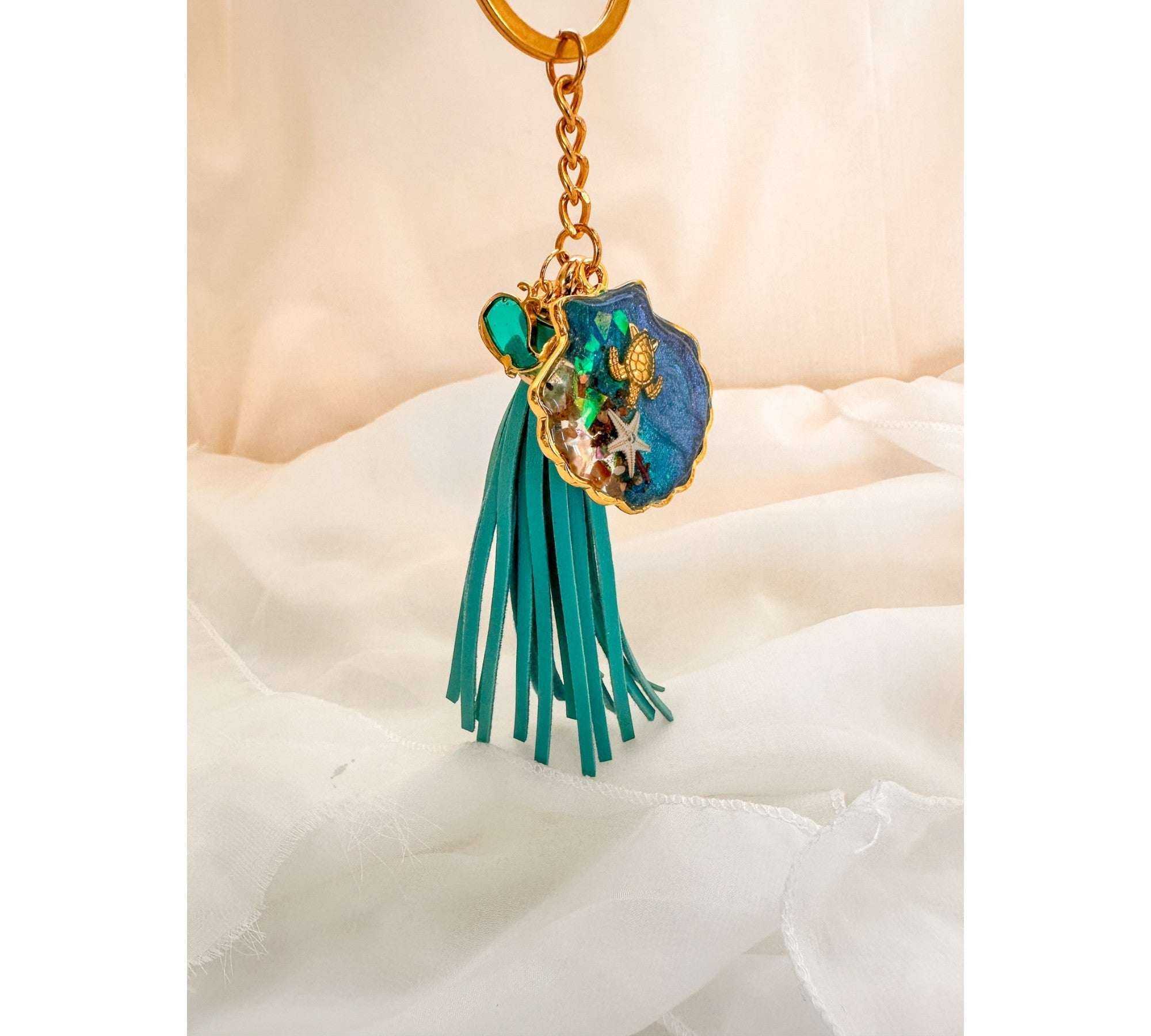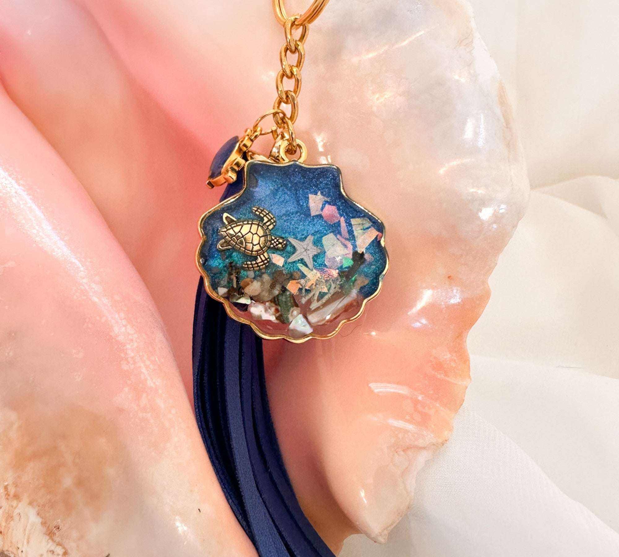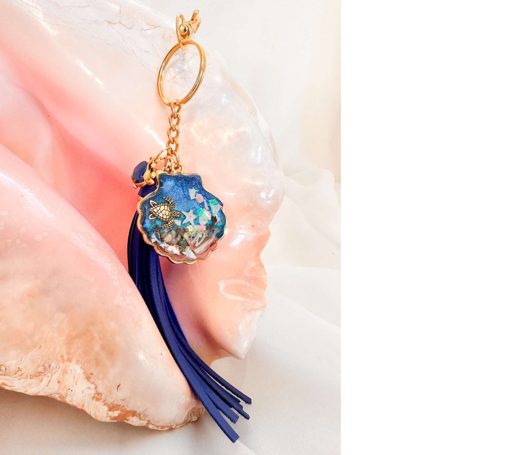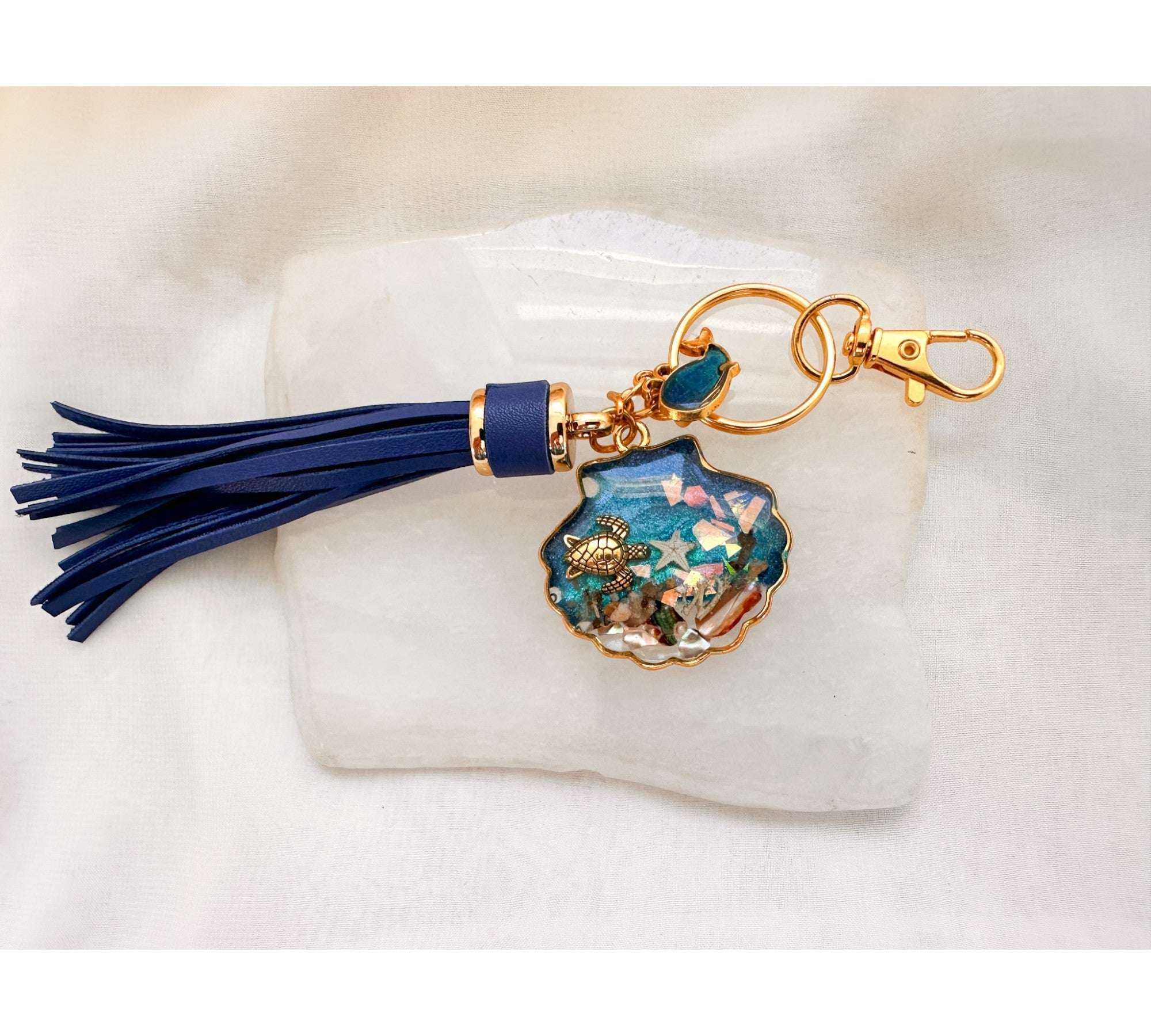 Ocean Shell Keychain with Leather Tassel -  Resin Sea Turtle Bag Charm