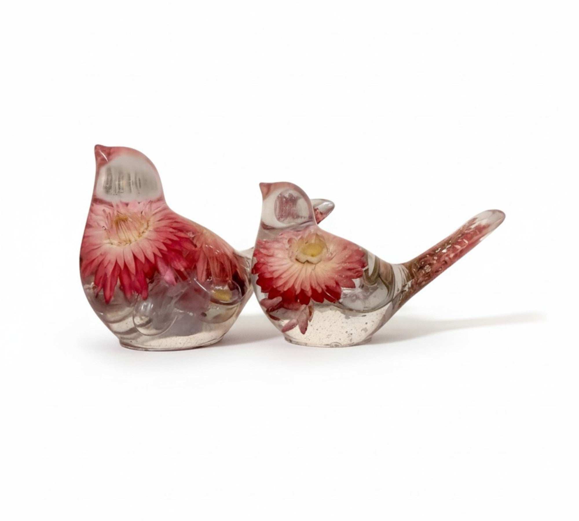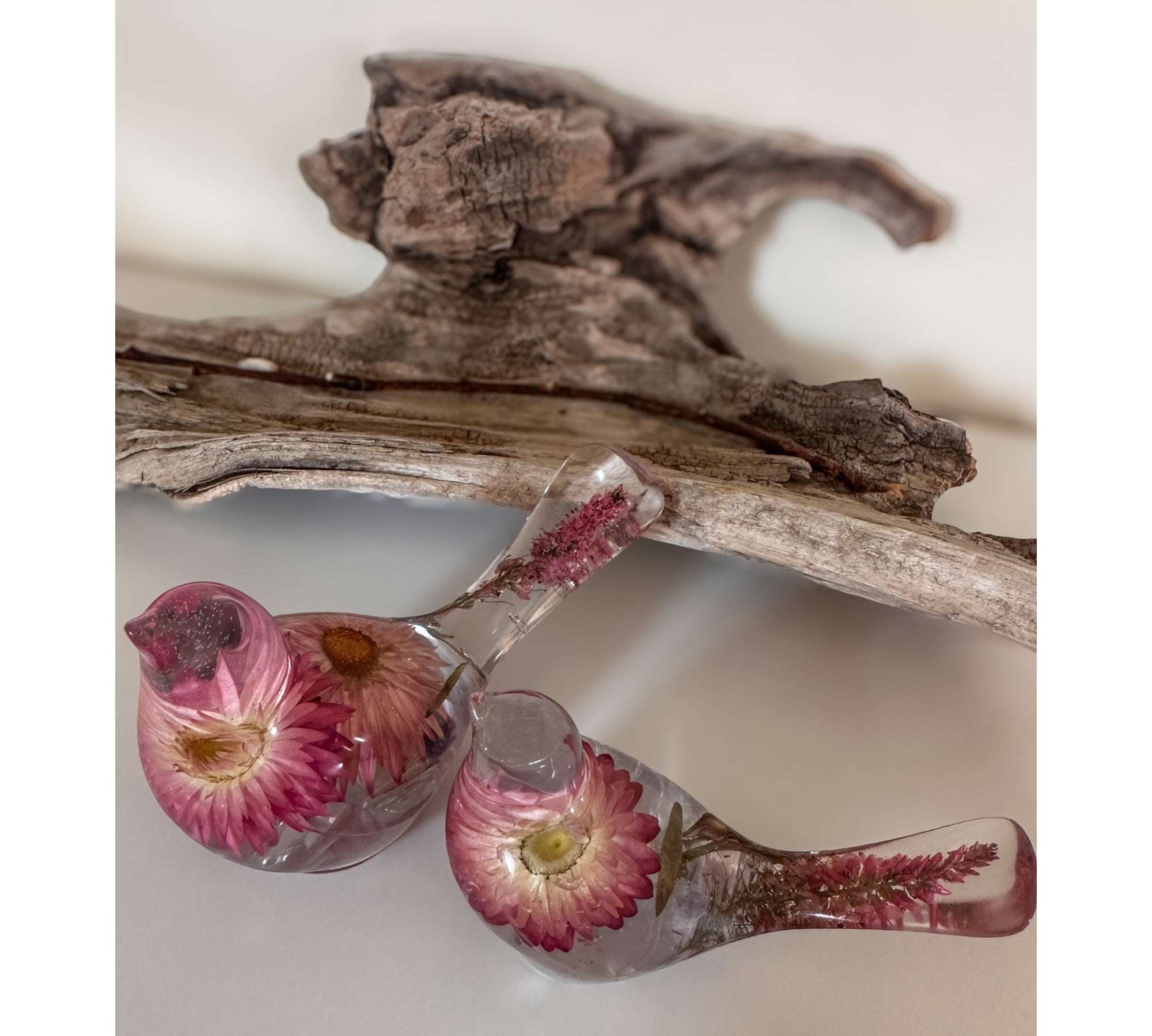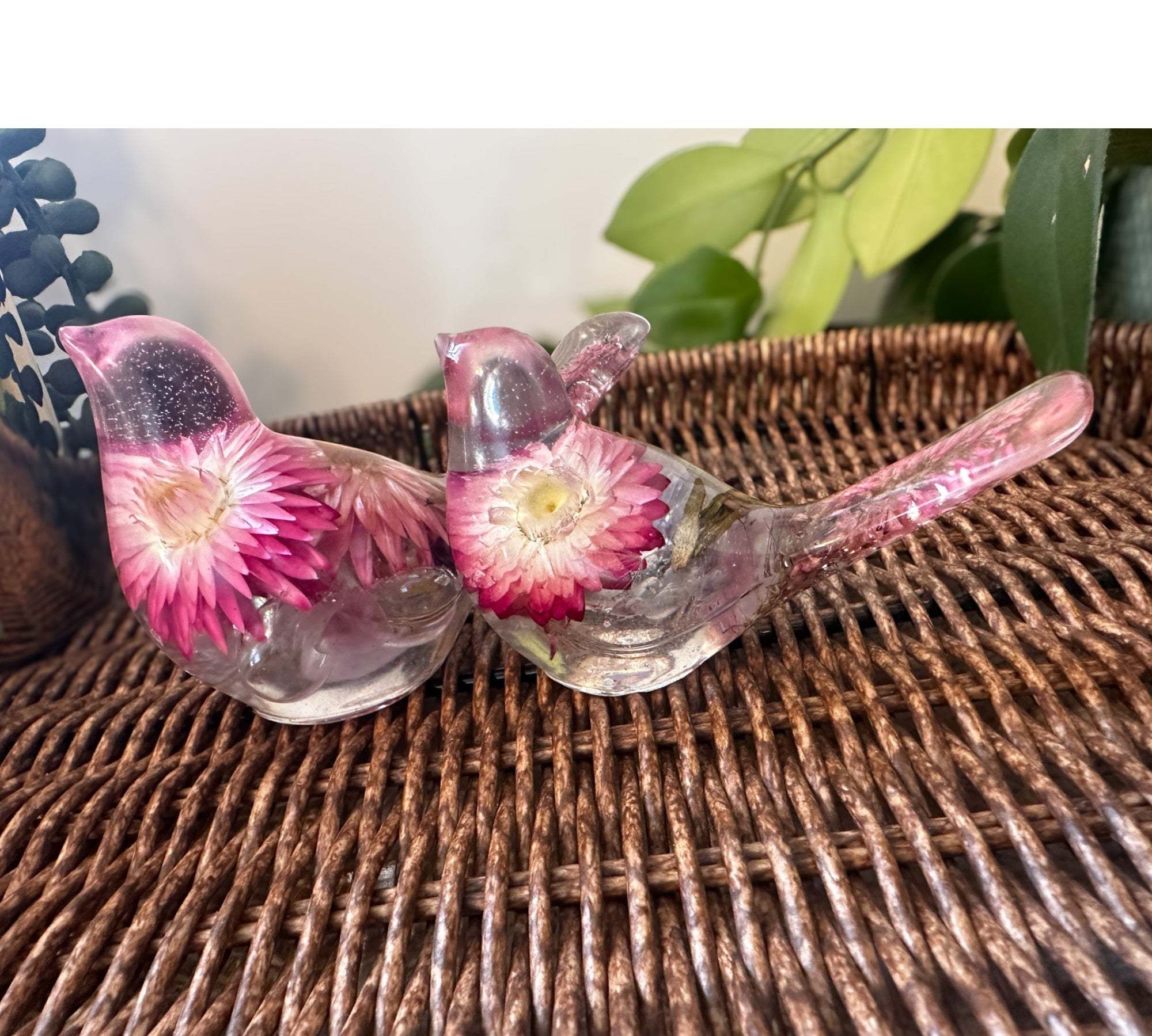 This pink strawflower resin bird pair was made for the person who loves beautiful things that also carry a little meaning.