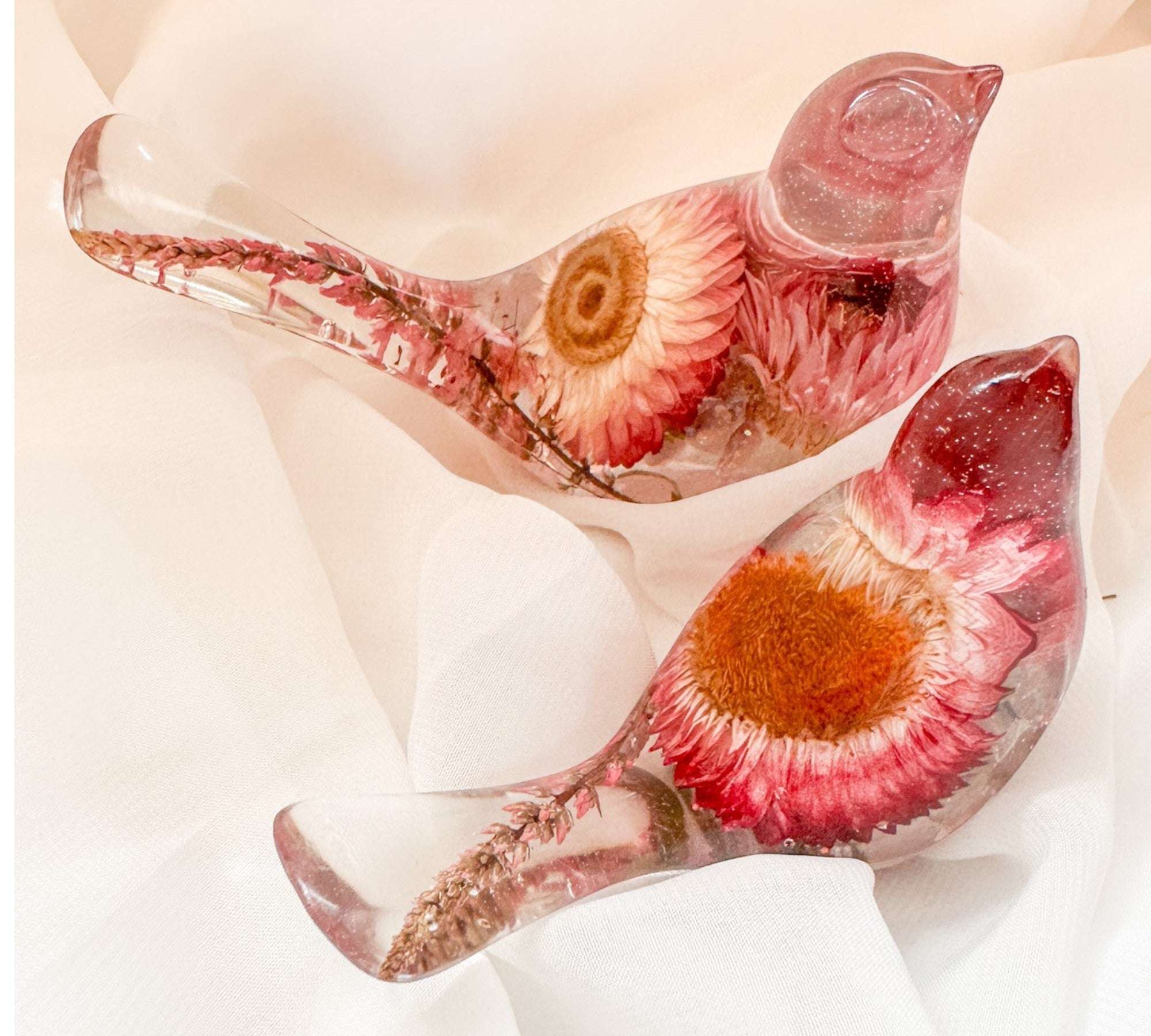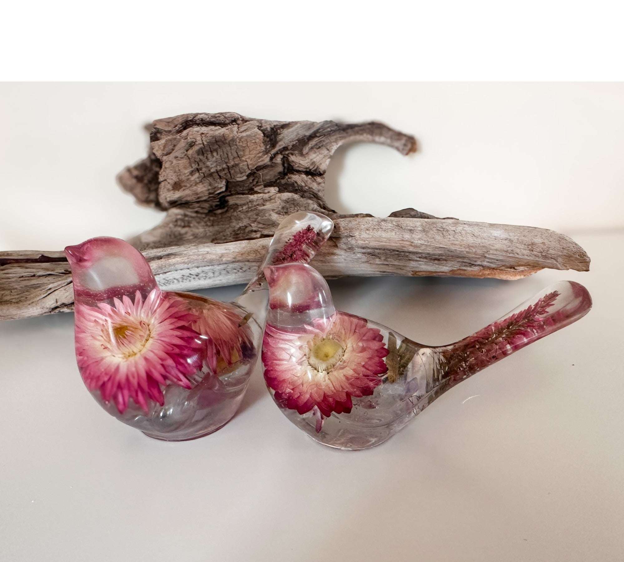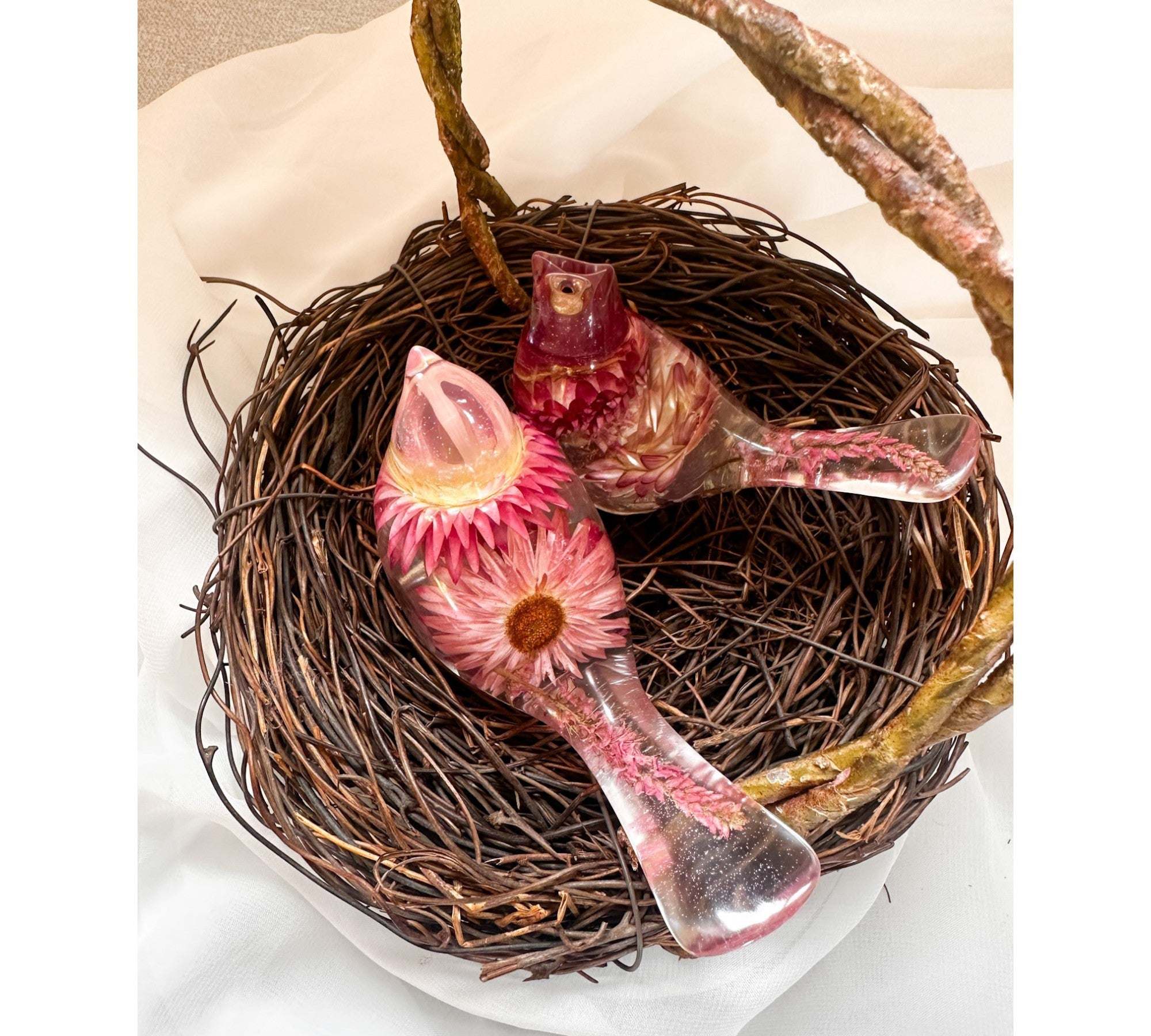 This pink strawflower resin bird pair was made for the person who loves beautiful things that also carry a little meaning.
