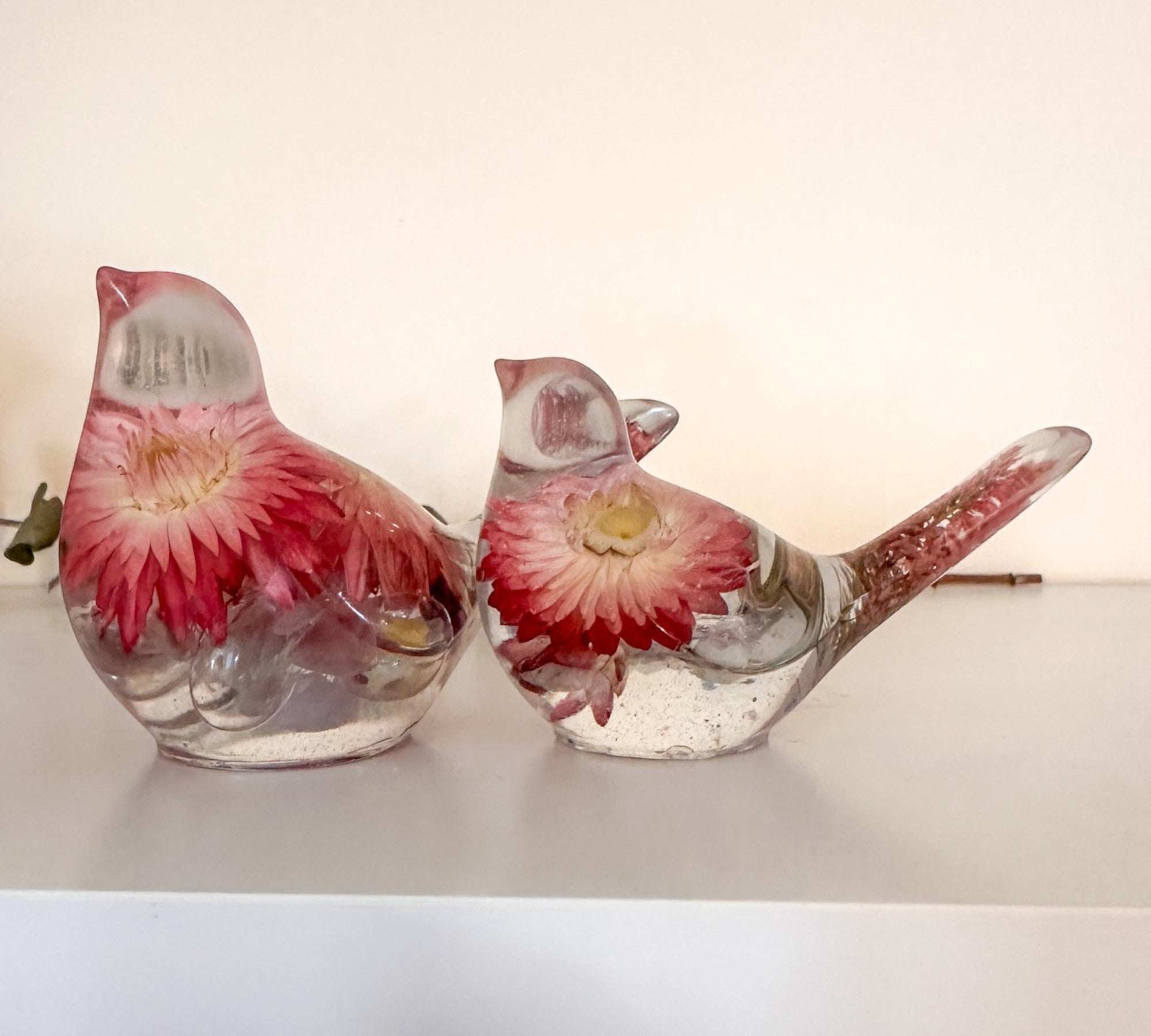 Both Pink Strawflower Resin Birds are filled with full pink strawflowers, its petals bold and saturated, glowing through clear hand-poured resin in deep rose and warm blush.