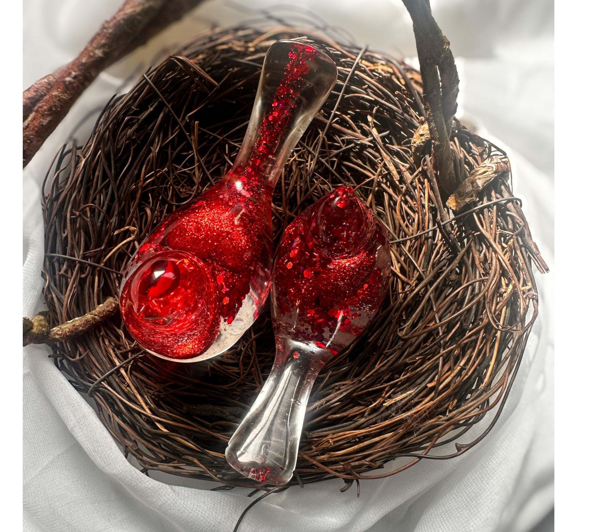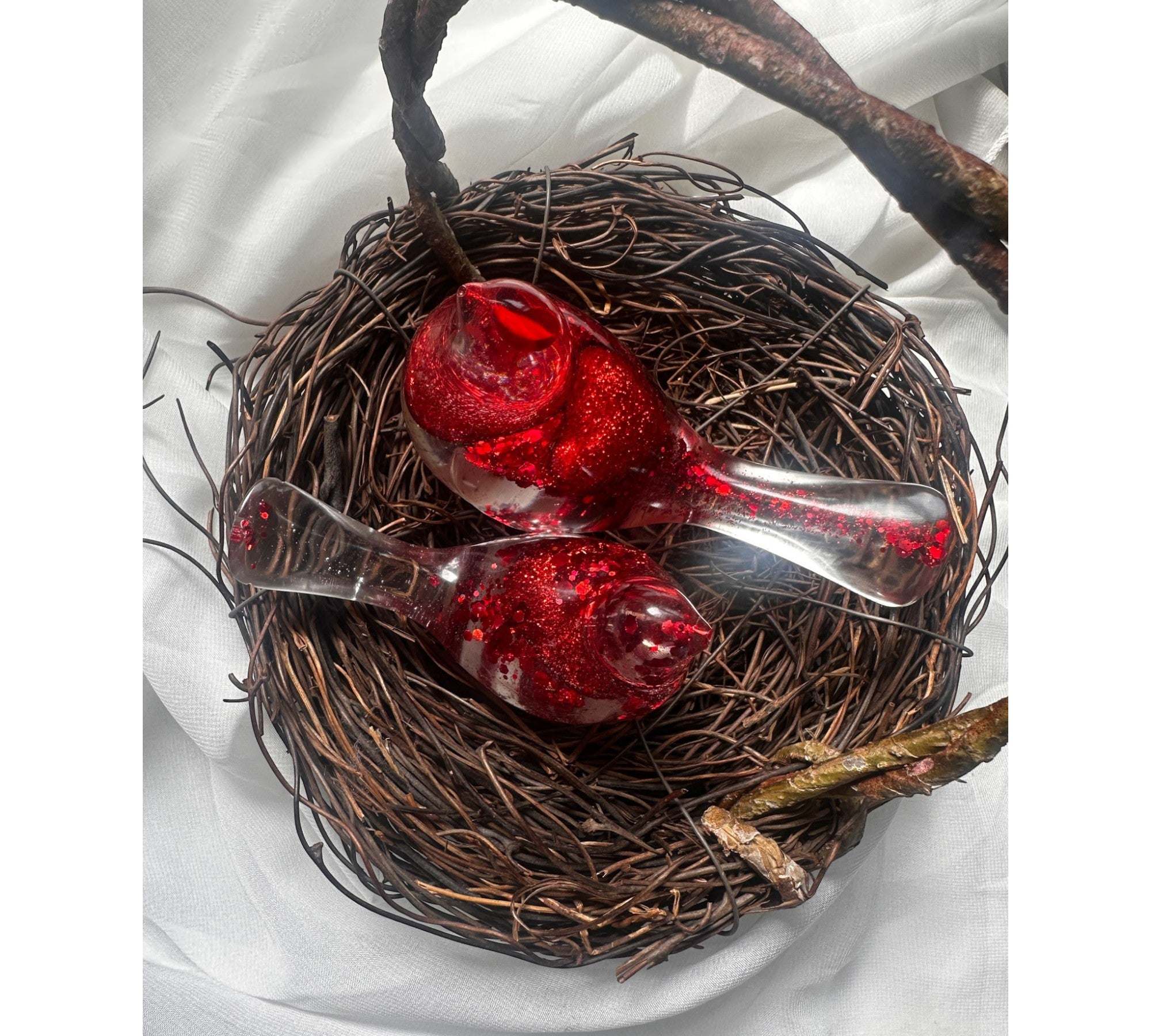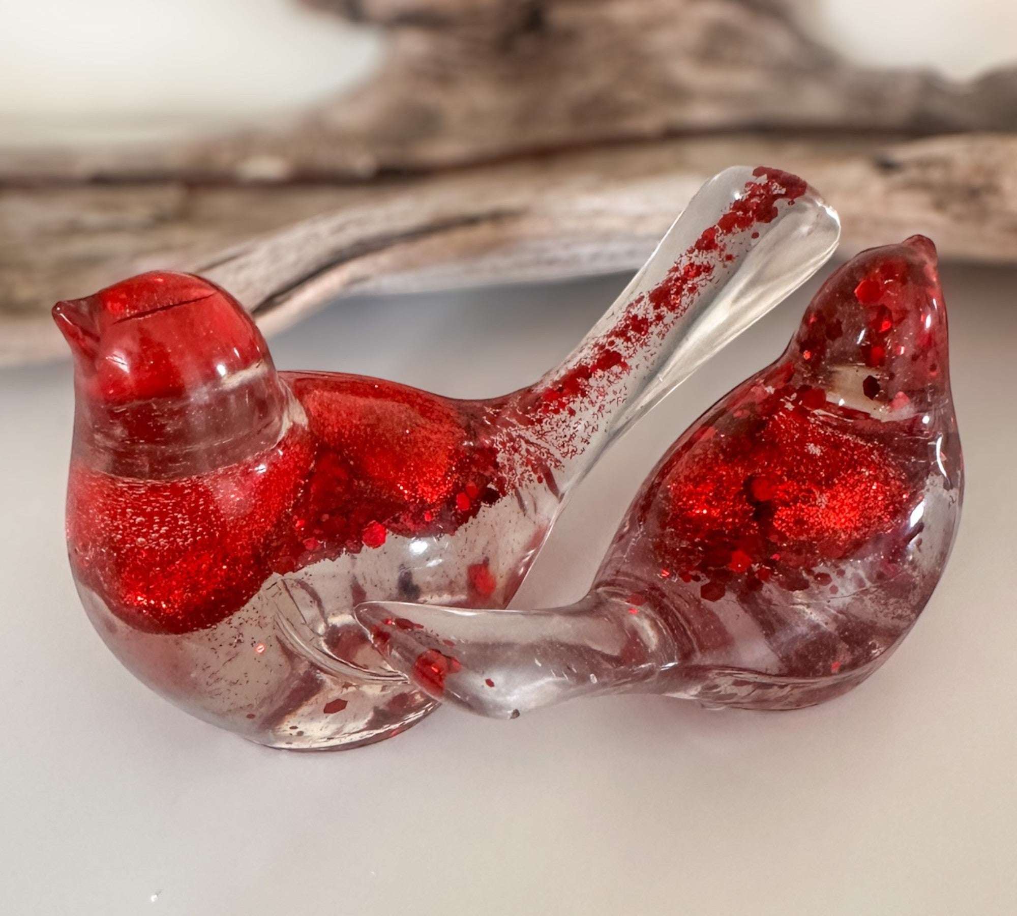 • Bold and Brilliant: Chunky red heart-shaped glitter and fine red shimmer are layered generously through every pour of this red glitter resin bird pair, catching light from every direction