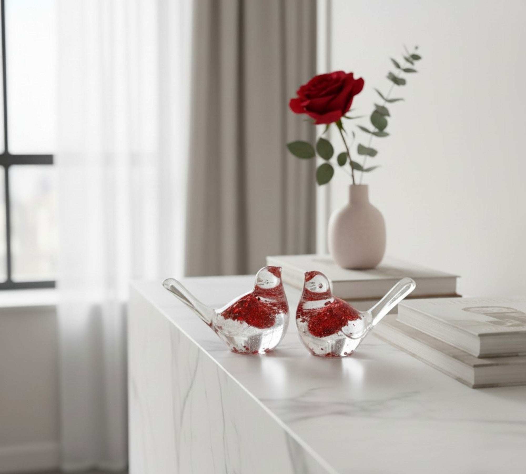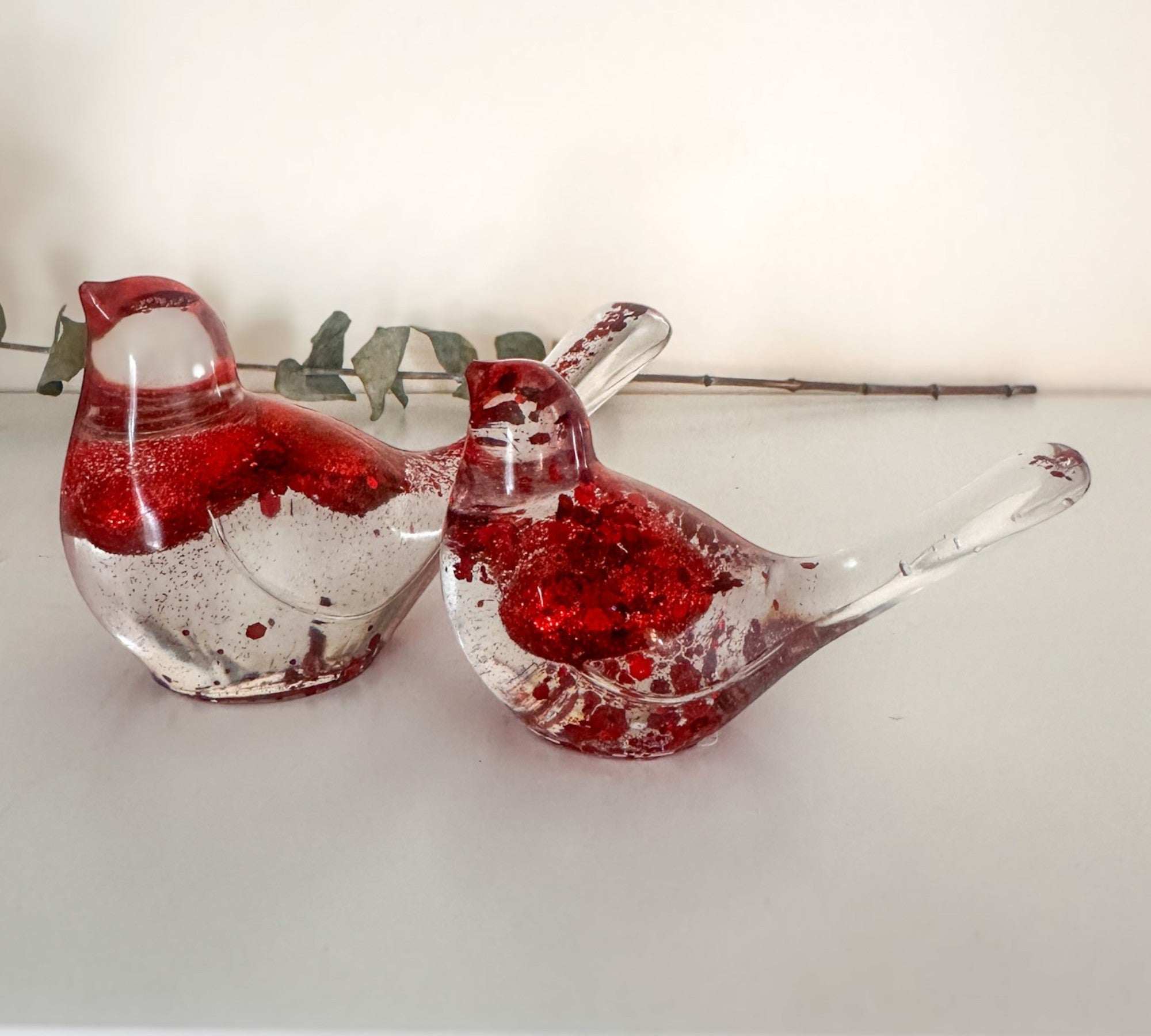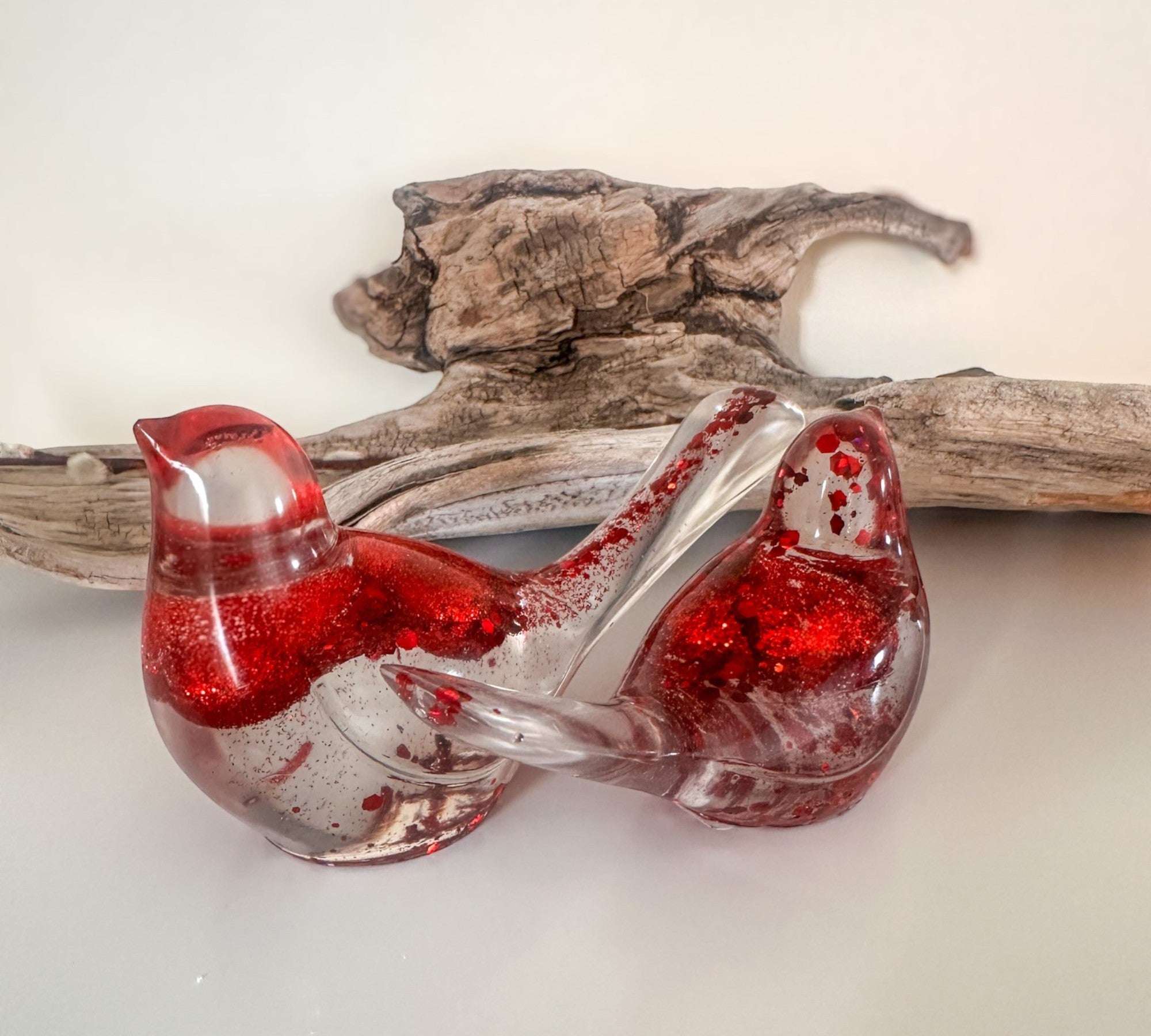 The Red Glitter Resin Bird Pair is exactly that. Two clear hand-poured resin birds, each filled with chunky red heart-shaped glitter and a generous scatter of fine red shimmer that catches every angle of light like a firework frozen mid-burst.