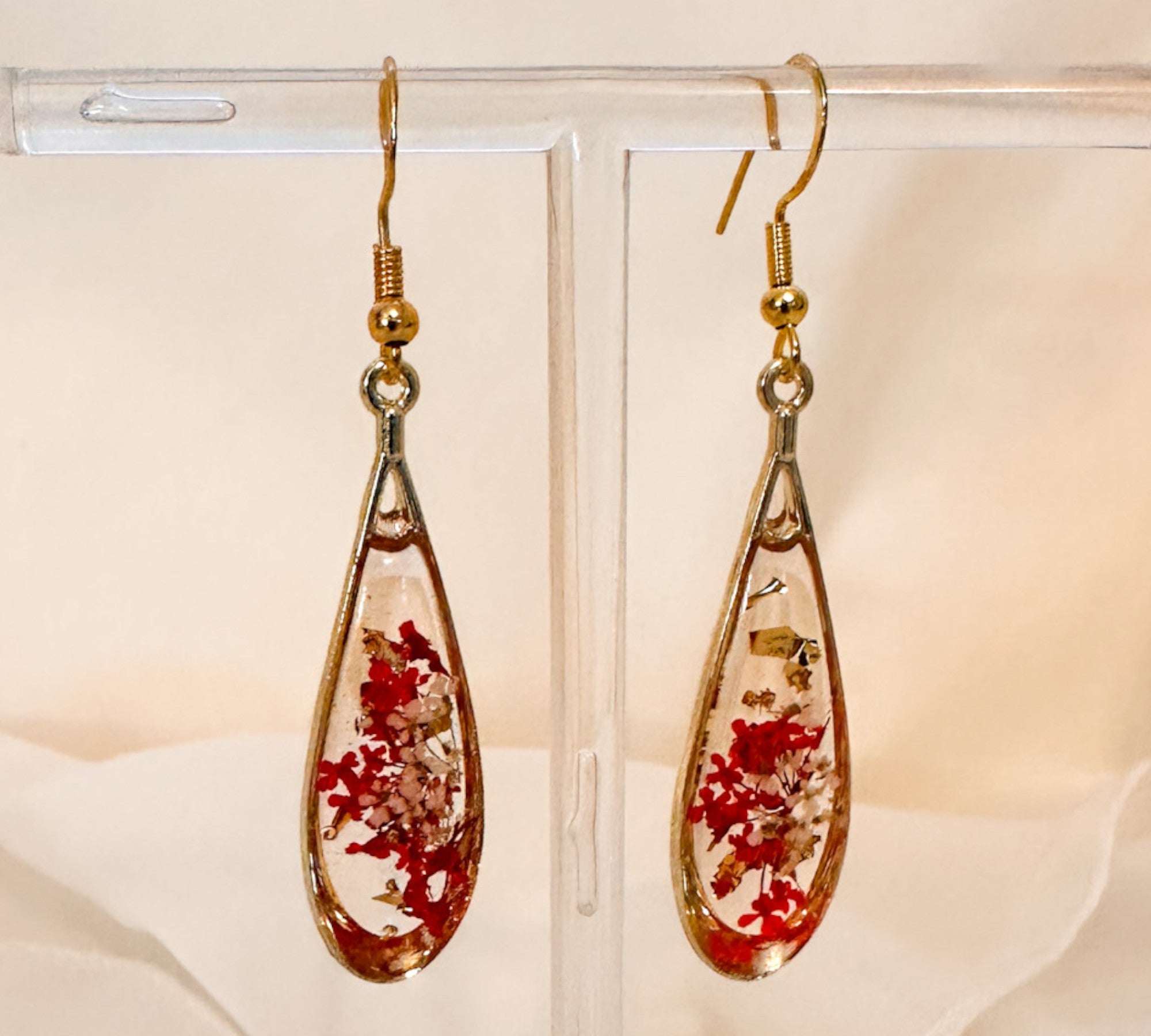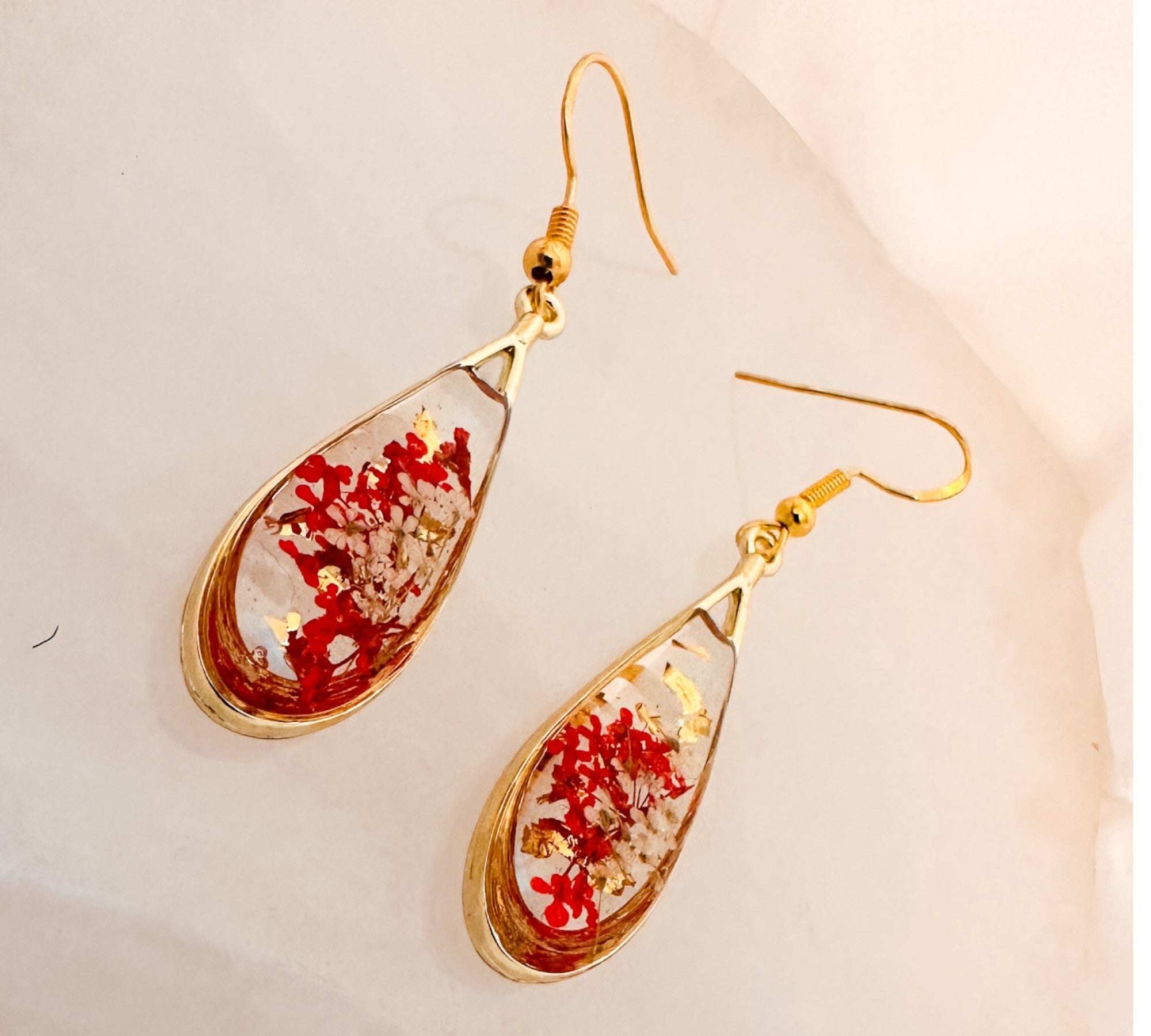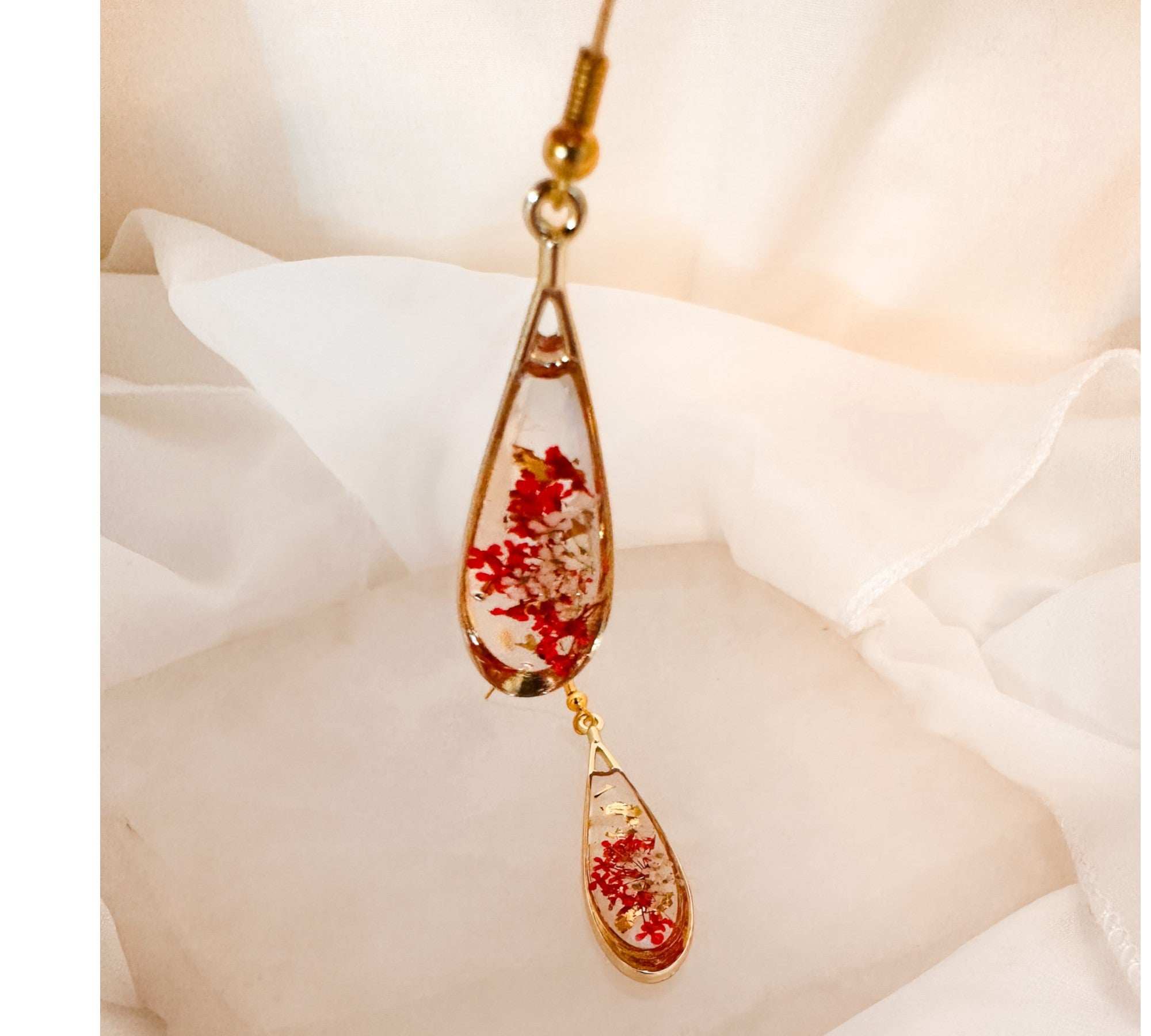 Scarlet Meadow Drop Earrings - Handmade Gold Earrings & Dried Flowers