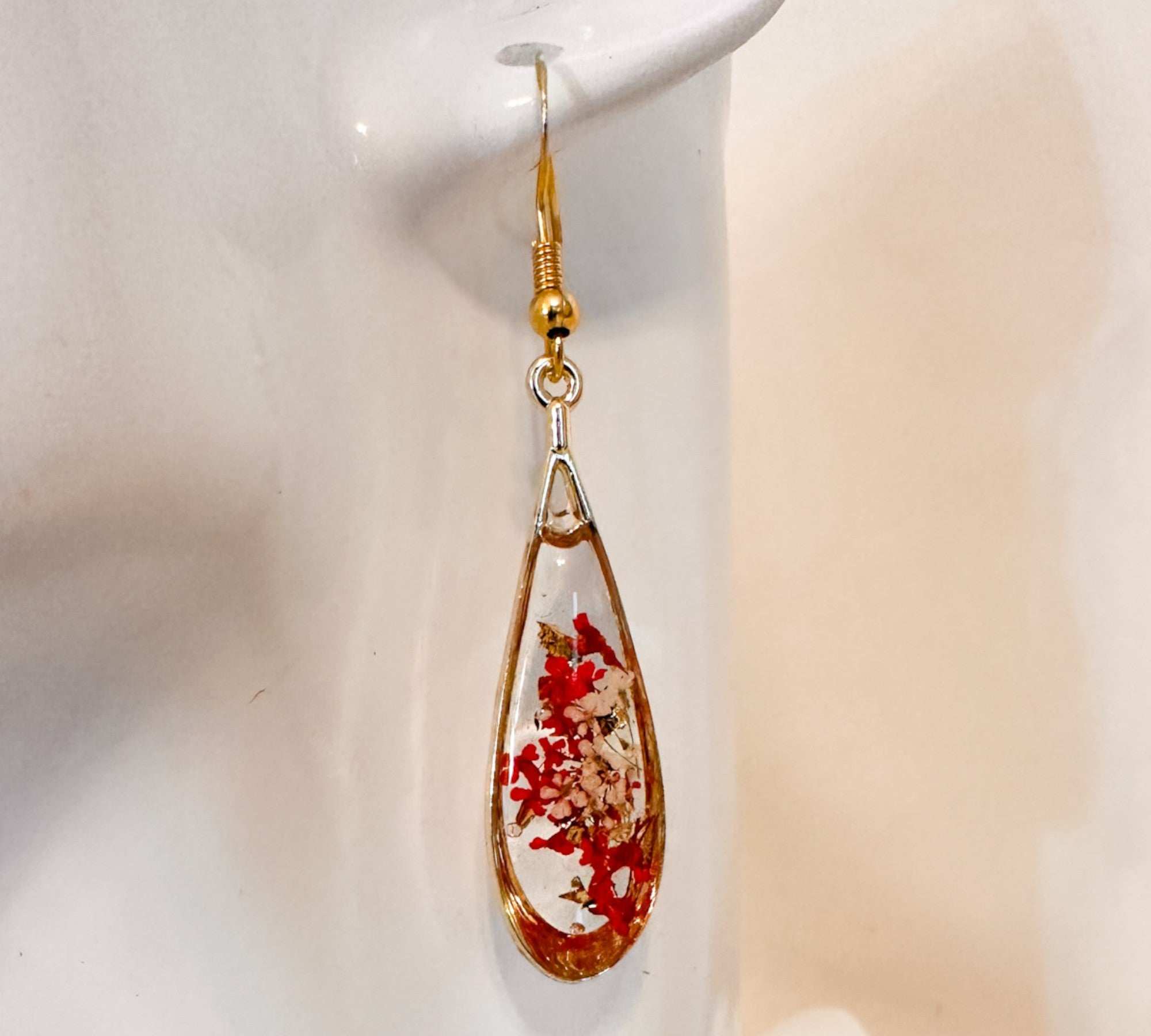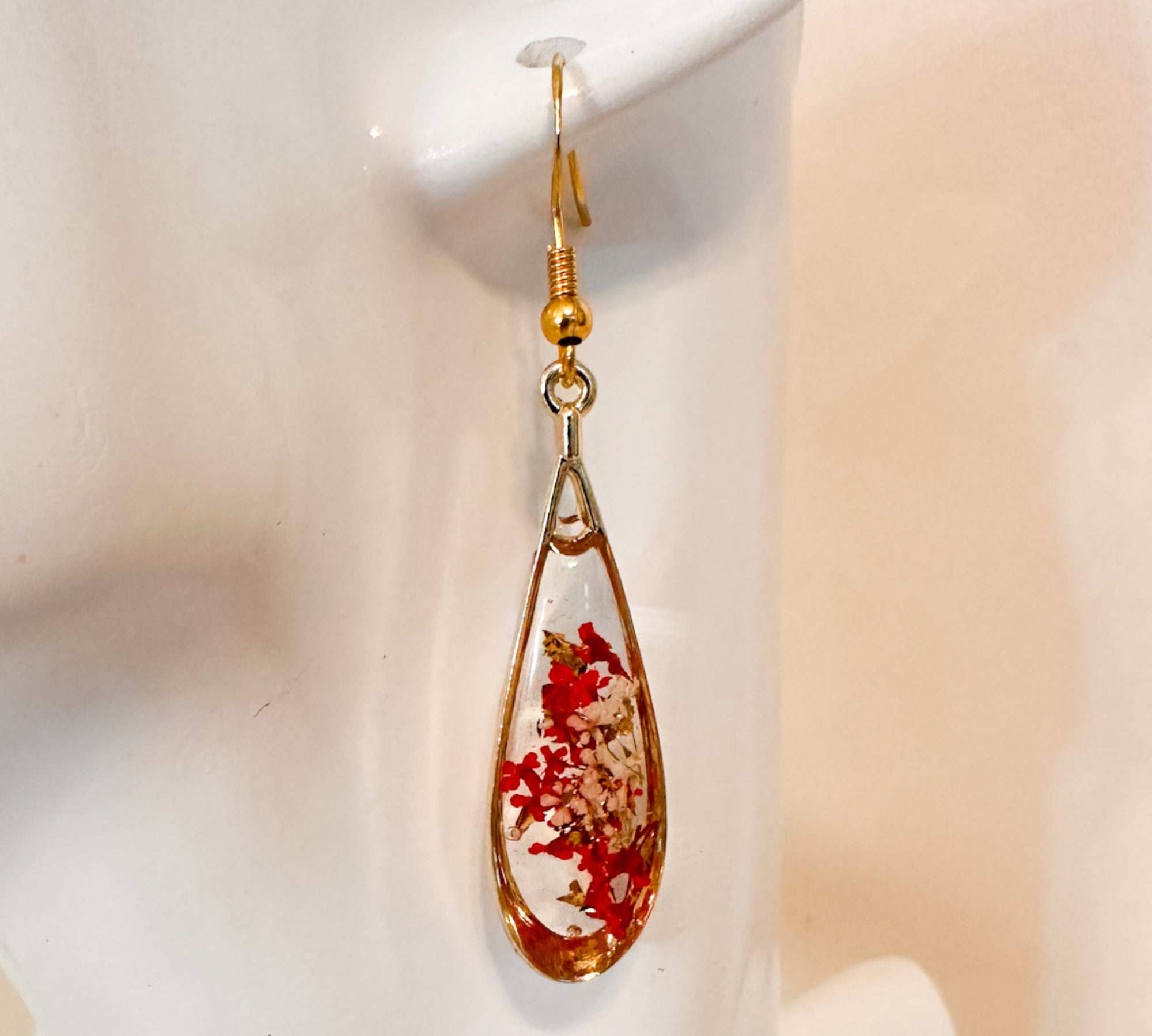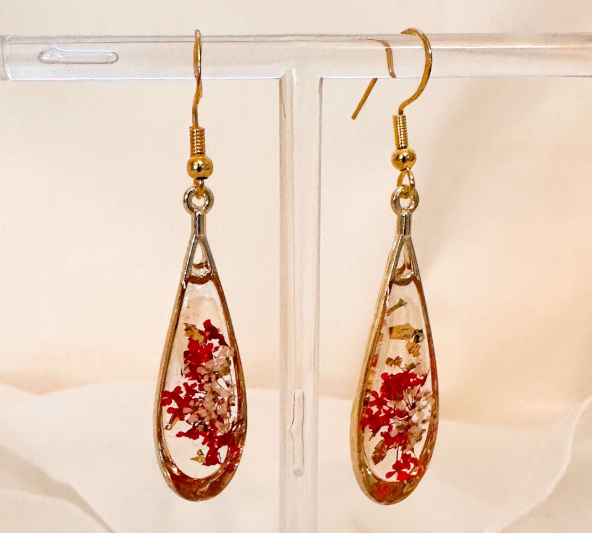 Scarlet Meadow Drop Earrings - Handmade Gold Earrings & Dried Flowers
